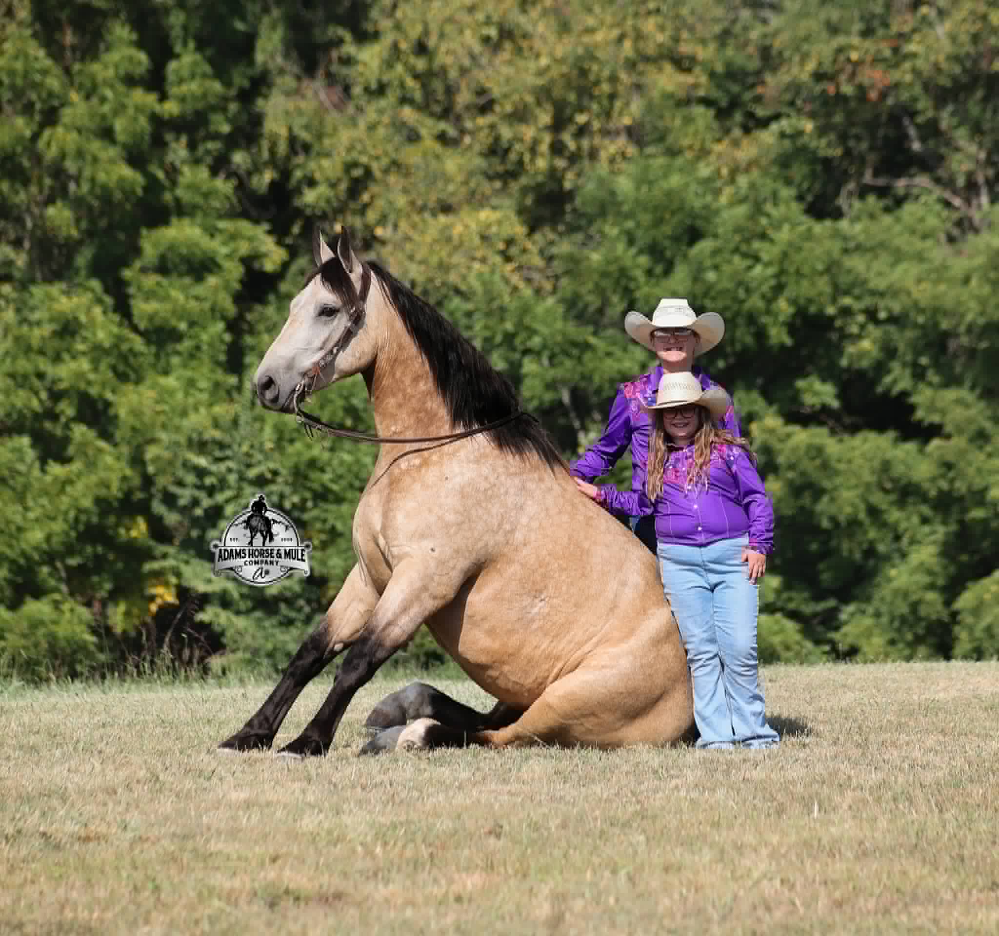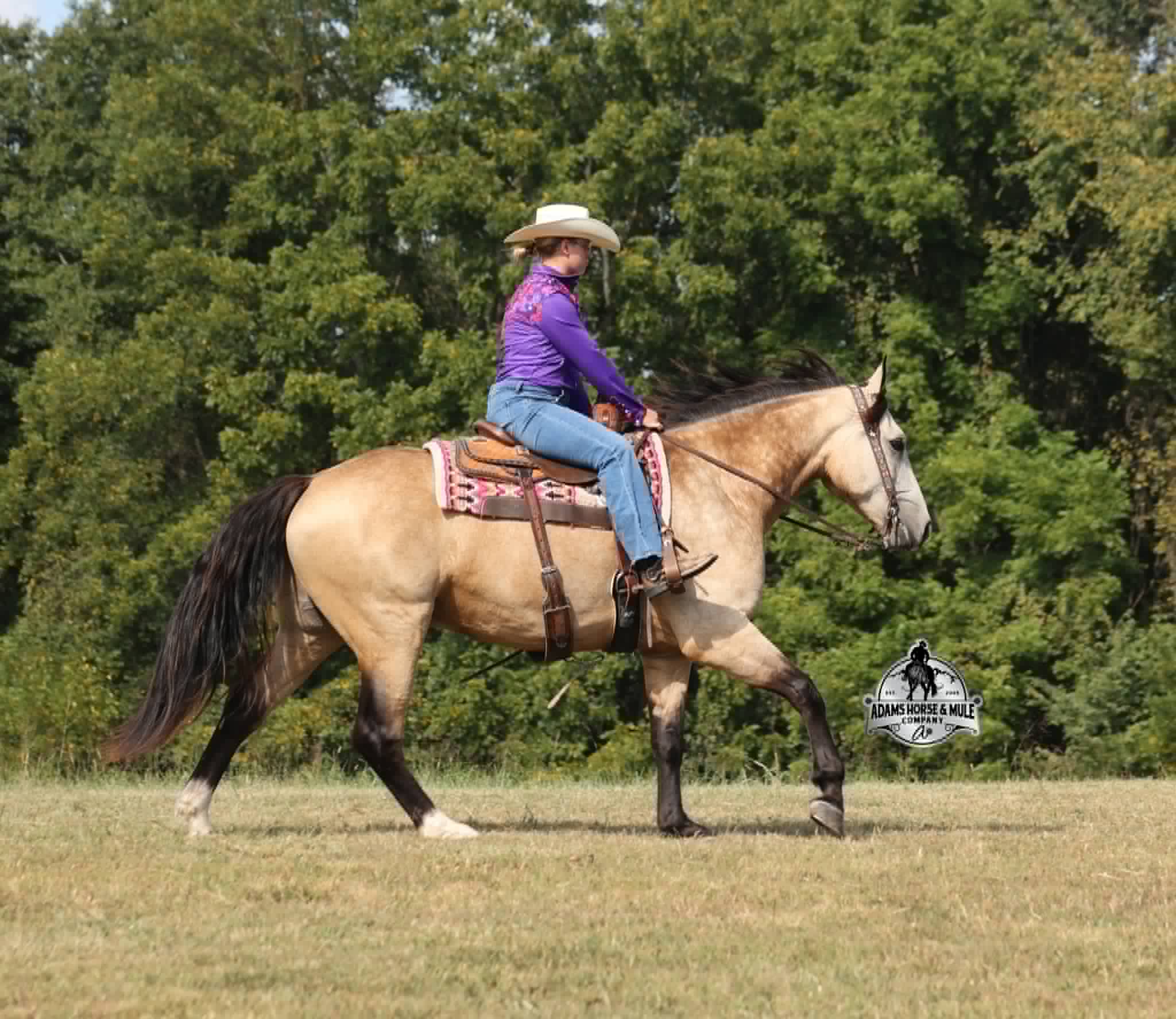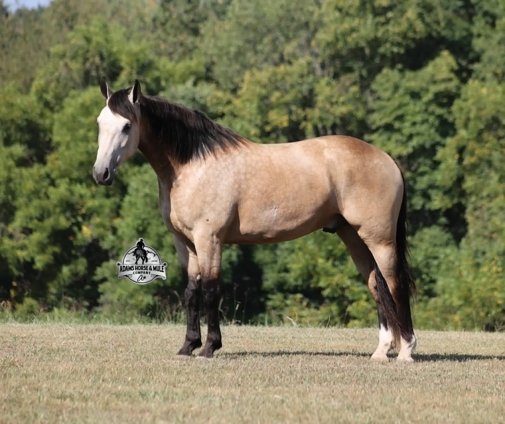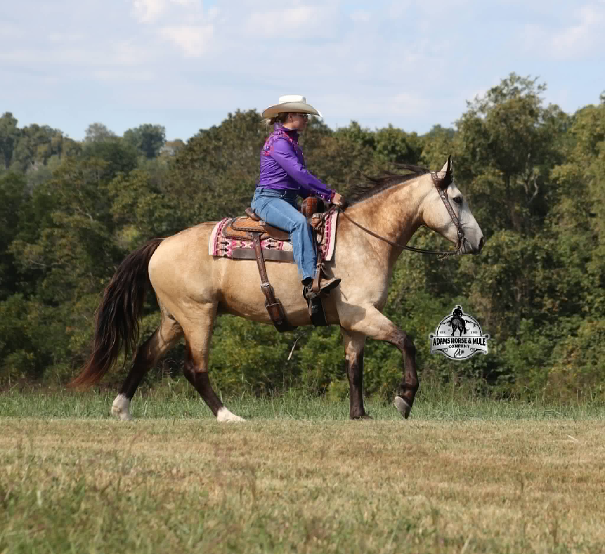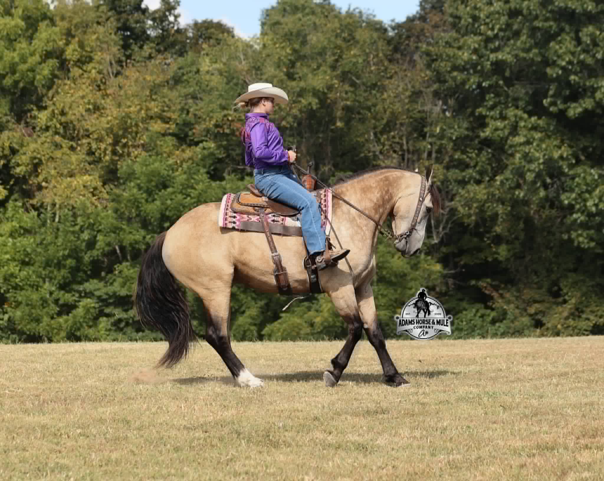 Cody is as royal and cool as any horse that you will see! He is a beautiful bay draftcross that stands a little over 16hh that will weigh around 1400lbs and he is a 5 years old. Cody has that eye appeal but the best part about him in deeper than the eye can see. Cody is everyone’s best friend as he loves attention and is very calm natured. He is out of the same breeding program as several other top draftcross geldings that we have had over the last 5 years and every one of them has the right mind with the calm nature that makes them great family horses. Cody has been through the natural horsemanship program and knows some tricks such as to lay down and set on him rump. Cody has been ridden by every member of our family all the way down to our 7 year old daughter. He has been ridden down the highways and he is traffic safe as well. Cody is great on trails and he will cross creeks, ditches, logs and navigate rough rocky areas. He has a smooth jog, a VERY VERY nice easy to set lope and a good stop! He neckreins around and backs with ease. He has been exposed to all kinds of wildlife such as deer or turkey or other animals like cows or dogs and will go anywhere that he is asked too. He has been ridden many miles in the mountains of Eastern Kentucky and encountered every obstacle possible on the trail. He will go up or down even the steepest slopes, across deep creeks, over downed trees, and over all types of rough terrain while still being sure footed. Cody is not cinchy, cold backed, does not crib or weave. In addition to riding, Cody has also been worked in farm machinery as well. Cody is a rare find that anyone is lucky to have!!! Feel free to call Eric with Adams Horse & Mule Co. 606-308-2461 with any questions.