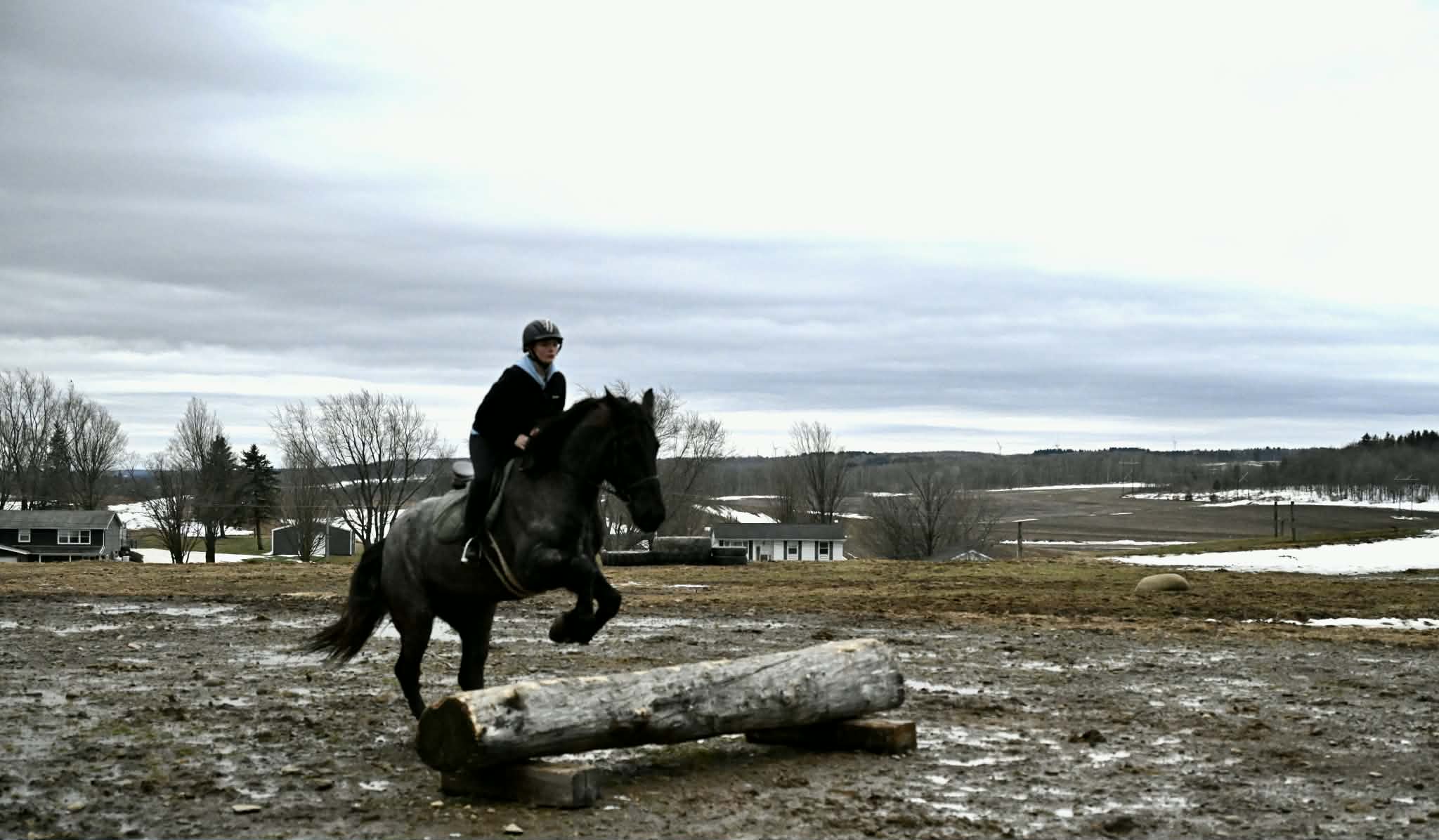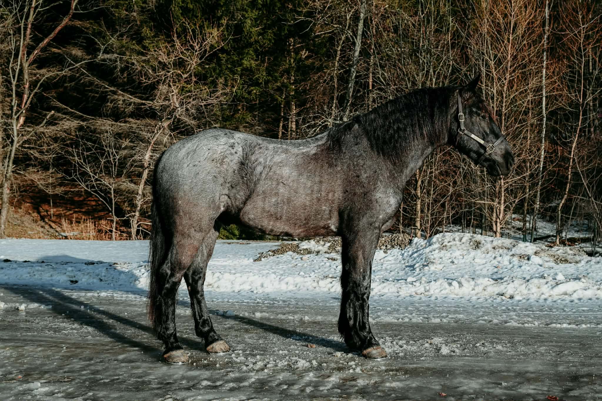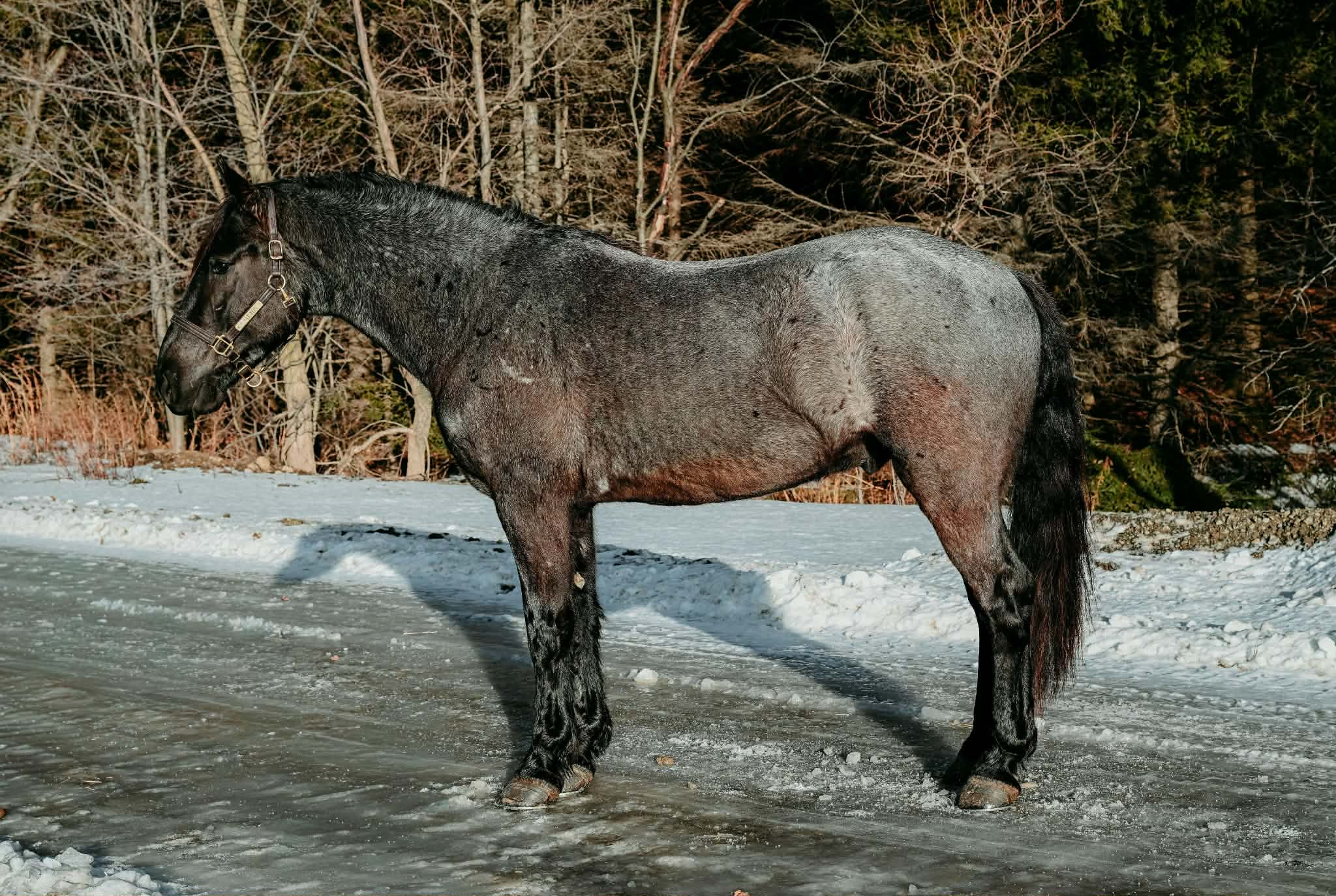 Introducing Valentino, with his beautiful blue roan coat, graceful movements, and confident demeanor, he is about as pretty as they come. This Friesian Sporthorse is 4-years-old, standing at 16.2HH. He has a kind temperament, is level-headed, confident, brave, and has the sweetest eye. Valentino is always ready to go to work. He has been on miles of trail rides through the creeks in the thickest parts of the woods and never refuses. He will trail ride alone or in a group, and cross any water, bridges, or obstacles you may encounter. Livestock such as cows, dogs, sheep, and goats, don’t bother him; he will make friends with them all. He loads excellent and will stand patiently tied all day. Absolutely zero maintenance with him. He stands to be clipped, bathed, and for the farrier and vet. His ground manners are impeccable. He is not a picky eater; he stalls well but is just as happy in the pasture with mares and geldings. He has exceptionally smooth gaits, great transitions, side passes, and backs up. He rides great in the arena. He is very responsive to leg cues, seat, and voice. Valentino will ride on the bit or with a loose rein; he will even ride with just a neck rope. He has excellent stop, is very soft, and is responsive. Valentino also drives! He drives single and is easy to hook. He is traffic-safe. This horse has the talent to excel at anything you want to do. Put him in a show ring one day and trail ride the next; he is that type of horse. Valentino is a 100% safe and sound. Contact Dayton at 585-734-0169 to discuss Valentino and see if he is a good fit for you. Visit our website Wolcotts horses and training and follow us on Facebook!