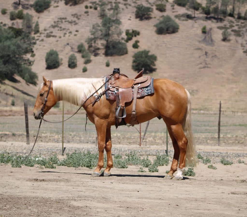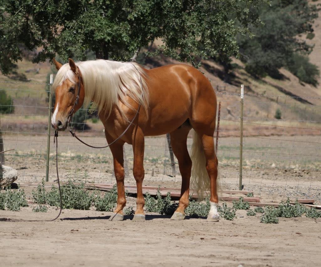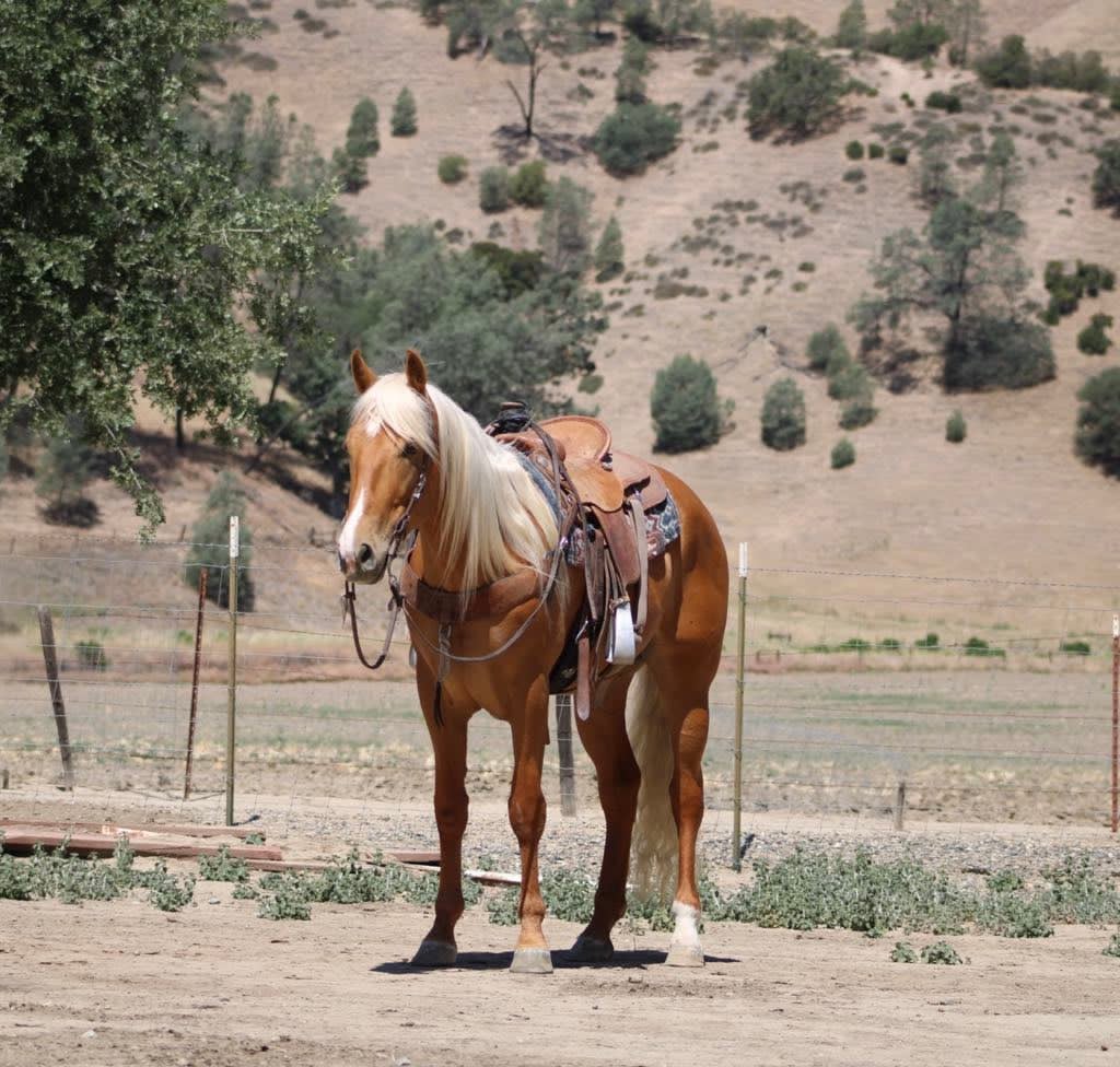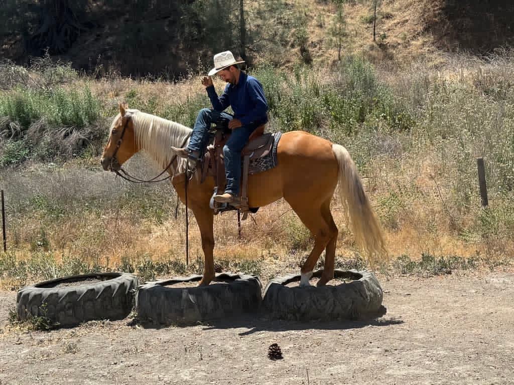 Meet 24-Carrot This golden palomino is a real head-turner, capturing everyone’s attention with his radiant beauty. Picture this: a magnificent horse with a long, flowing mane and tail that shimmer in the sunlight. Standing at 16 hands tall, he’s like a living, breathing work of art. And despite being just 5 years old, he carries himself with the calm and gentle spirit you’d expect from a much older horse. He’s got this adorable puppy-dog personality that just melts your heart. I swear, if he could, he’d be right there snuggling with you on the couch! Riding 24-Carrot is an absolute dream. He transitions between walk, trot, and canter so smoothly and gracefully. He’s got a lovely headset, responds beautifully to leg cues, and stops and backs with ease. You can tell he’s been trained for a variety of disciplines. But don’t let his good looks fool you – he’s incredibly versatile too! Whether he’s navigating tough trails or tackling obstacle courses, he approaches everything with the confidence of a seasoned pro. What really gets me about 24-Carrot are his kind, intelligent eyes. They say a lot about his personality. He stays calm even around busy roads, making him super safe for riders of all levels. He’s experienced on trails, confidently handles water, logs, trees, and wildlife. He doesn’t mind riding alone or with other horses. He’s been used to gather cattle and remains composed in any situation. Plus, he’s a champ on obstacle courses, unfazed by bridges, flags, bouncy balls, and tarps. This great boy is always happy to see you, stands patiently for everything from saddling to bath time, and travels well. If you’re interested in meeting 24-Carrot, reach out to Dina at Longhorn Ranch at 831-537-1915. located in Paicines, CA, and can arrange shipping throughout the US.