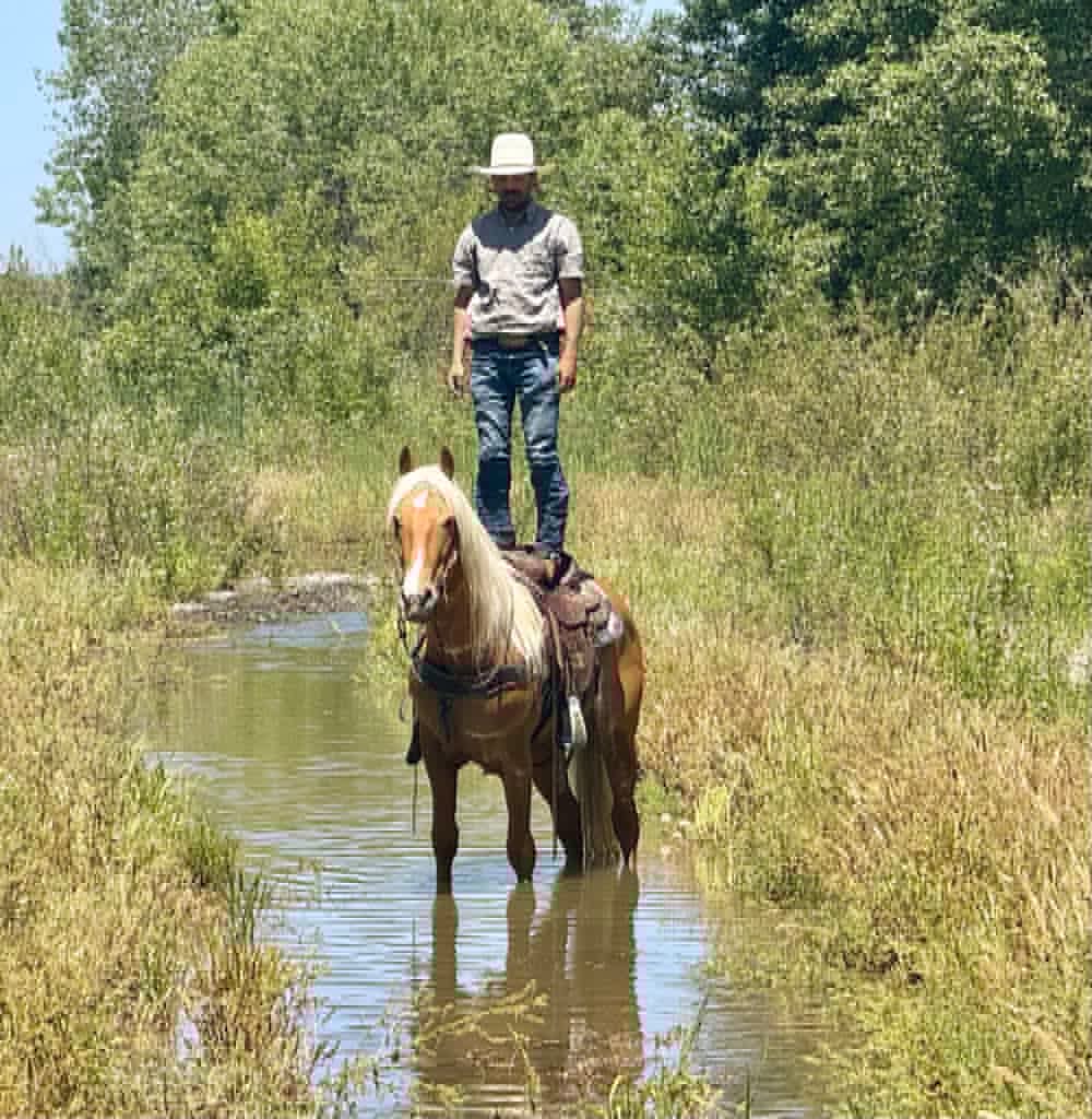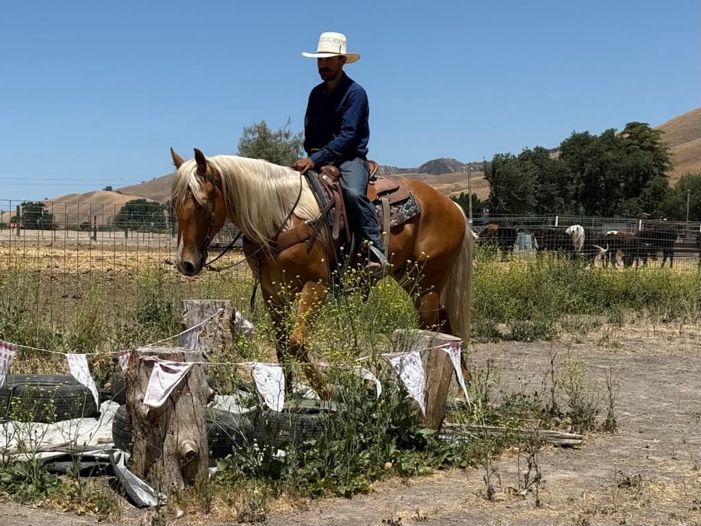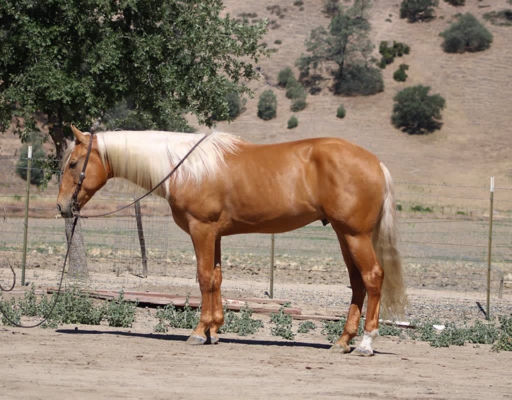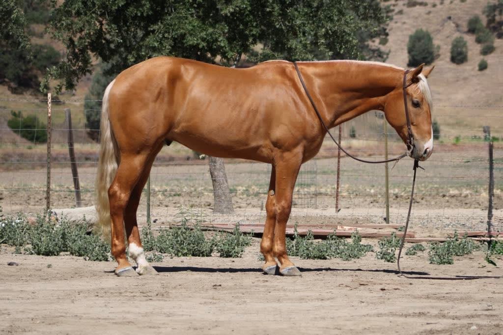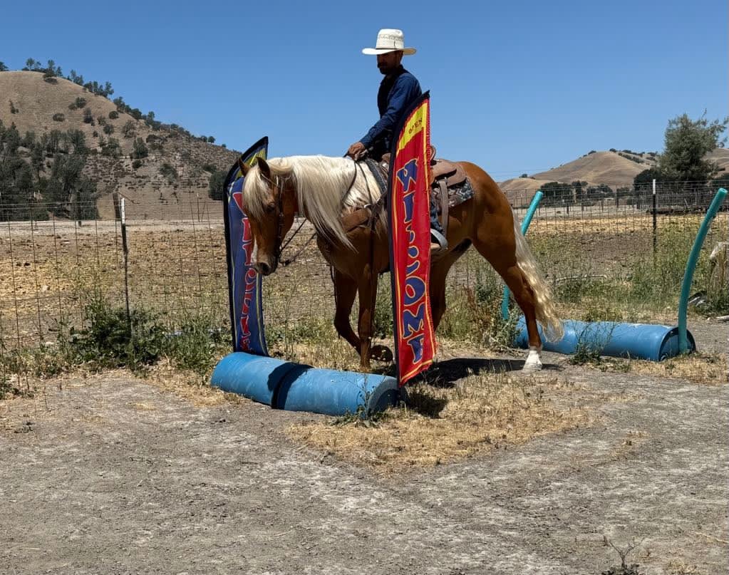 Meet 24-Carrot This golden palomino is a real head-turner, capturing everyone’s attention with his radiant beauty. Picture this: a magnificent horse with a long, flowing mane and tail that shimmer in the sunlight. Standing at 16 hands tall, he’s like a living, breathing work of art. And despite being just 5 years old, he carries himself with the calm and gentle spirit you’d expect from a much older horse. He’s got this adorable puppy-dog personality that just melts your heart. I swear, if he could, he’d be right there snuggling with you on the couch! Riding 24-Carrot is an absolute dream. He transitions between walk, trot, and canter so smoothly and gracefully. He’s got a lovely headset, responds beautifully to leg cues, and stops and backs with ease. You can tell he’s been trained for a variety of disciplines. But don’t let his good looks fool you – he’s incredibly versatile too! Whether he’s navigating tough trails or tackling obstacle courses, he approaches everything with the confidence of a seasoned pro. What really gets me about 24-Carrot are his kind, intelligent eyes. They say a lot about his personality. He stays calm even around busy roads, making him super safe for riders of all levels. He’s experienced on trails, confidently handles water, logs, trees, and wildlife. He doesn’t mind riding alone or with other horses. He’s been used to gather cattle and remains composed in any situation. Plus, he’s a champ on obstacle courses, unfazed by bridges, flags, bouncy balls, and tarps. This great boy is always happy to see you, stands patiently for everything from saddling to bath time, and travels well. If you’re interested in meeting 24-Carrot, reach out to Dina at Longhorn Ranch at 831-537-1915. located in Paicines, CA, and can arrange shipping throughout the US.