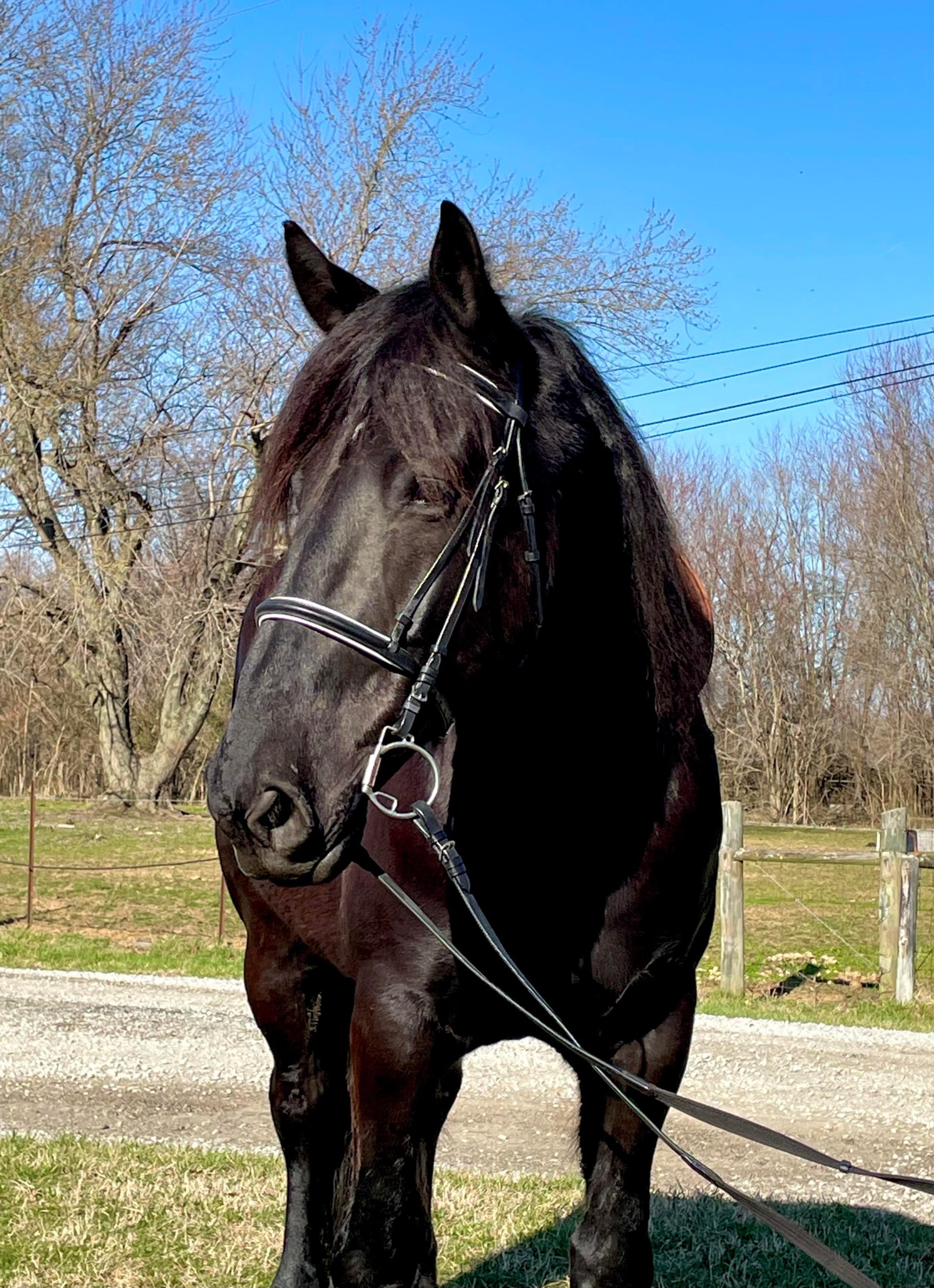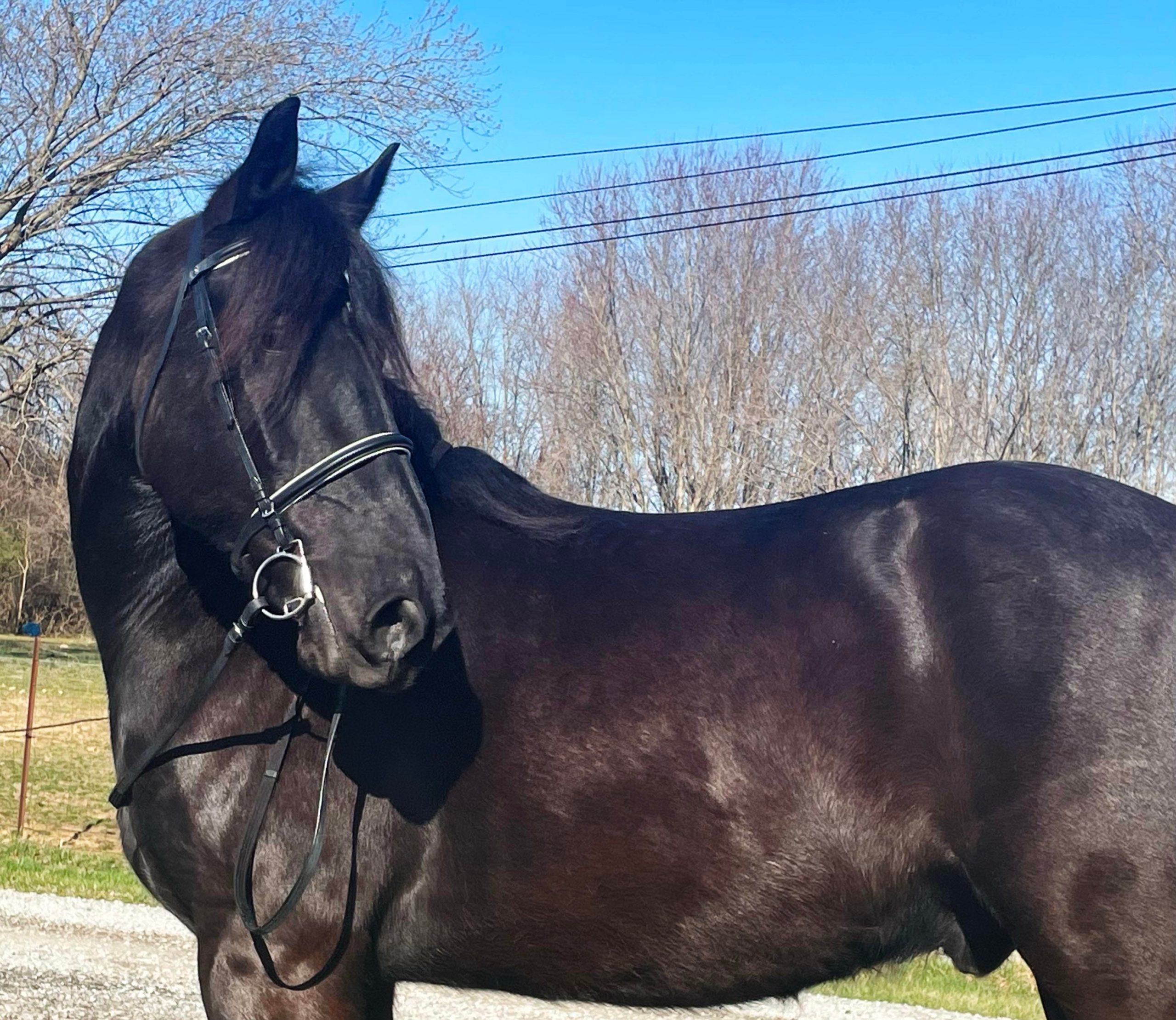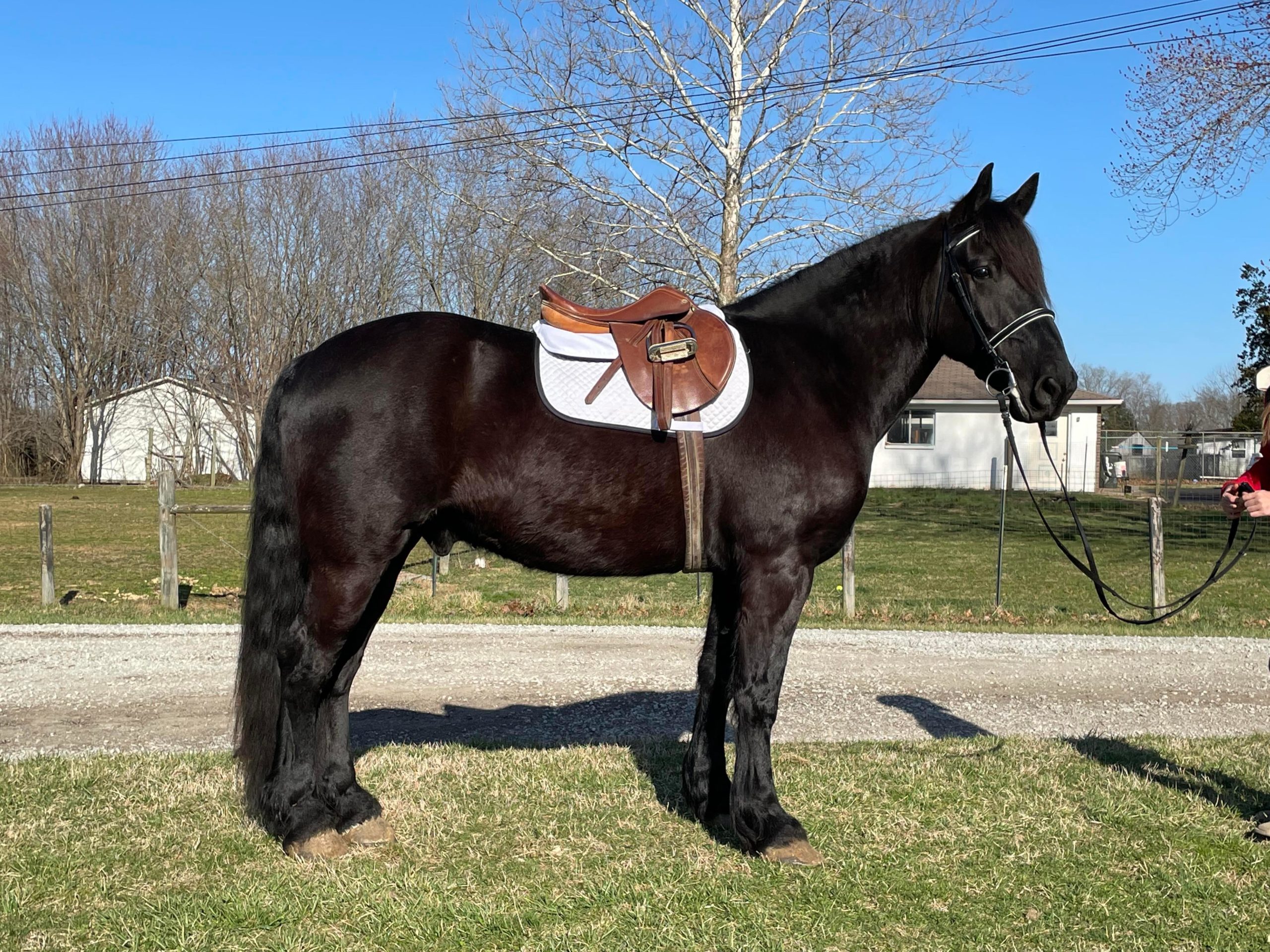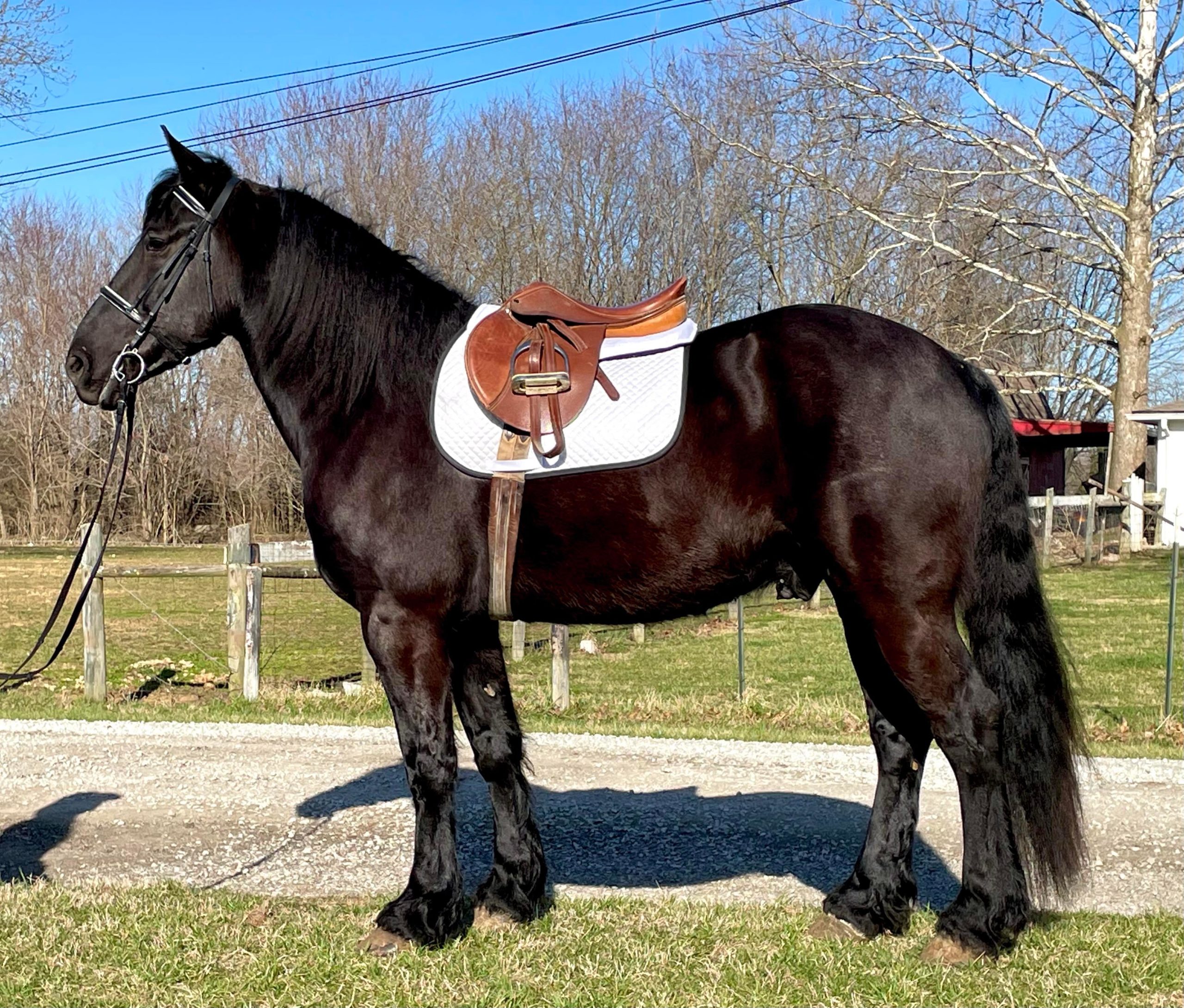 “Angus” 5 yr old Friesian Cross Gelding. This sweet guy is a beautiful elegant mover with a big floaty trot. He has his whole life ahead of him and is Extremely versatile, he works in the arena, trail rides, and DRIVES! Rides English and western. He has had several months training jumping and been working in the lower levels of dressage. He has been out on several fox hunts this past year and absolutely loves that atmosphere. He has the talent and potential to make a very nice show gelding, for all ages. As pretty as he rides English, he has been equally ridden western and is a fantastic trail horse. We have used him in several of our barn’s camping trips for our students and their families. He is a beautiful driving horse and was broke to drive when he was 2 years old. It doesnt matter how long its been since you harnessed him, he drives right off without missing a beat! Traffic and road safe, and is ready to turn everyone’s head in your town’s parade. Angus has a puppy dog personality and a favorite in the barn. He is very well mannered: tacking, grooming, clipping, bathing and we use the horse vacuum on him daily. Stands tied quiet and patiently. Great for the farrier, and vet and is up to date on everything. If you spend anytime with this amazing gelding you are sure to fall in love with him as fast as we did! Located in Borden, IN. Call Cara with any questions 812-704-6388.