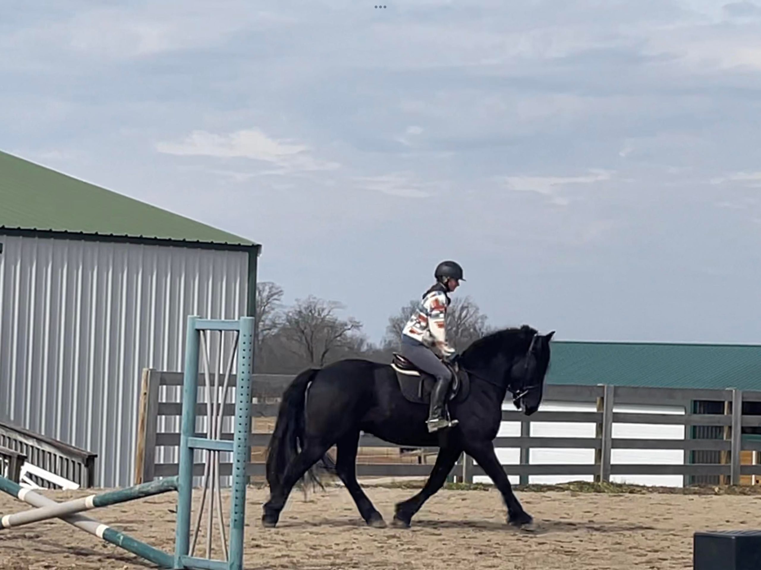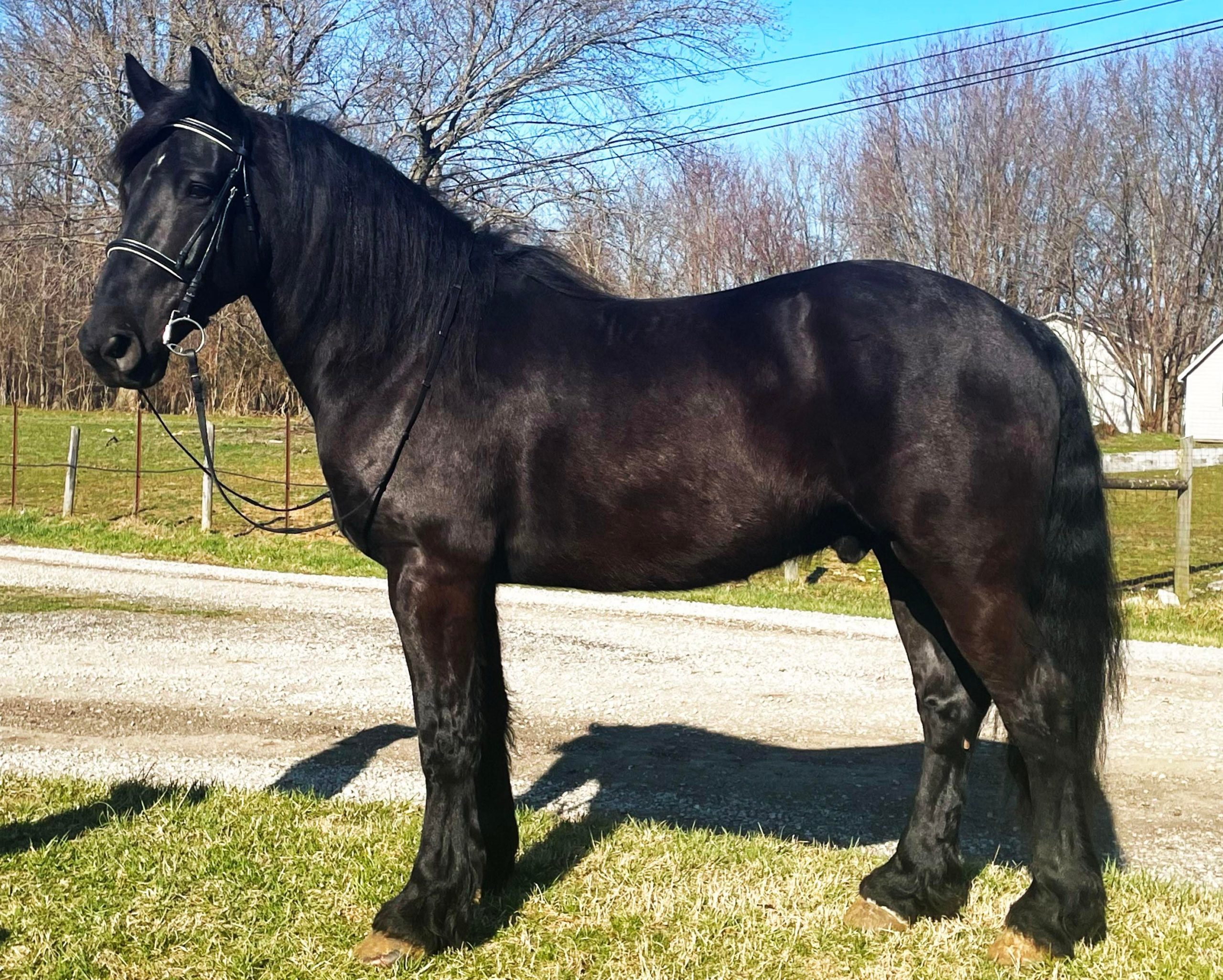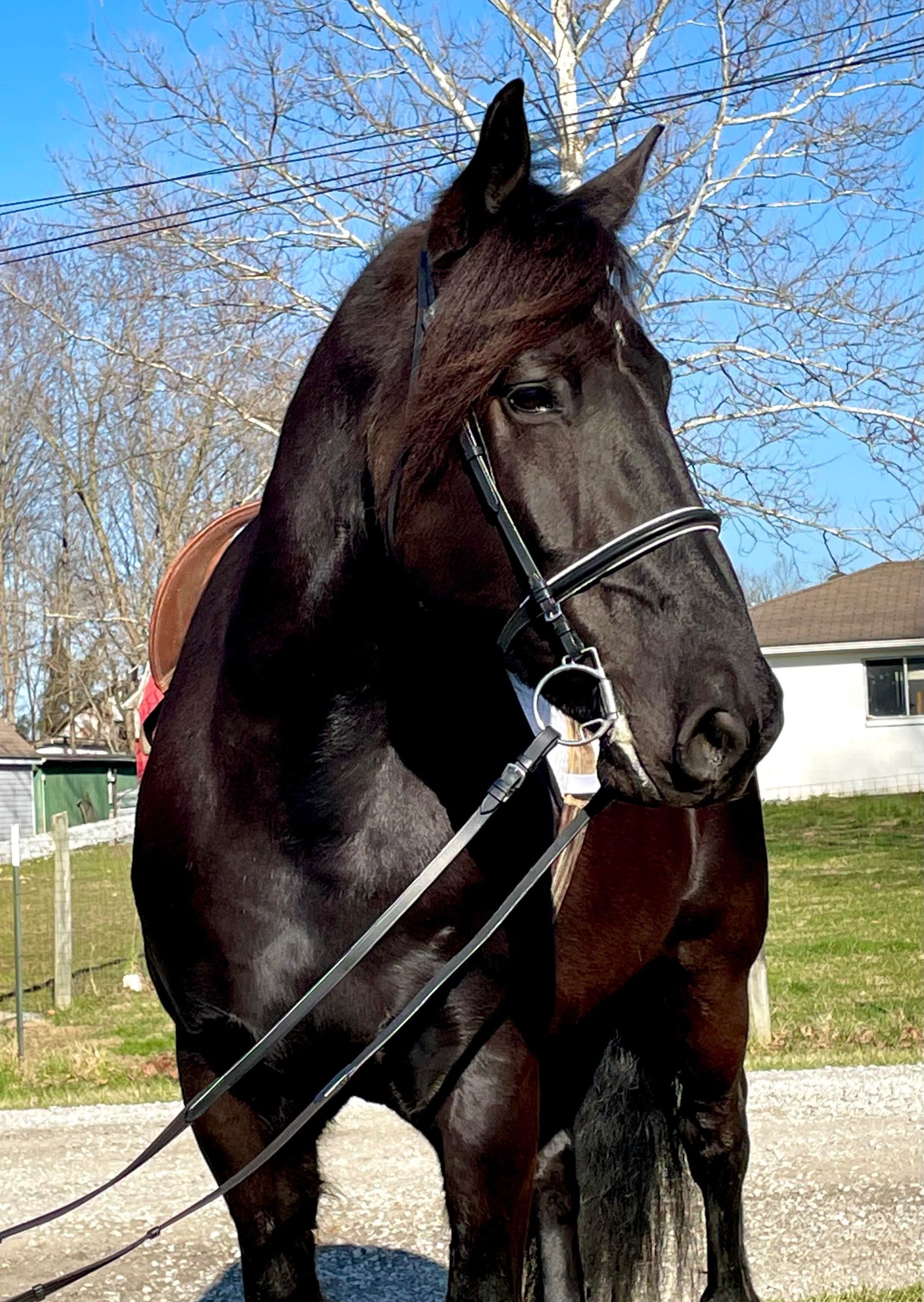 “Angus” 5 yr old Friesian Cross Gelding. This sweet guy is a beautiful elegant mover with a big floaty trot. He has his whole life ahead of him and is Extremely versatile, he works in the arena, trail rides, and DRIVES! Rides English and western. He has had several months training jumping and been working in the lower levels of dressage. He has been out on several fox hunts this past year and absolutely loves that atmosphere. He has the talent and potential to make a very nice show gelding, for all ages. As pretty as he rides English, he has been equally ridden western and is a fantastic trail horse. We have used him in several of our barn’s camping trips for our students and their families. He is a beautiful driving horse and was broke to drive when he was 2 years old. It doesnt matter how long its been since you harnessed him, he drives right off without missing a beat! Traffic and road safe, and is ready to turn everyone’s head in your town’s parade. Angus has a puppy dog personality and a favorite in the barn. He is very well mannered: tacking, grooming, clipping, bathing and we use the horse vacuum on him daily. Stands tied quiet and patiently. Great for the farrier, and vet and is up to date on everything. If you spend anytime with this amazing gelding you are sure to fall in love with him as fast as we did! Located in Borden, IN. Call Cara with any questions 812-704-6388.
