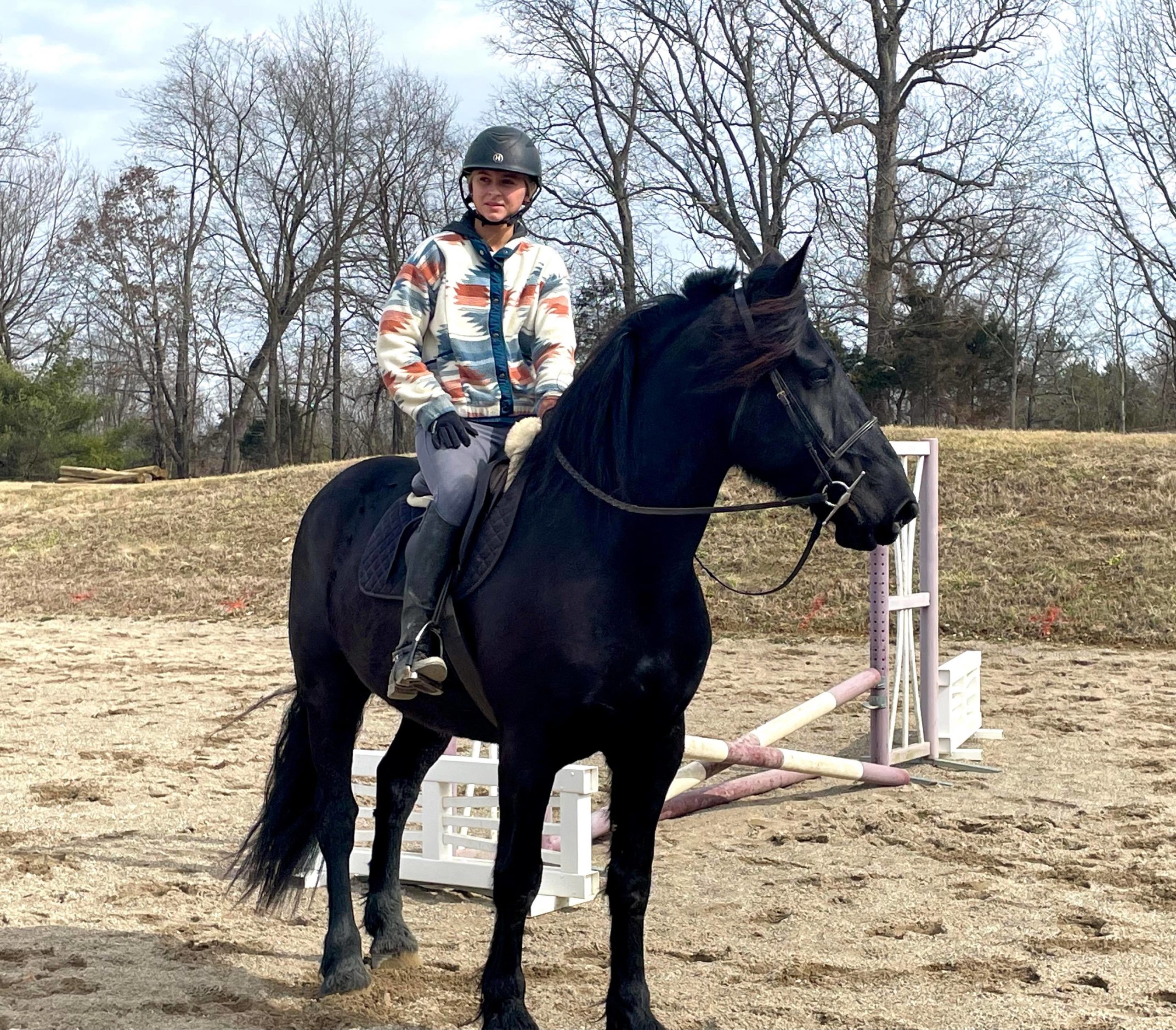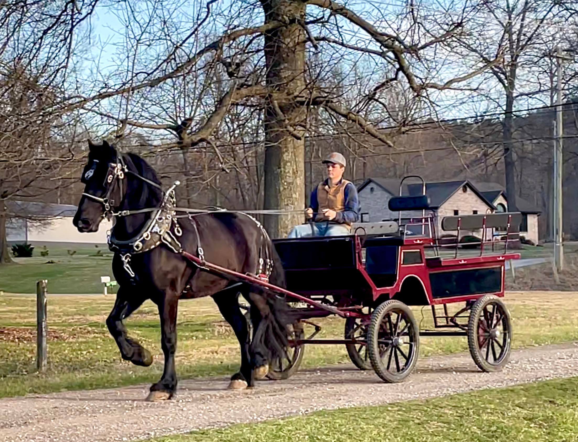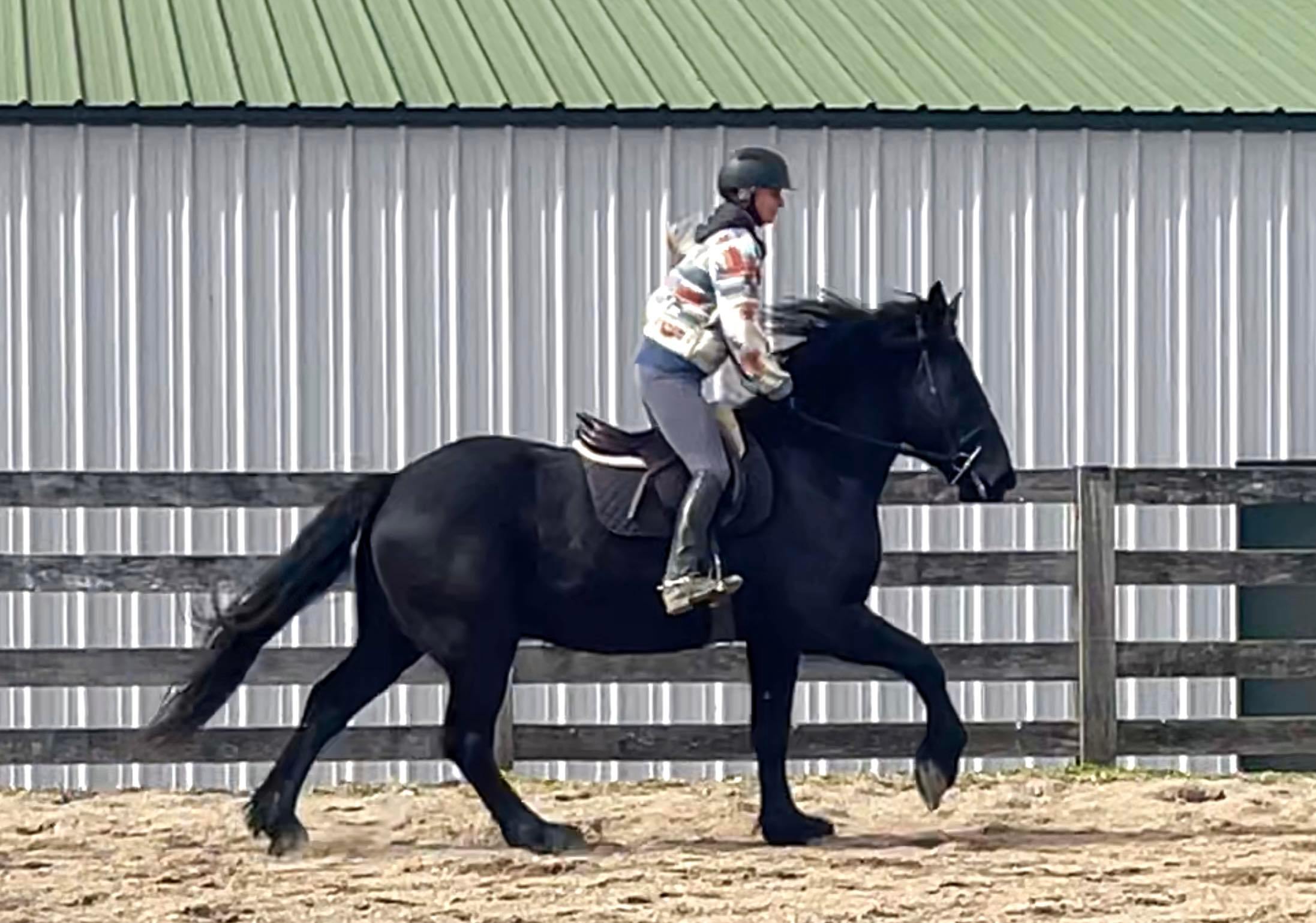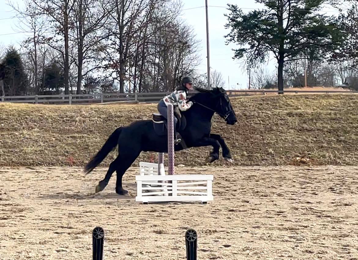 “Angus” 5 yr old Friesian Cross Gelding. This sweet guy is a beautiful elegant mover with a big floaty trot. He has his whole life ahead of him and is Extremely versatile, he works in the arena, trail rides, and DRIVES! Rides English and western. He has had several months training jumping and been working in the lower levels of dressage. He has been out on several fox hunts this past year and absolutely loves that atmosphere. He has the talent and potential to make a very nice show gelding, for all ages. As pretty as he rides English, he has been equally ridden western and is a fantastic trail horse. We have used him in several of our barn’s camping trips for our students and their families. He is a beautiful driving horse and was broke to drive when he was 2 years old. It doesnt matter how long its been since you harnessed him, he drives right off without missing a beat! Traffic and road safe, and is ready to turn everyone’s head in your town’s parade. Angus has a puppy dog personality and a favorite in the barn. He is very well mannered: tacking, grooming, clipping, bathing and we use the horse vacuum on him daily. Stands tied quiet and patiently. Great for the farrier, and vet and is up to date on everything. If you spend anytime with this amazing gelding you are sure to fall in love with him as fast as we did! Located in Borden, IN. Call Cara with any questions 812-704-6388.