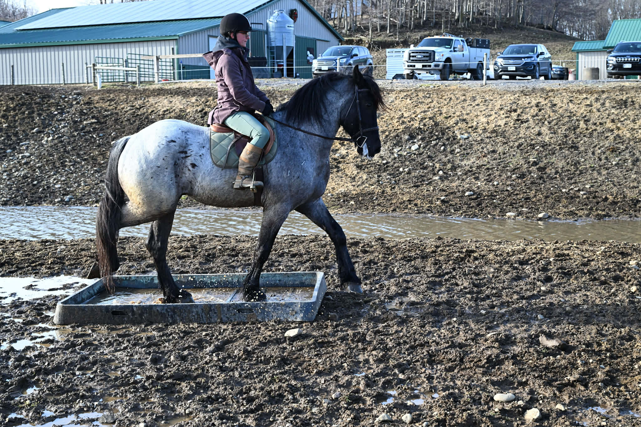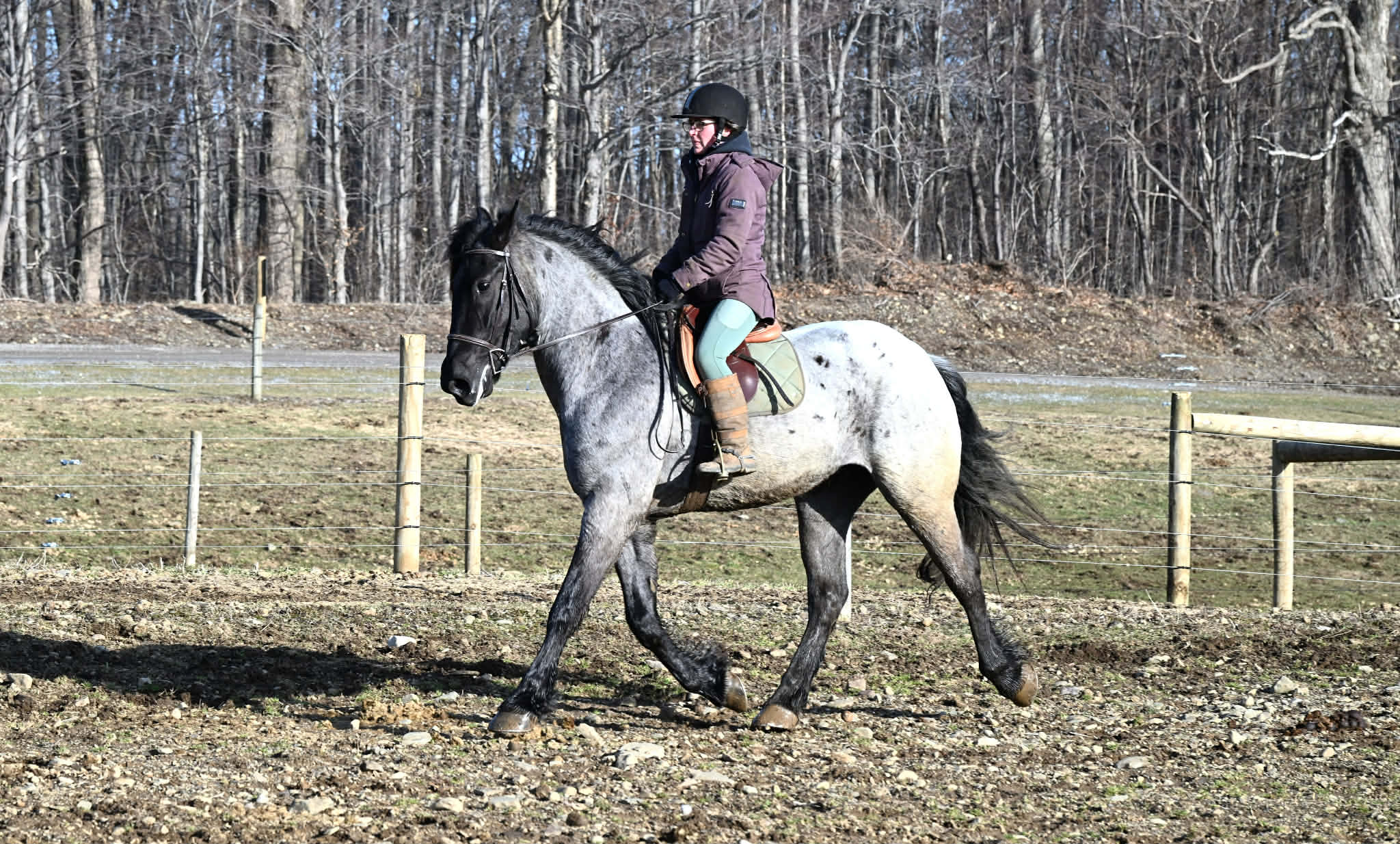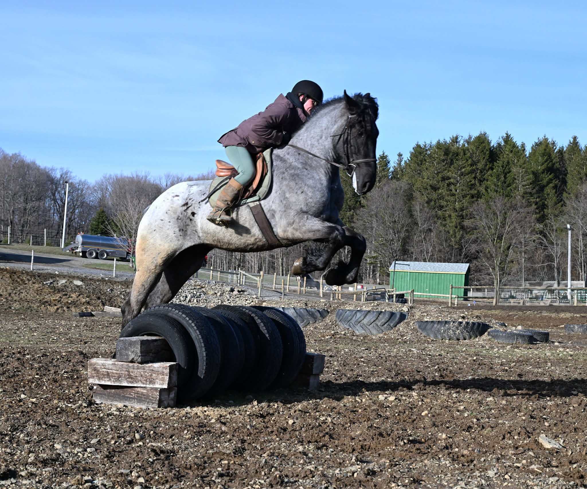 Meet Azur, a sharp-looking 4-year-old blue roan draft cross gelding standing 16.1h. He’s the kind that turns heads, but more importantly, he’s got the brain to match. Azur is sure-footed, brave, and takes everything in stride. He’s currently wearing shoes due to our terrain, but he has good, solid feet and clean legs. We’ve had him out on the obstacle course, and nothing seems to bother him; he’ll carry a flag, drag a tarp, and step over or through whatever you point him at without hesitation. He’s been used out on the trails both alone and in a group, and goes wherever you ask without a fuss. Azur is the type that wants to please and shows up with a good attitude every ride. He’s also been around plenty of wildlife, water, dogs, and farm equipment, all part of his normal day. On the ground, he’s easy to be around with good manners. He stands well for grooming, tacking, the farrier, and loads and trailers quietly. He gets along well with other horses and respects fencing. Happy in a stall or out in the pasture. Under saddle, Azur is a solid, comfortable ride with a nice walk, trot, and canter. He rides in a snaffle, stays soft in the mouth, and is easy to get along with. Azur has been used for our therapeutic riding program, and the riders all love him. Azur has been out fox hunting and on a low level eventing course. He stands for mounting and dismounting and knows how to take a joke. He has been in the arena with 15 other horses and doesn’t get bothered by other horses going by him. We have also used Azur for our sleigh rides this winter as a team, and he did an excellent job. If you’re looking for a young horse with a great start, a level head, and the kind of attitude that’ll take him in any direction, Azur is one you won’t wanna miss. Follow us on Facebook and our Website! Contact Dayton at 585-734-0169 for more information, located in Warsaw, NY.