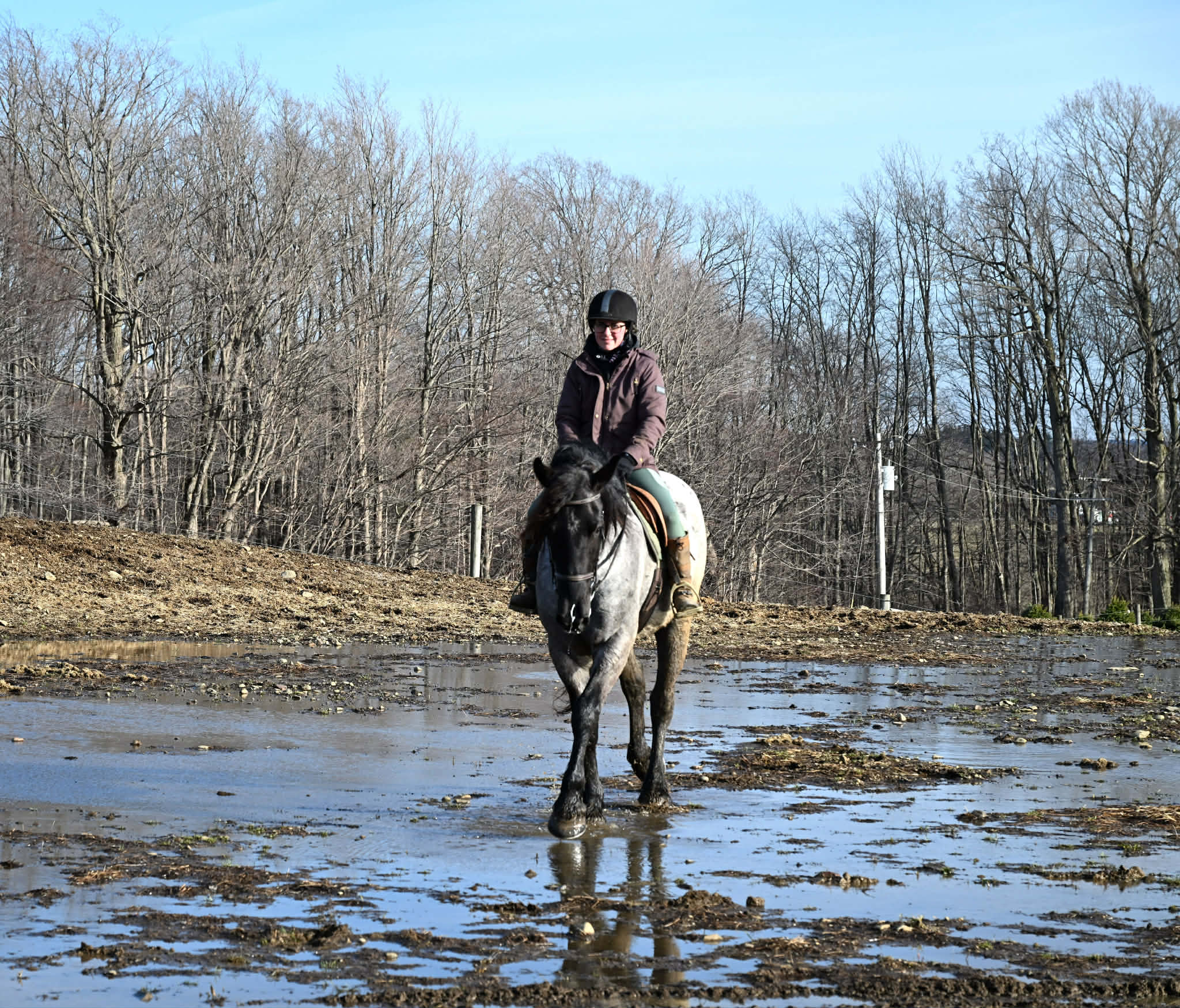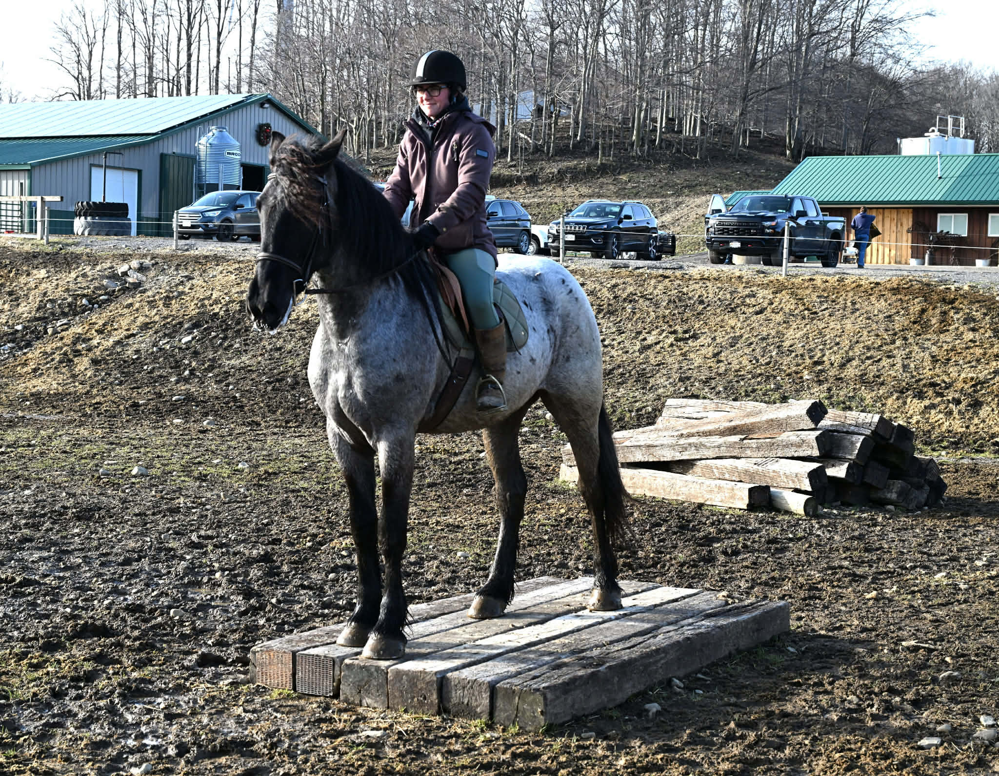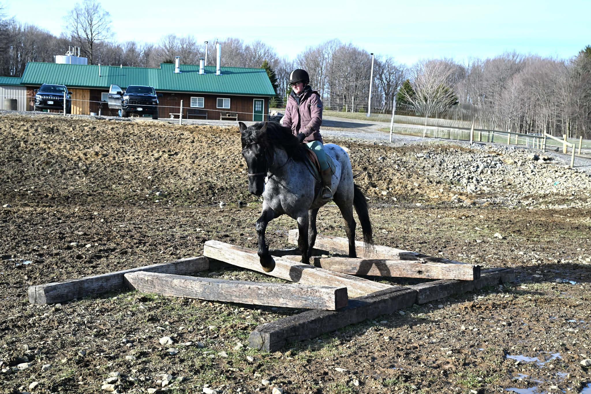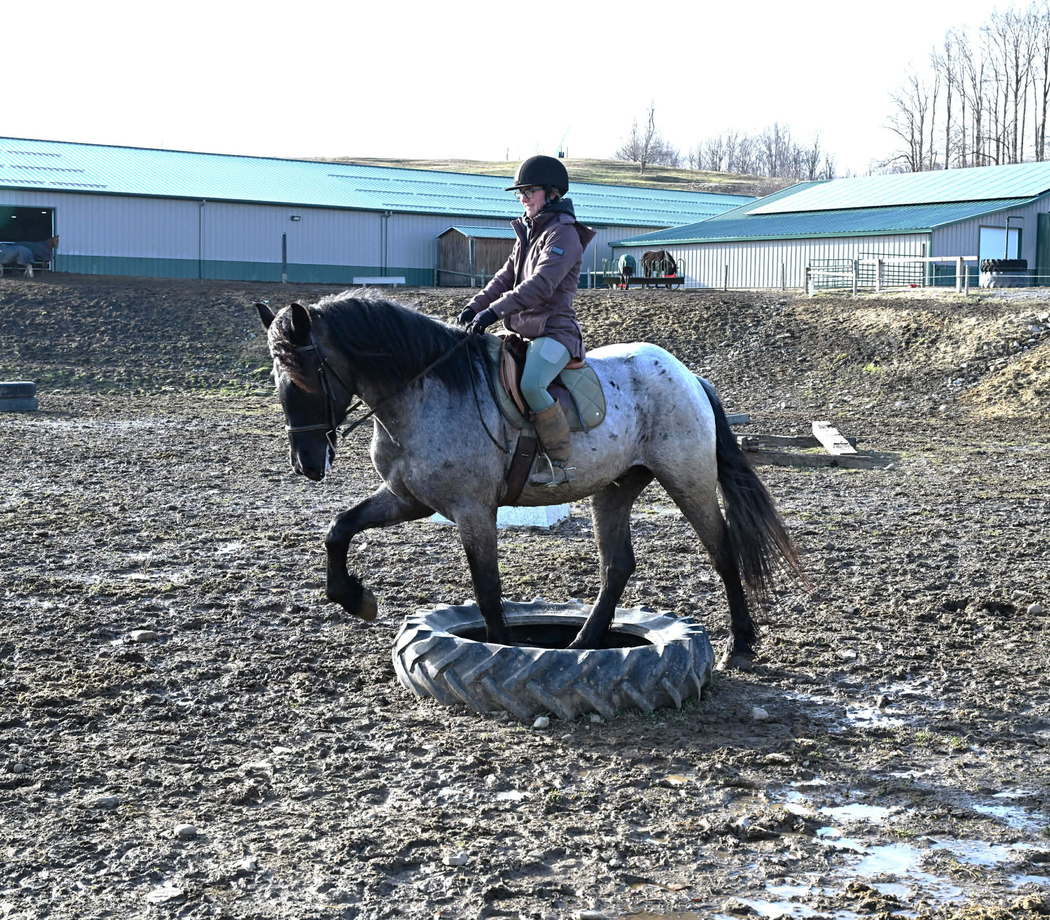 Meet Azur, a sharp-looking 4-year-old blue roan draft cross gelding standing 16.1h. He’s the kind that turns heads, but more importantly, he’s got the brain to match. Azur is sure-footed, brave, and takes everything in stride. He’s currently wearing shoes due to our terrain, but he has good, solid feet and clean legs. We’ve had him out on the obstacle course, and nothing seems to bother him; he’ll carry a flag, drag a tarp, and step over or through whatever you point him at without hesitation. He’s been used out on the trails both alone and in a group, and goes wherever you ask without a fuss. Azur is the type that wants to please and shows up with a good attitude every ride. He’s also been around plenty of wildlife, water, dogs, and farm equipment, all part of his normal day. On the ground, he’s easy to be around with good manners. He stands well for grooming, tacking, the farrier, and loads and trailers quietly. He gets along well with other horses and respects fencing. Happy in a stall or out in the pasture. Under saddle, Azur is a solid, comfortable ride with a nice walk, trot, and canter. He rides in a snaffle, stays soft in the mouth, and is easy to get along with. Azur has been used for our therapeutic riding program, and the riders all love him. Azur has been out fox hunting and on a low level eventing course. He stands for mounting and dismounting and knows how to take a joke. He has been in the arena with 15 other horses and doesn’t get bothered by other horses going by him. We have also used Azur for our sleigh rides this winter as a team, and he did an excellent job. If you’re looking for a young horse with a great start, a level head, and the kind of attitude that’ll take him in any direction, Azur is one you won’t wanna miss. Follow us on Facebook and our Website! Contact Dayton at 585-734-0169 for more information, located in Warsaw, NY.