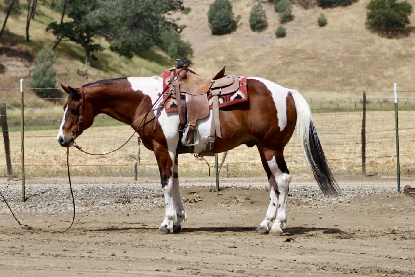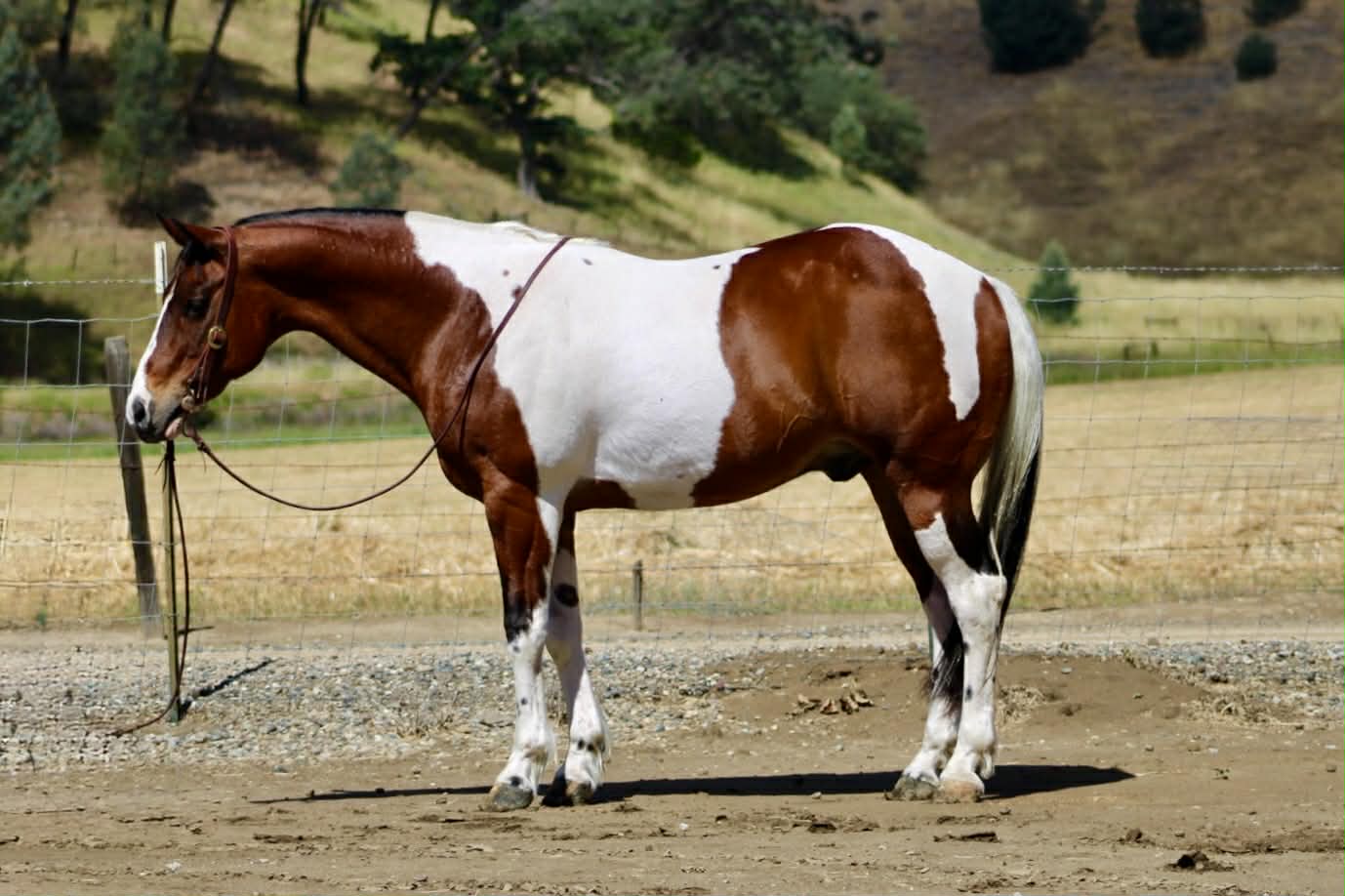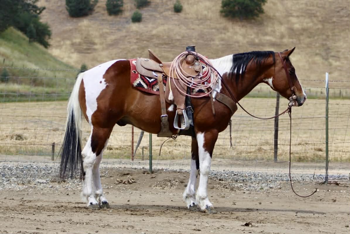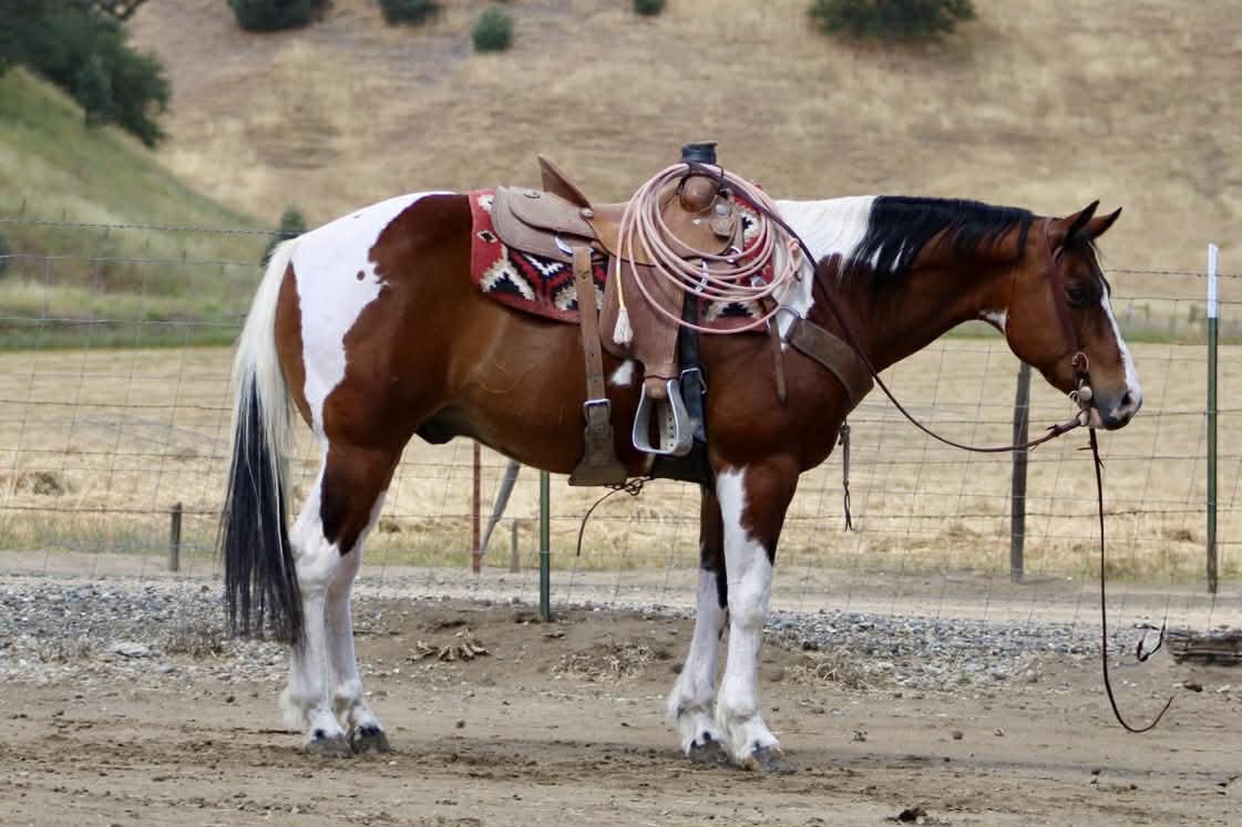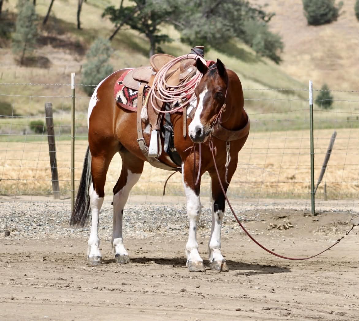 Some horses you ride… and some horses just feel right from the start. Big Mac is one of those. 11 Years old and Standing just under 15.1 hands and made stout, this tri-color paint has the kind of look that gets noticed, but it’s the way he rides that really sets him apart. He’s steady, straightforward, and easy to get along with from the moment you step on. In the arena, he keeps things simple and consistent. He has a comfortable, easy pace, picks up his leads clean, and responds without needing much effort. He stops when asked, turns correct, and backs soft. Everything feels smooth and natural. Ride him with others or take him out by himself—he stays the same either way. He’s easy to keep, does well stalled or turned out, stands tied quietly, and is simple to tack up. Outside, he handles the kind of country most horses have to think about. Logs, trees, narrow trails—it doesn’t change him. He’s seen wildlife and everyday commotion and takes it in stride without getting bothered. He’s been used checking cows and moving pairs, and he’s comfortable around livestock and other animals. Obstacles like bridges, tires, and pool noodles are nothing new to him—he goes through them quiet and willing. Big Mac is a gelding you can count on to be consistent, kind, and enjoyable every time you ride him. He’s the kind that fits into your program without skipping a beat and quickly becomes one you reach for. Dina at Longhorn Ranch 831:537:1915 Paicines ca Nationwide shipping available with reputable haulers. Come see him in person or give us a call—he’s an easy one to appreciate.