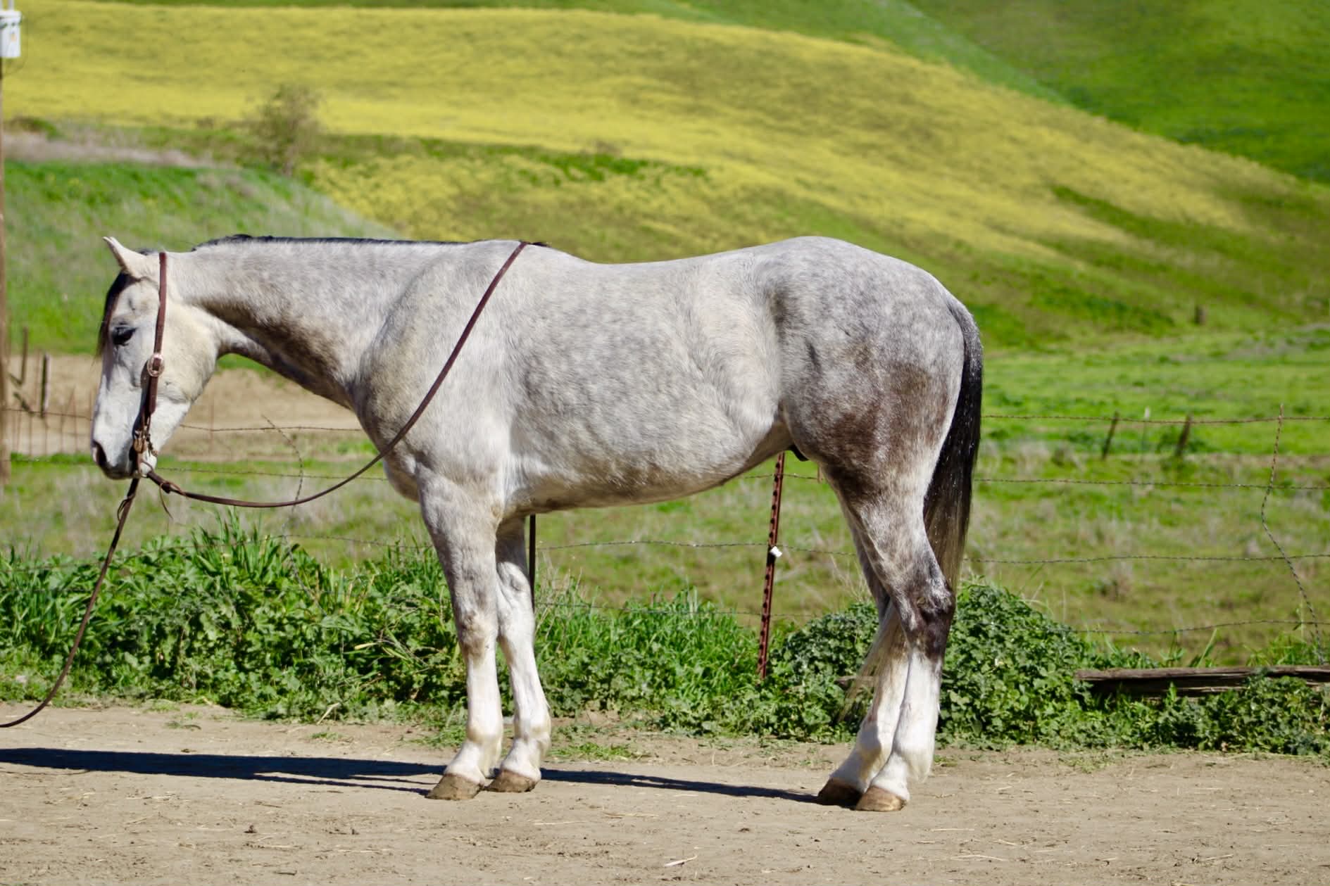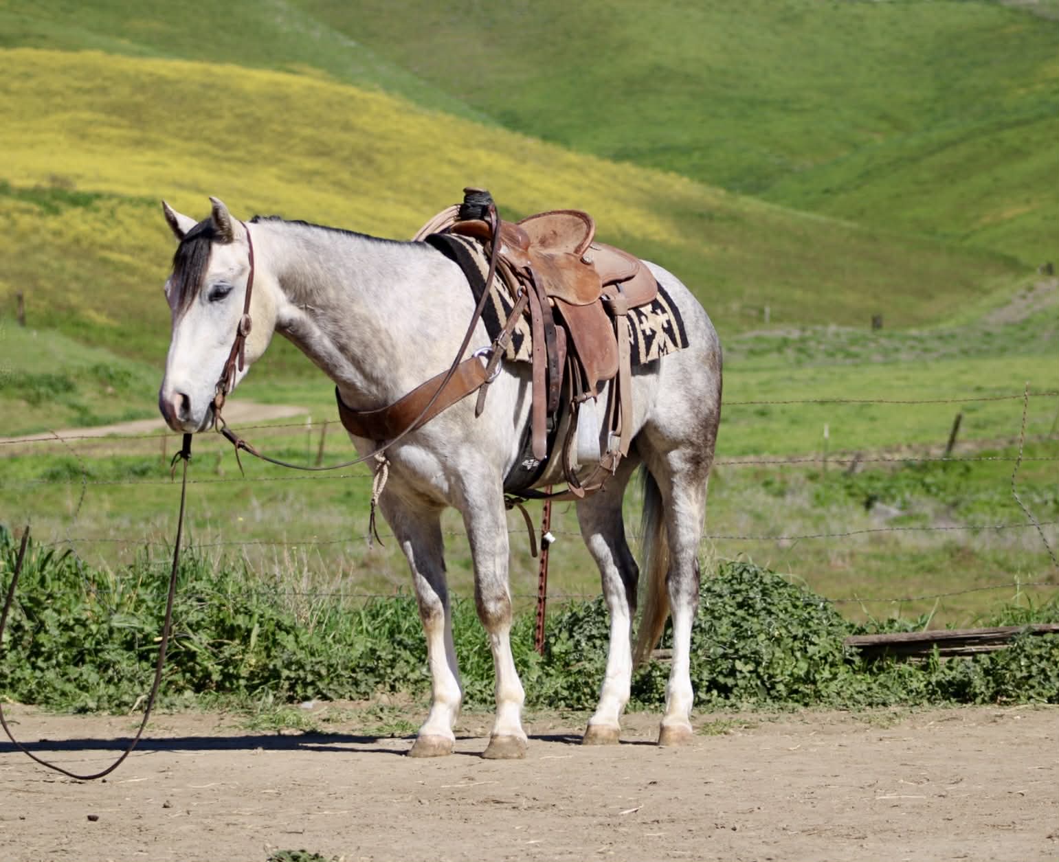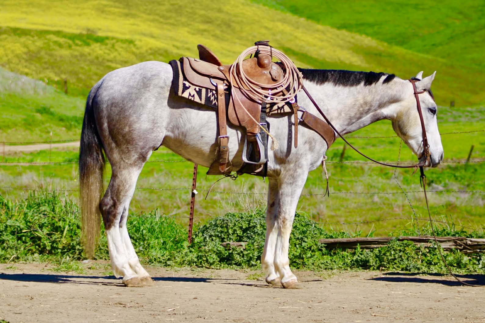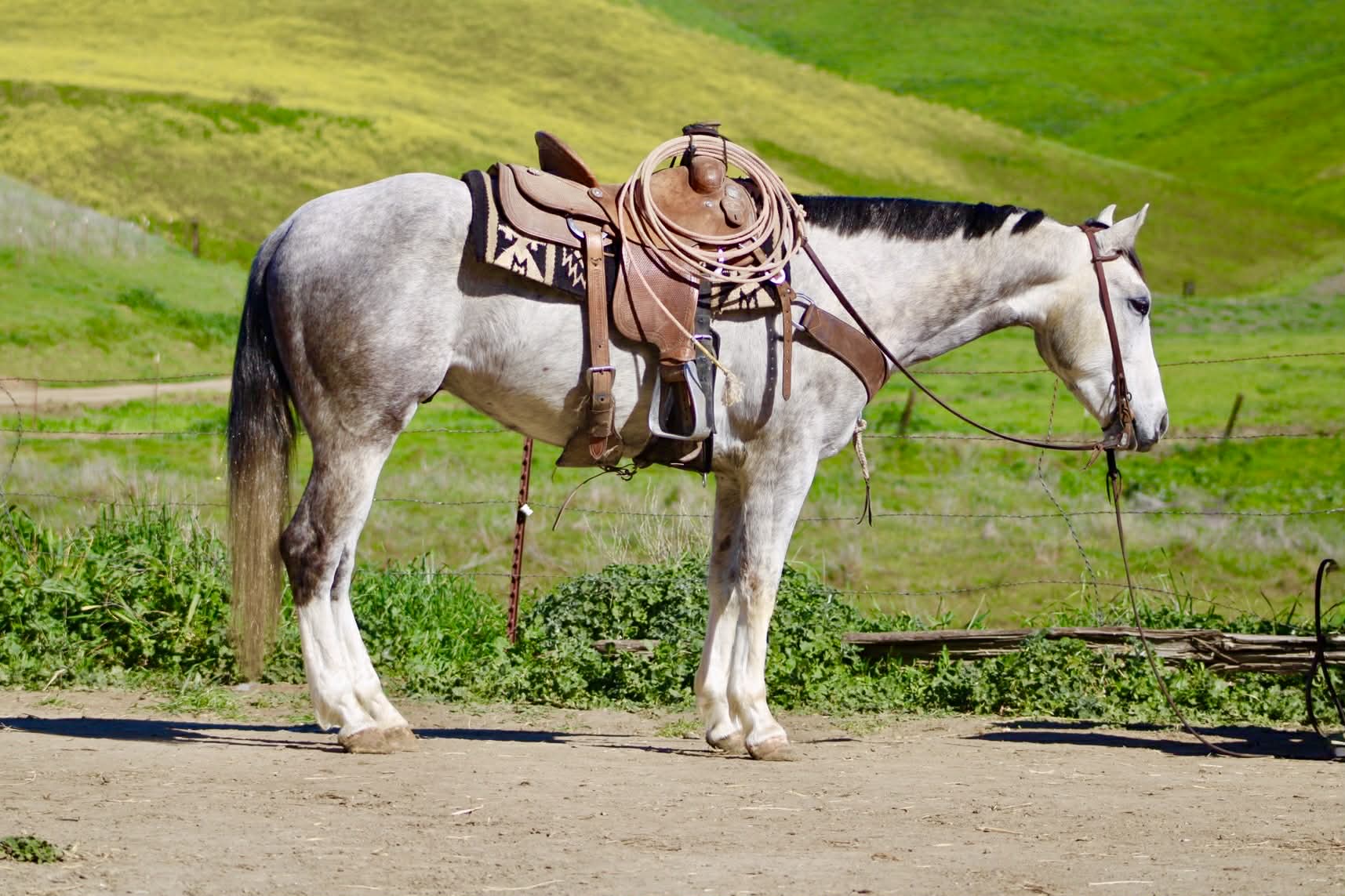 If you appreciate a young horse with a big heart, a great mind, and a foundation that’s already heading in the right direction, Booties is one you’ll want to meet. This classy grey gelding with four white socks is the kind that makes you smile every time you ride him. He is extremely friendly, people-oriented, and a true pleasure to be around both in and out of the saddle. Booties has a solid start and works off a correct, uncomplicated foundation. He walks, trots, and lopes willingly, stays relaxed, and travels in nice, balanced circles. He carries himself with confidence and composure and feels more like a seasoned horse than one his age. Out on the trail, Booties is quiet, steady, and sensible. He goes along handling new surroundings with ease. He has been exposed to obstacles, flags, and tarps, and approaches everything with a calm, willing attitude. Nothing seems to worry this gelding — no buck, no bolt, and absolutely no silliness. Booties has been used to gather cattle and shows a lot of interest in them. We have roped the sled on him, and he is taking to it nicely, showing good try and a great attitude about his work. What truly sets Booties apart is his mind. He is level-headed, honest, and always tries to do the right thing. We feel he is gentle enough for beginners and would make a great youth horse with his willing, people-pleasing attitude, while seasoned riders will enjoy him just as much. Booties is such a pleasure to be around and ride, and truly feels like a special one in the making. Whether you’re looking for a solid trail partner, a nice arena horse, or a young horse to continue developing, Booties checks all the right boxes. Longhorn Ranch Paicines, California Dina – 831-537-1915 Shipping assistance available nationwide.
