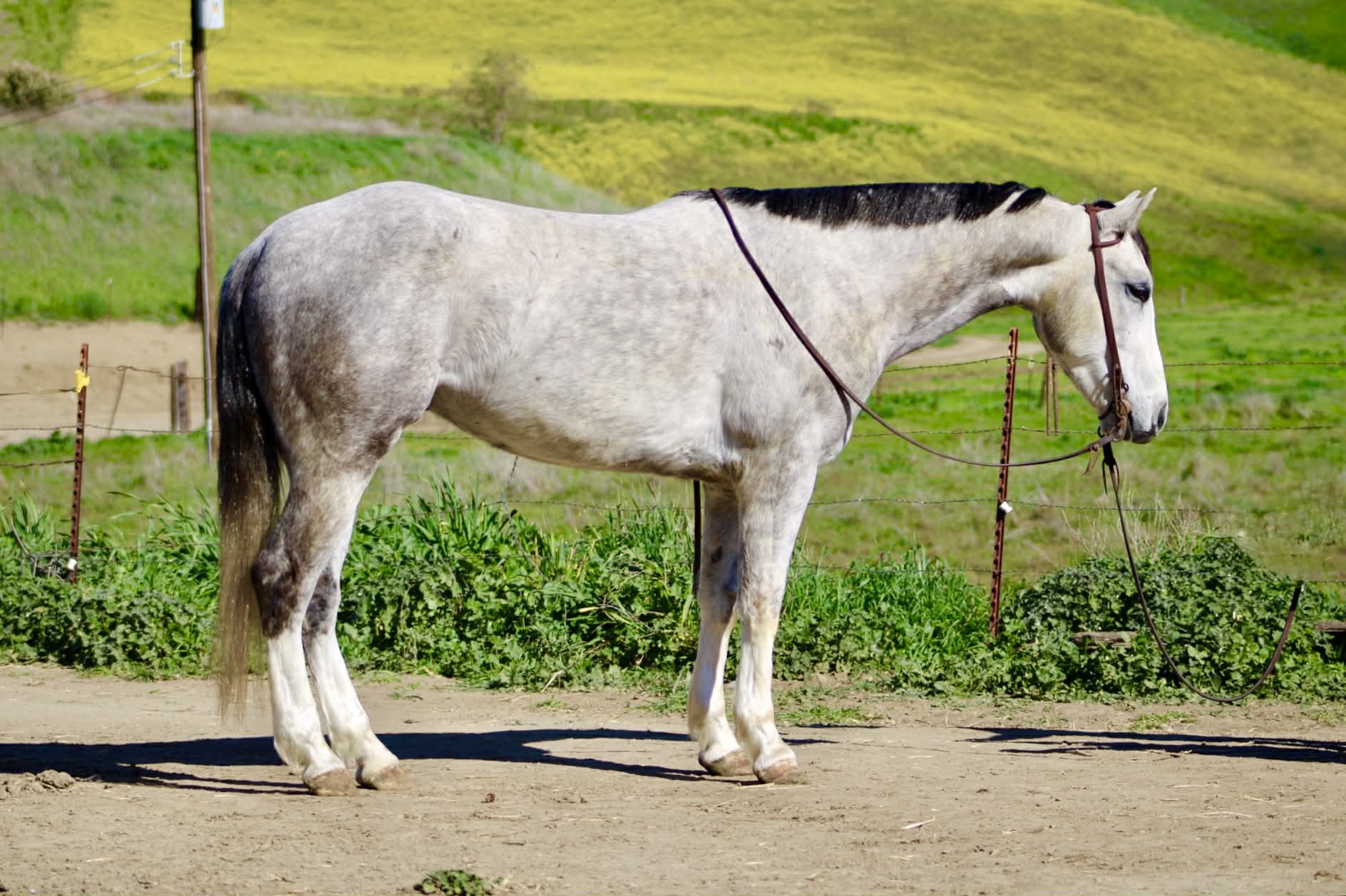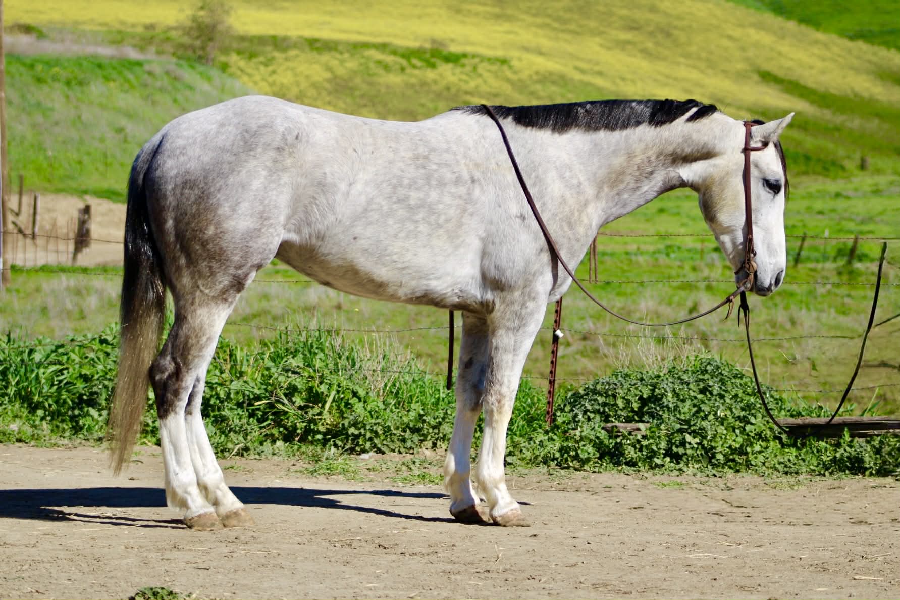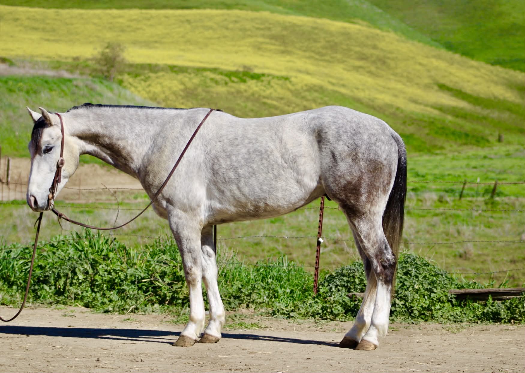 If you appreciate a young horse with a big heart, a great mind, and a foundation that’s already heading in the right direction, Booties is one you’ll want to meet. This classy grey gelding with four white socks is the kind that makes you smile every time you ride him. He is extremely friendly, people-oriented, and a true pleasure to be around both in and out of the saddle. Booties has a solid start and works off a correct, uncomplicated foundation. He walks, trots, and lopes willingly, stays relaxed, and travels in nice, balanced circles. He carries himself with confidence and composure and feels more like a seasoned horse than one his age. Out on the trail, Booties is quiet, steady, and sensible. He goes along handling new surroundings with ease. He has been exposed to obstacles, flags, and tarps, and approaches everything with a calm, willing attitude. Nothing seems to worry this gelding — no buck, no bolt, and absolutely no silliness. Booties has been used to gather cattle and shows a lot of interest in them. We have roped the sled on him, and he is taking to it nicely, showing good try and a great attitude about his work. What truly sets Booties apart is his mind. He is level-headed, honest, and always tries to do the right thing. We feel he is gentle enough for beginners and would make a great youth horse with his willing, people-pleasing attitude, while seasoned riders will enjoy him just as much. Booties is such a pleasure to be around and ride, and truly feels like a special one in the making. Whether you’re looking for a solid trail partner, a nice arena horse, or a young horse to continue developing, Booties checks all the right boxes. Longhorn Ranch Paicines, California Dina – 831-537-1915 Shipping assistance available nationwide.