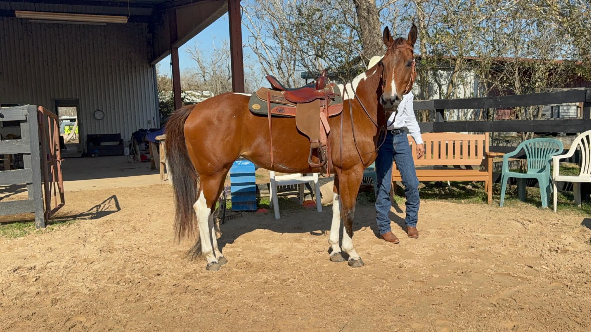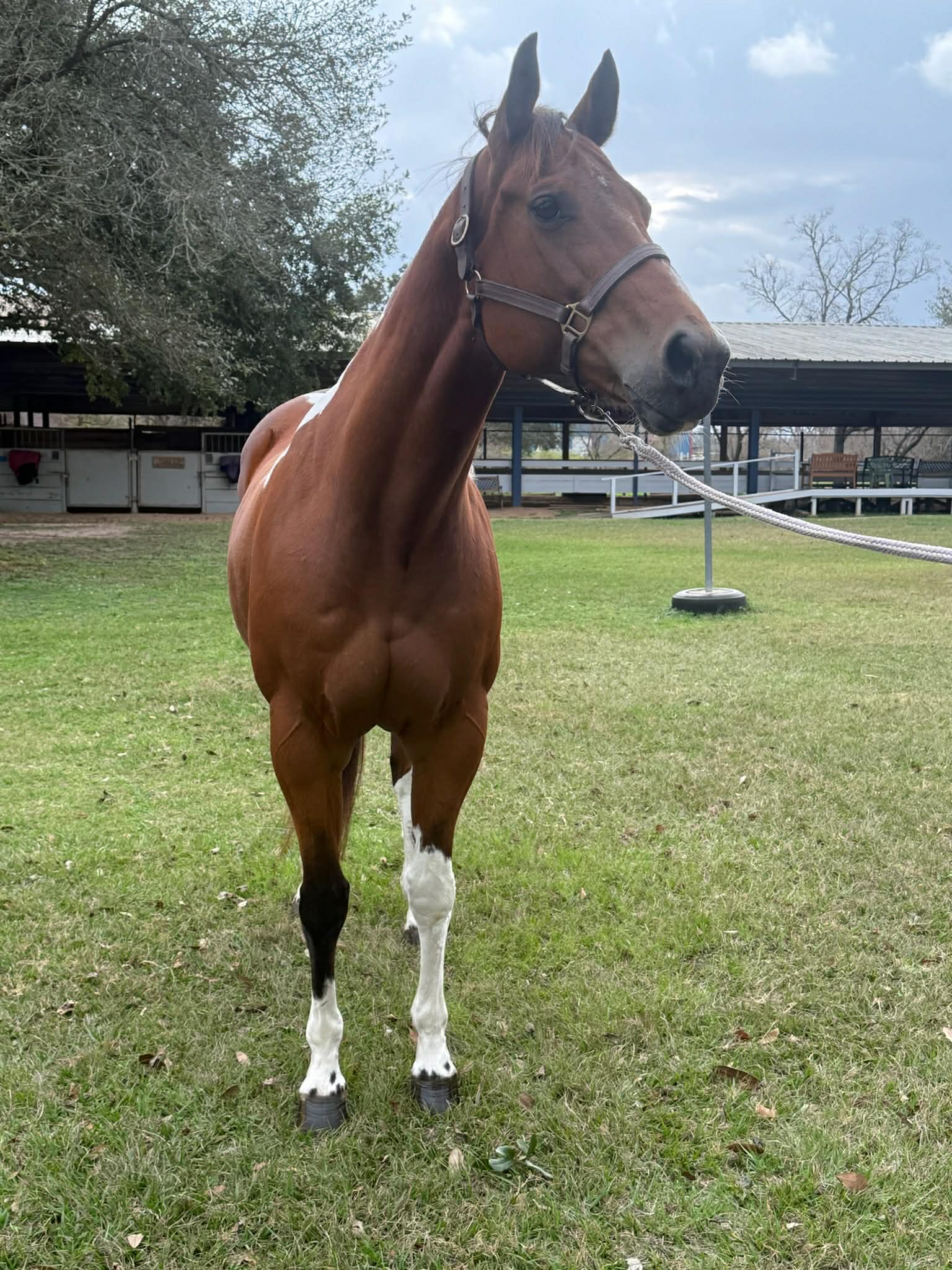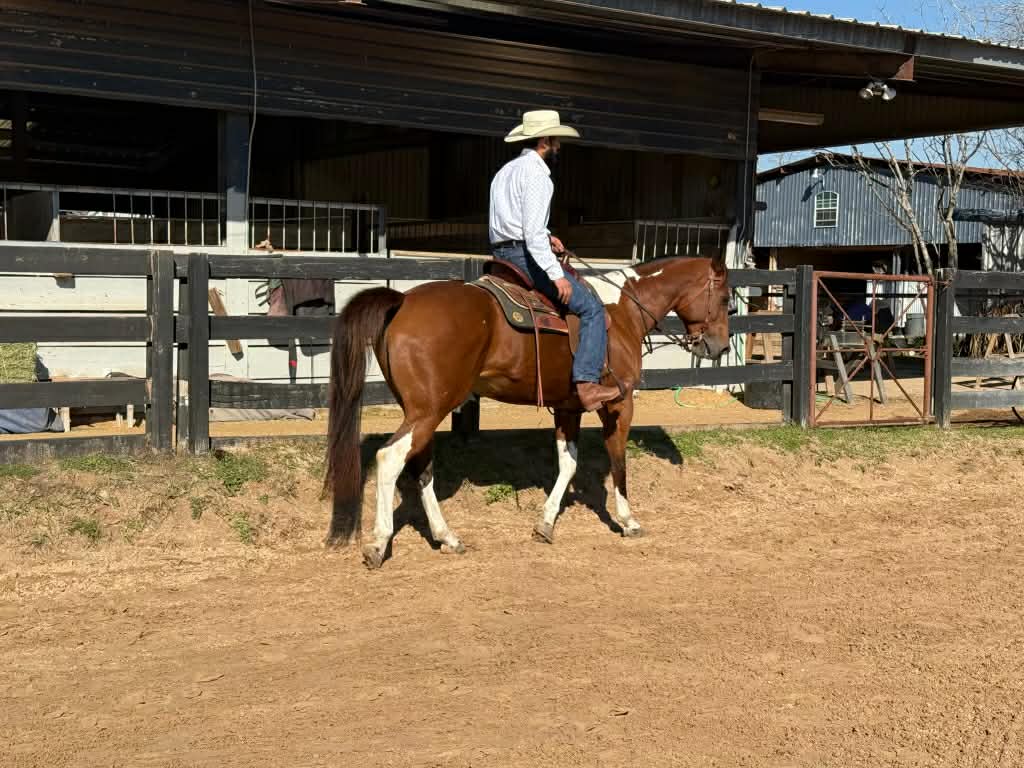 Rains Premenition aka Carrera is an athletic, flashy paint mare that has a great motor and will give you whatever speed you’re looking for. She was ridden Western on the trails before her arrival with us and English ever since, and has jumped everything from small crossrails to 2’6. Stands well for the farrier, bathes, ties, picks up all four feet, blankets, easy to catch, and has good ground manners. She is stalled at night, goes out in a herd of mares during the day, and generally gets along well with others. She listens well but needs a rider with confidence and a soft hand, and will do what you ask so long as you’re sure when you ask. UTD on shots, deworming, Coggins, teeth, and only wears front shoes. Well bred out of the Sacred Indian line.