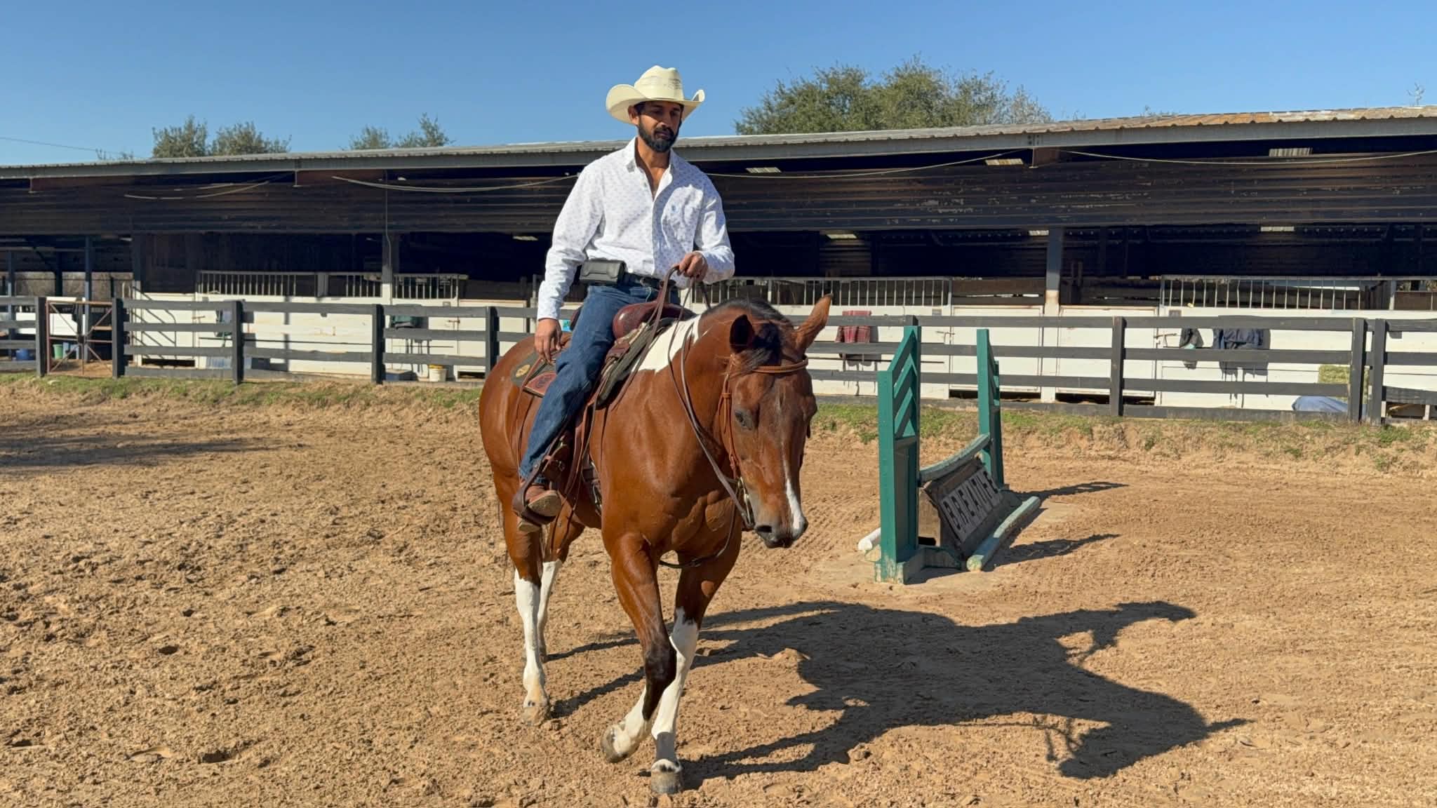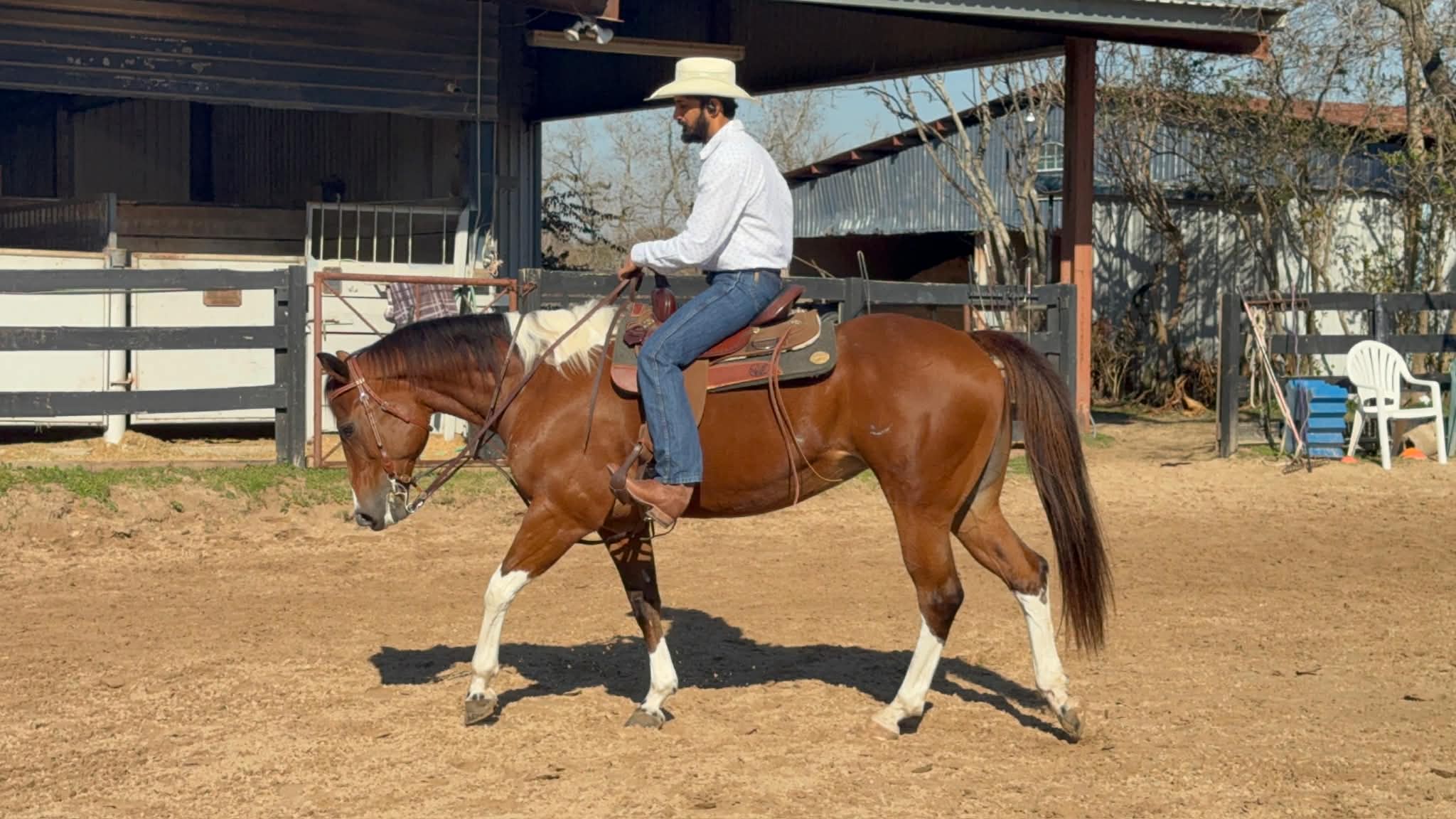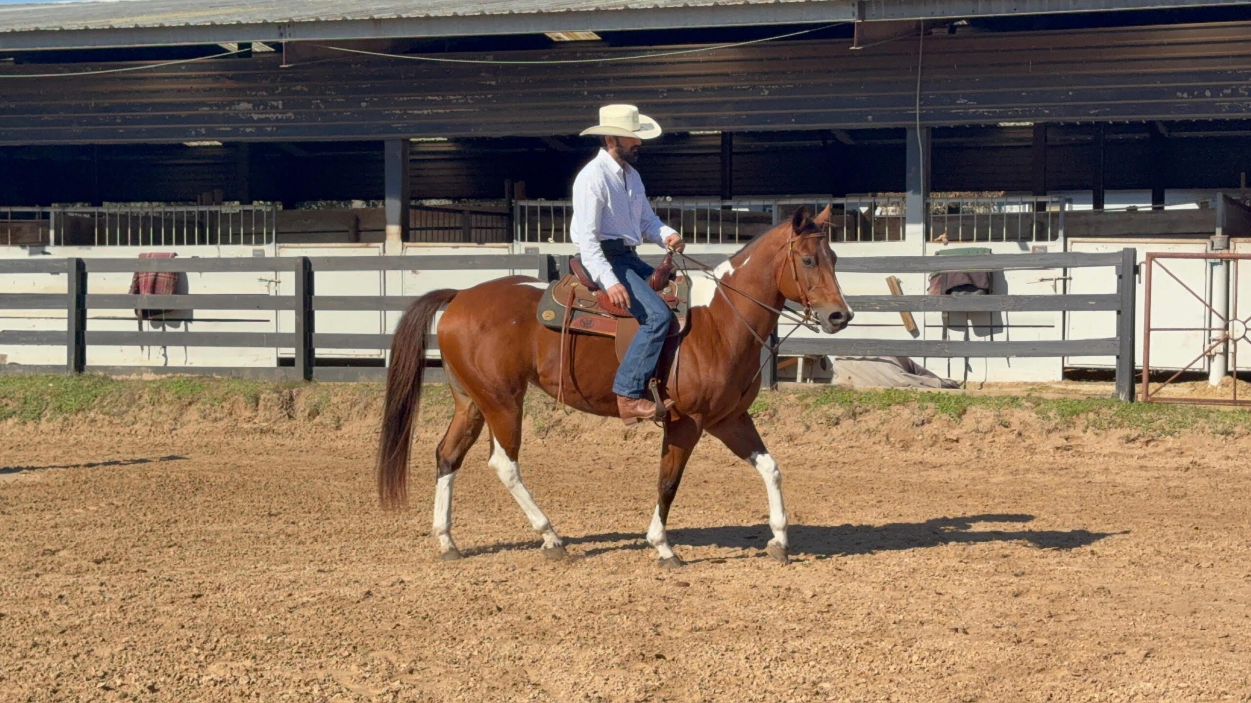Rains Premenition aka Carrera is an athletic, flashy paint mare that has a great motor and will give you whatever speed you’re looking for. She was ridden Western on the trails before her arrival with us and English ever since, and has jumped everything from small crossrails to 2’6. Stands well for the farrier, bathes, ties, picks up all four feet, blankets, easy to catch, and has good ground manners. She is stalled at night, goes out in a herd of mares during the day, and generally gets along well with others. She listens well but needs a rider with confidence and a soft hand, and will do what you ask so long as you’re sure when you ask. UTD on shots, deworming, Coggins, teeth, and only wears front shoes. Well bred out of the Sacred Indian line.