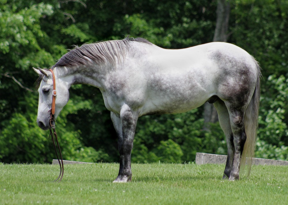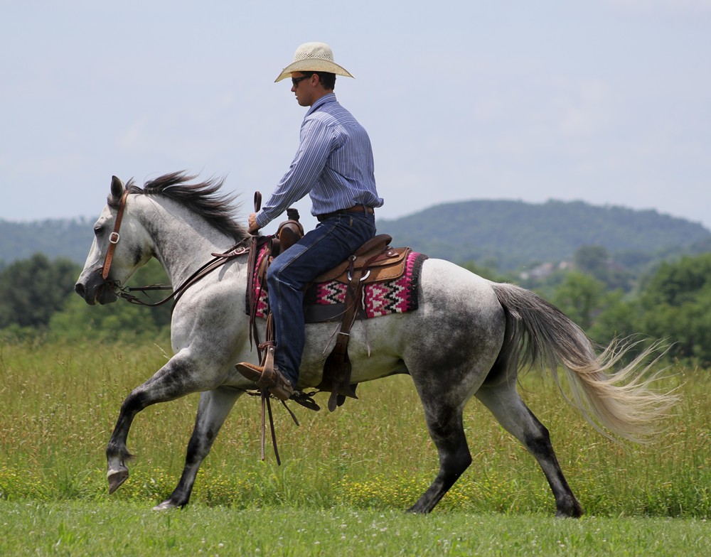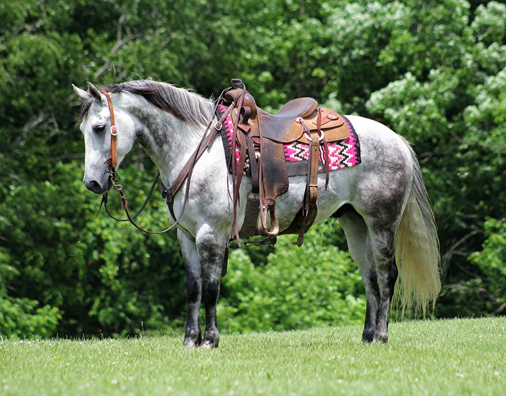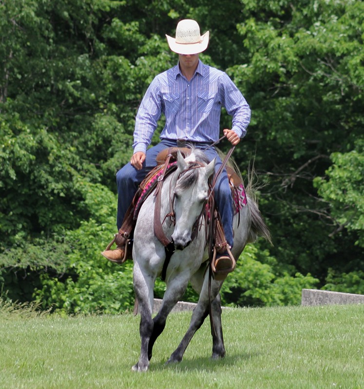 CJ Prestigious Tramp is a stout built 14.2-14.3hh, 9 year old, Dapple Grey Gelding. CJ is a well traveled horse that has seen big country from North Dakota to the Pacific Coast and he is very versatile horse! I have hauled him to team sorting events, took him out on jobs catching wild cattle with him, he will rope both ends out of the box… you name it and CJ can do it! He has worked on a ranch, has been trail ridden in 10 states and I’v used him at the stockyards to pen cattle on a few occasions. He will cross creeks, ditches, logs and navigate rough rocky areas. CJ has been used to sort and doctor cattle. He is “cowy” and knows his way around them. He is safe riding in traffic safe. He has a smooth jog, a nice lope, will slide stop, turns a circle both ways, sidepasses and backs with ease! CJ is a confident horse on the trails and will lead the crew, head out alone or follow behind with no issues! He has been exposed to all kinds of wildlife such as deer or turkey or other animals like cows or dogs and will go anywhere that he is asked too. He has been rode many miles in the mountains of Eastern Kentucky and encountered every obstacle possible on the trail. He will go up or down even the steepest slopes, across deep creeks, over downed trees, and over all types of rough terrain while still being sure footed. CJ is not cinchy, cold backed, does not crib or weave. If you’re looking for a REAL ranch horse that is ready to go do your job for you… Feel free to call Parker with any questions at 319-242-2815.