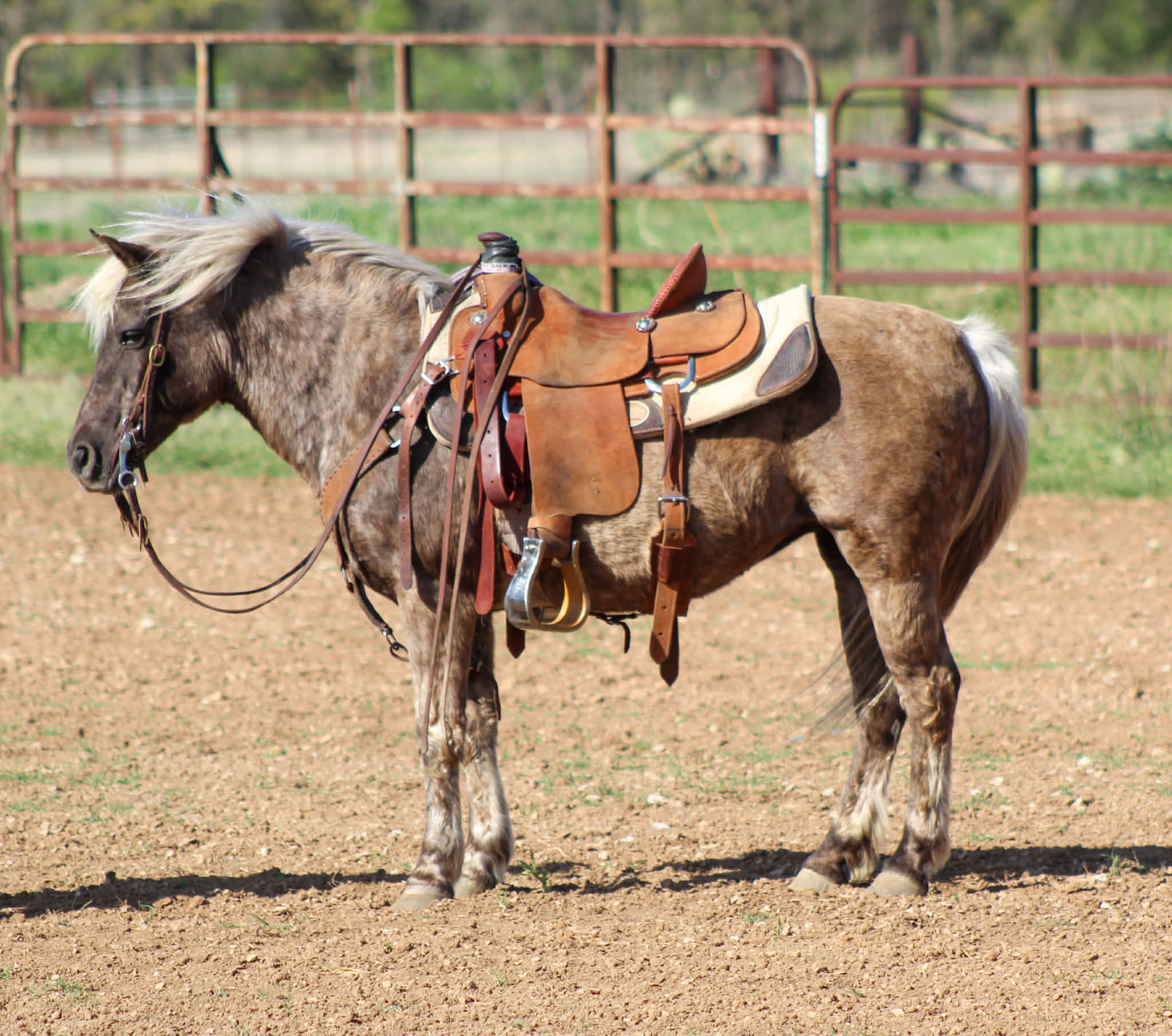 Coco Puff is a 10-year-old silver dapple pony mare standing 12.1 hands tall—the perfect size for young riders to learn and grow with. If you’re looking for a safe, dependable starter pony, she checks all the boxes. She’s the kind you can begin on the leadline and confidently let the kids progress on as they gain experience. This little mare has truly done it all. She’s been used around the sale barn penning cattle and has spent plenty of time out on the ranch with our boys. Coco Puff is naturally more “whoa” than “go,” making her a great confidence builder, but she’ll step up and go when asked. She’s happy to follow along behind dad’s big horse while gathering cattle or goats, and she’s just as comfortable heading out on the trail. Coco Puff rides out alone or in a group with no issues. She’s been exposed to just about everything—flags, tarps, and all kinds of ranch activity—and handles it with ease. She’s a kind, gentle pony with excellent ground manners. She’ll cross logs, water, and rough terrain without hesitation. Coco Puff has been ridden by both confident and timid kids and takes great care of her riders. With summer right around the corner, she’s the perfect pony to keep the kids outside, learning, and making memories. Need hauling that’s no problem we can set you up with haulers world wide to get Coco Puff anywhere in the country. Call or text Chris (254) 459-1046 with questions or set up a time to come see her. Located in Stephenville,Texas