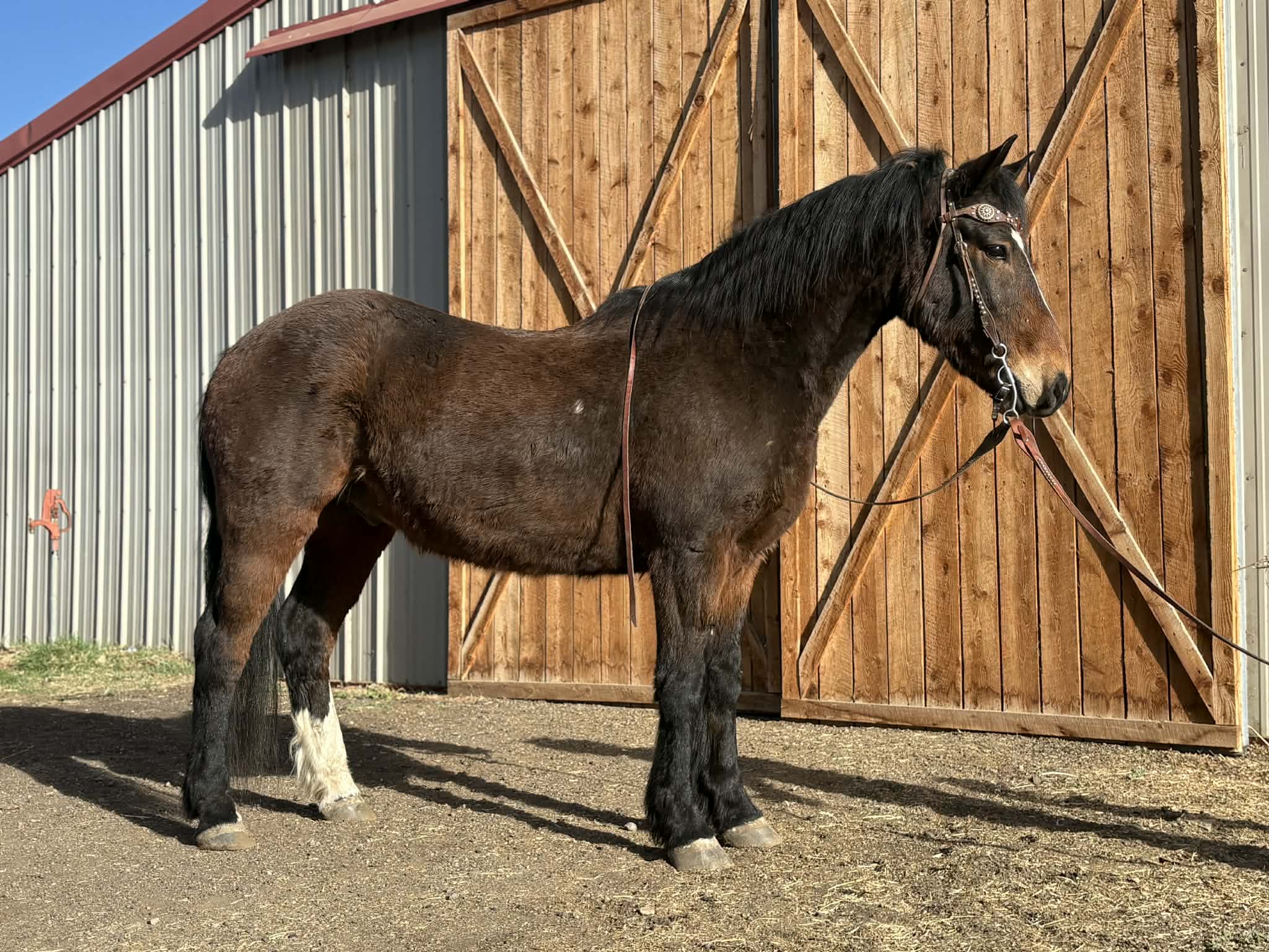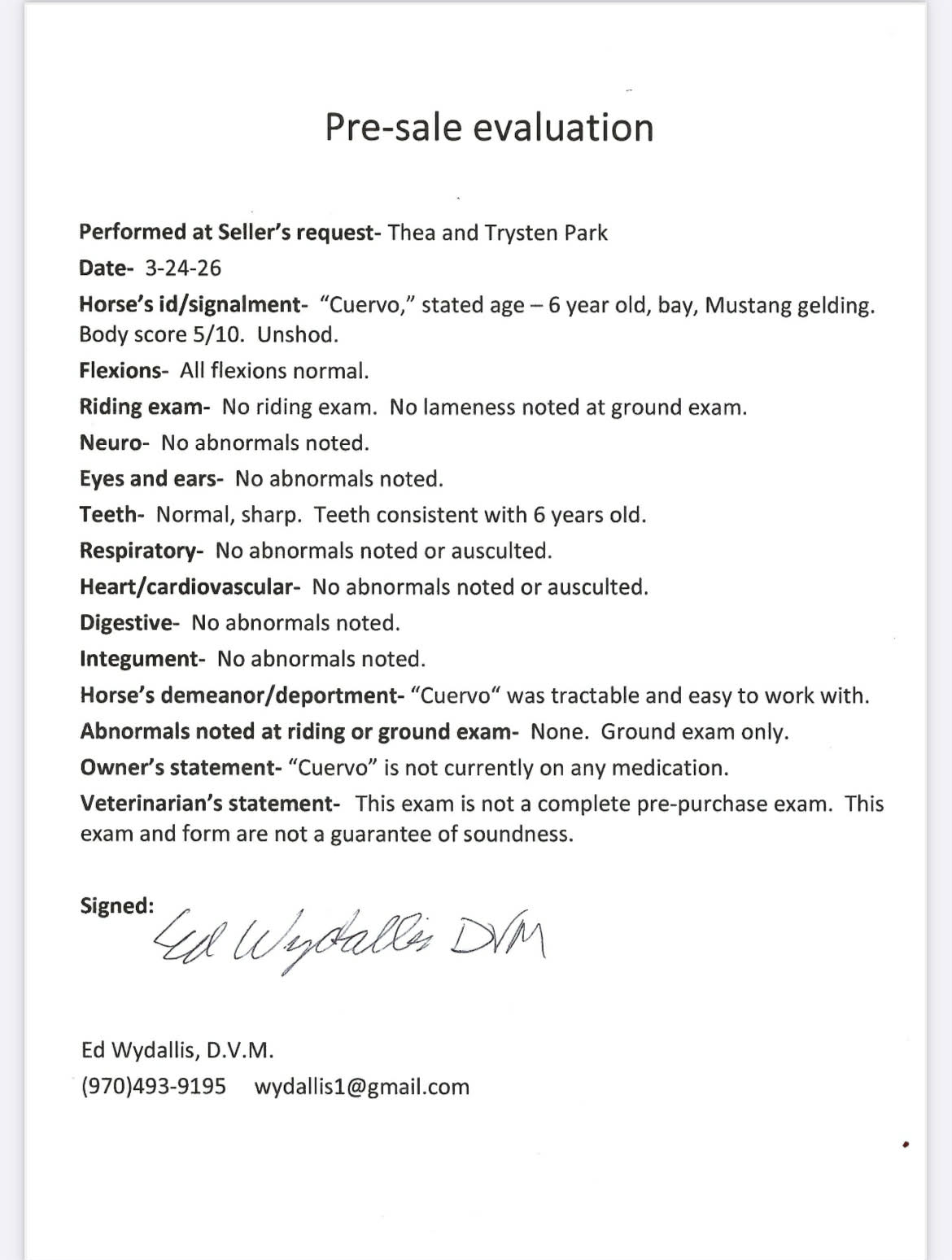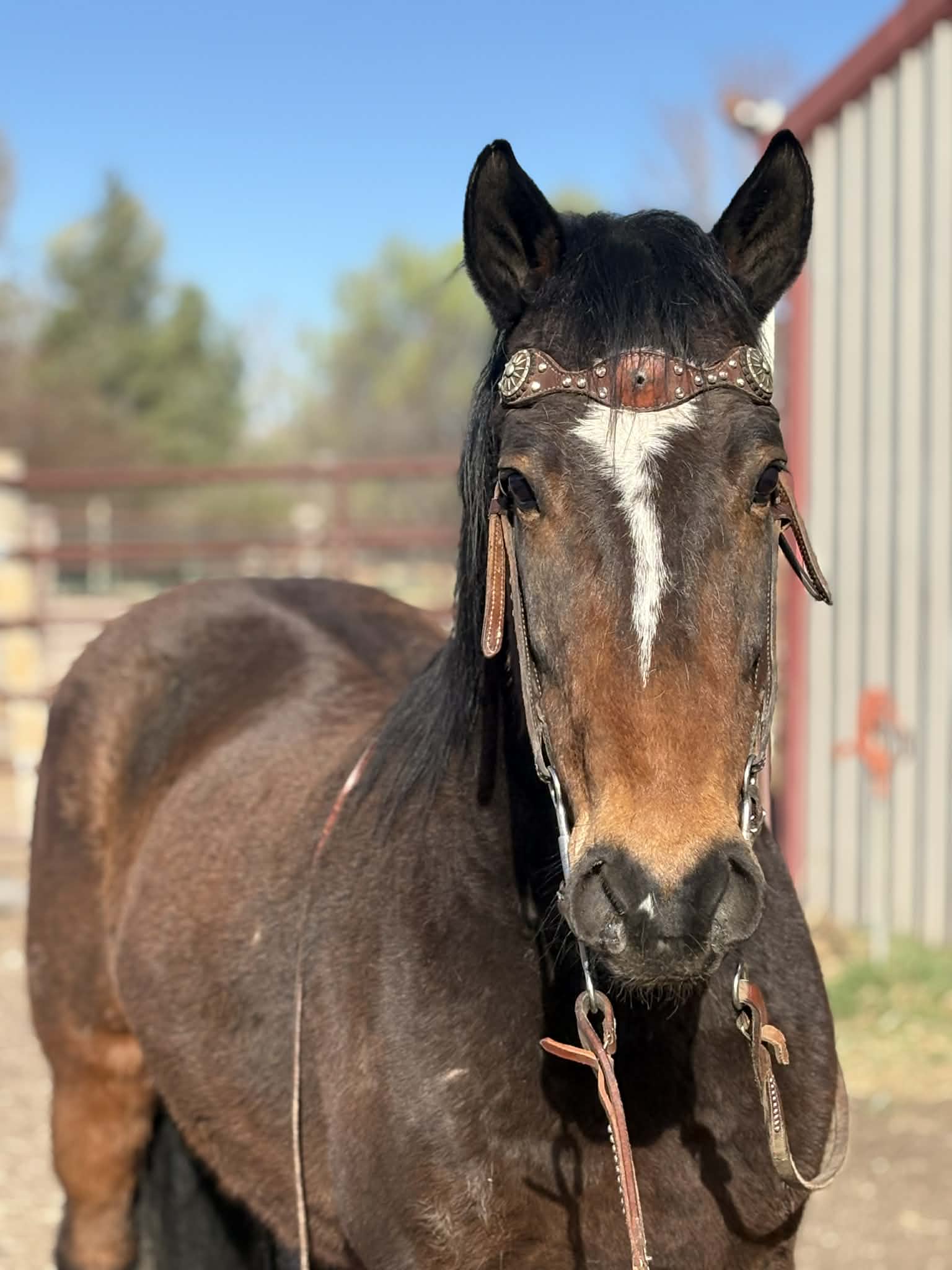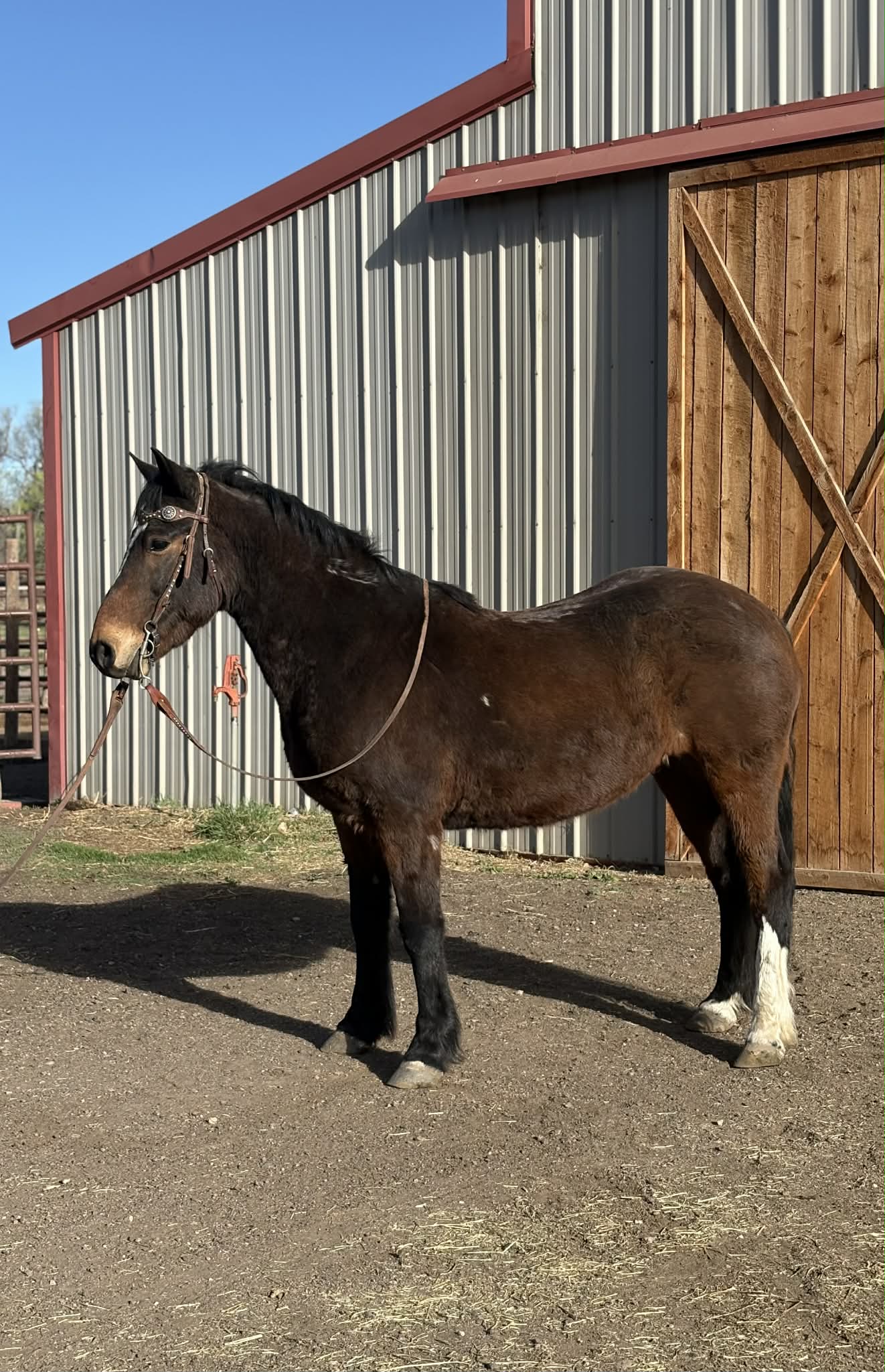 Cuervo is a 6-year-old bay mustang gelding standing at 14.1 hands, with a stocky build and eye-catching chrome markings that add to his charm. He’s got a bit of a nervous streak on the ground—he’s easily spooked of people on the ground and needs a calm, experienced handler who can approach him gently and confidently, because he might act like he’s seen a ghost every time you open his stall door. But once you’re in the saddle, Cuervo shines like a star. He’s incredibly smart, quick, and athletic—one of those rare horses that can really wow you with his skills. He’s free lunged over fences as high as 4’6” with ease, showing impressive power and grace. His agility is off the charts; he can spin tight circles that dig into the dirt, sidepass smoothly at all gaits (walk, jog, and lope), and turn faster on the rail than many cutters you’ll see out there. Cuervo can also perform six flying lead changes straight down the center line and stop instantly on command. On top of all that, he’s got a finished neck rein and responds beautifully to leg cues, making him a true pleasure to ride. He’s also seasoned on the trail, unfazed by bikes, runners, and even the chaos of downtown traffic. Bridges, lakes, rivers, tunnels—you name it, Cuervo’s crossed or gone through it without hesitation. The only real challenge with Cuervo is his nervousness on the ground, but if that wasn’t a factor, he’d be perfect even for the smallest riders, the more we work with him the better he gets and we truly believe with a forever person he will learn confidence on the ground as well. He’s genuinely a cool horse to ride and would be #1 on my list to keep if I had an extra spot for a personal horse. Come check him out and feel free to watch his video or get in touch with any further questions!