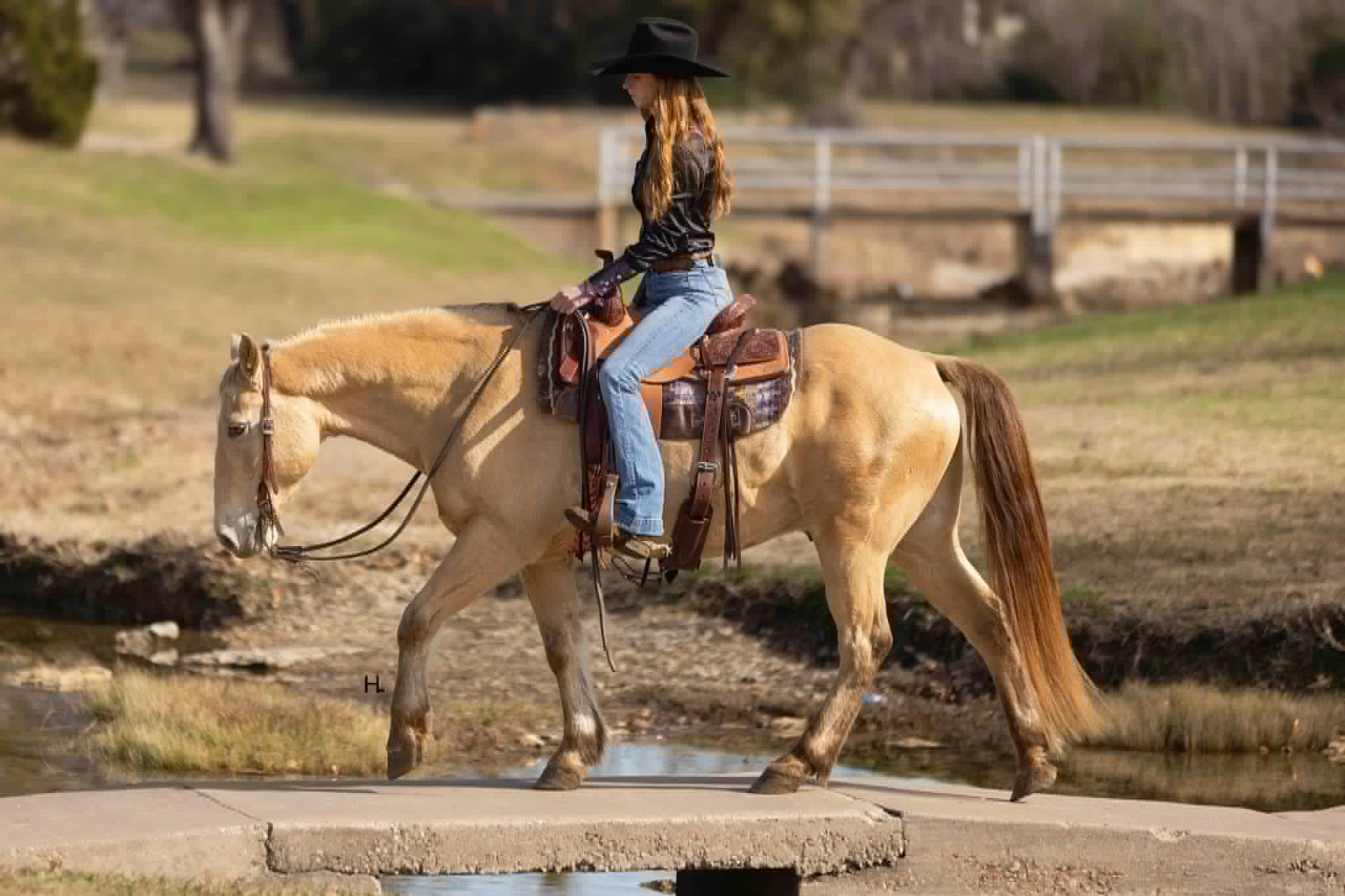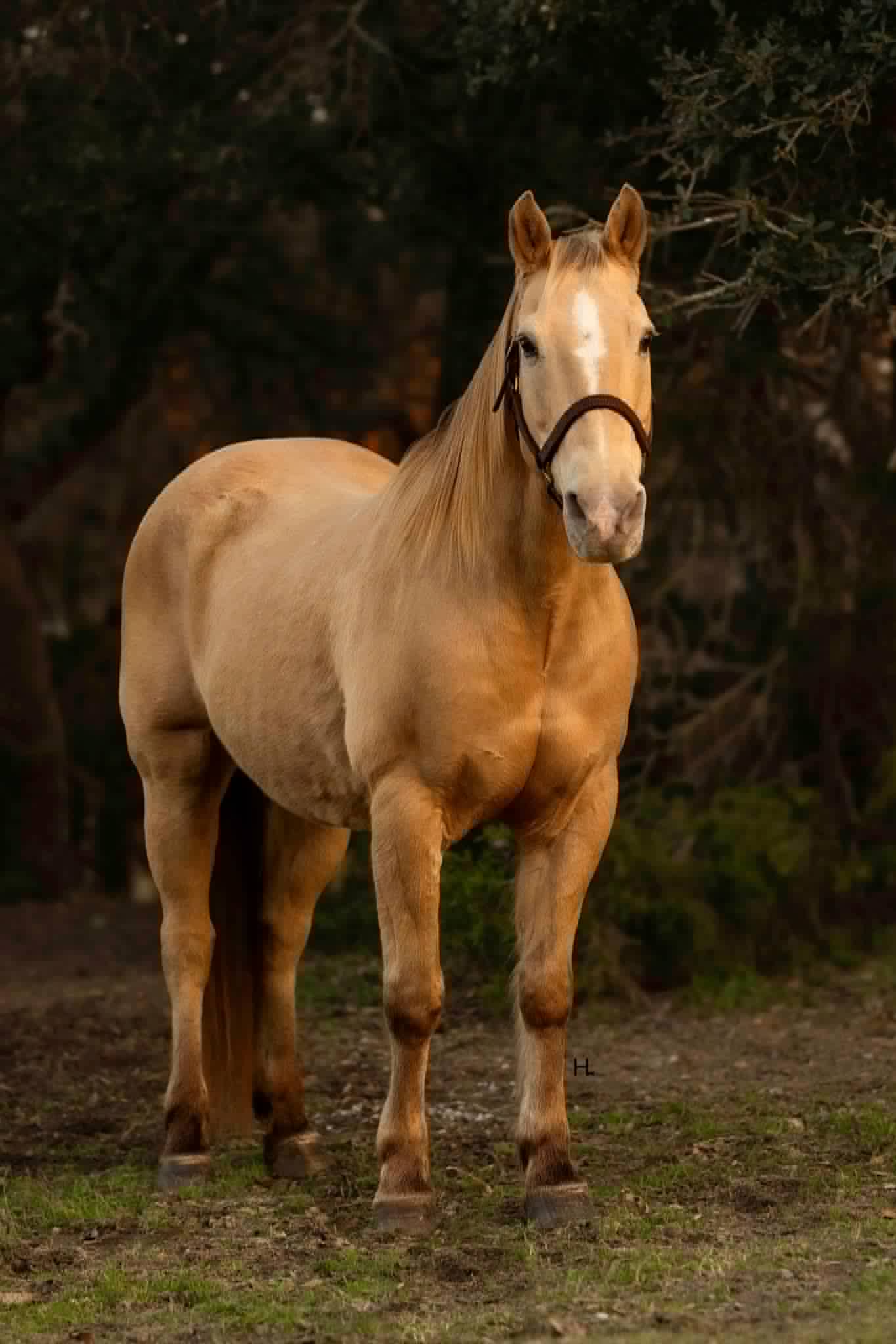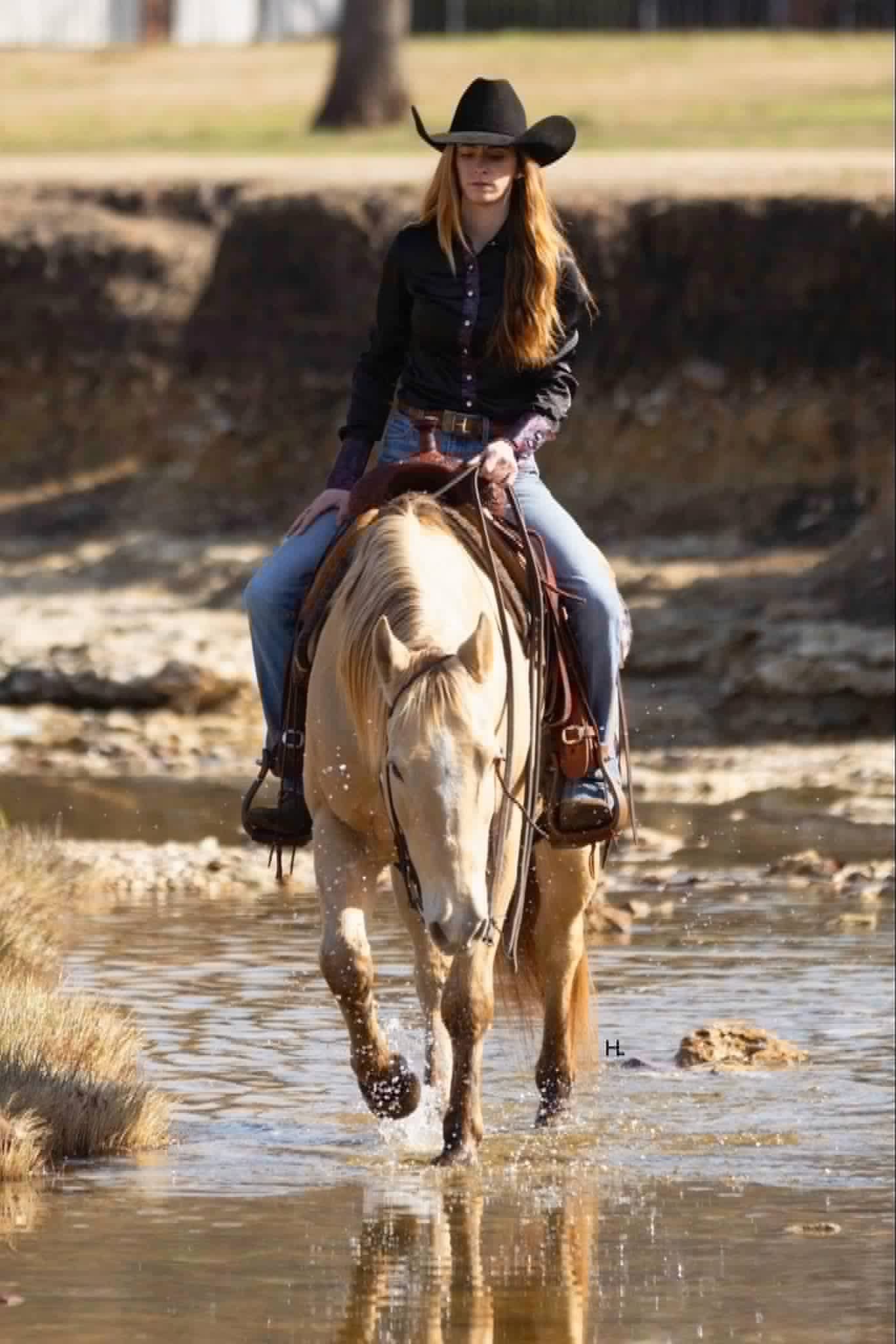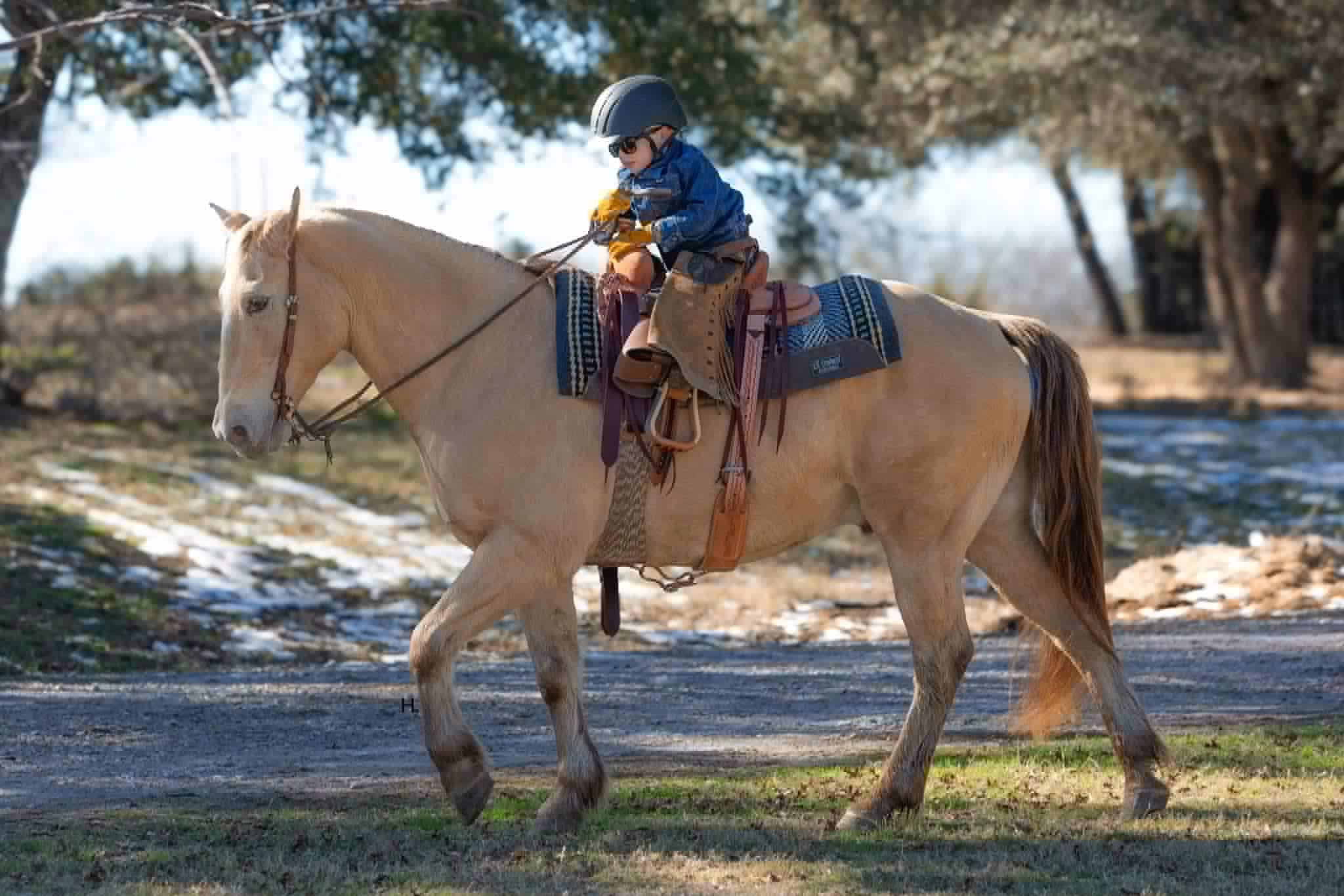 Let’s start the new year off with some champagne that’s safe and legal for everyone to enjoy and can be enjoyed on a budget! If you’re needing as close to an insurance policy in horse form as you can get, this is the guy. Dorado is 16yr old, 14.3hh, amber champagne gelding that’s the type you can throw anyone on and know they will be safe. From the trails to the arena he is unflappable, straightforward to ride, and will always be one of if not the most unique looking horse in the group. He’s the type that you can’t wipe the smile off your face when you’re riding him because he’s that fun. Dorado came across the southern border in 2018 and has been with the same family since here in Texas. He’s been used for basic ranch work (gathering/sorting/pasture roping) from south Texas to east Texas, used up at the sale barns, been trail rode everywhere in between, and has been the mount for the grandkids to ride around the ranch. Out on the ranch, Dorado makes even a long day enjoyable and go by quickly with his ground covering walk, his smooth trot, and his rocking chair type lope. He’s easy to use in the pens to sort some off and won’t object to the extra work if one needs roped. In the arena, Dorado won’t be the fanciest horse there but does everything with ease. He’s one hand broke, comes to a stop easily, will step right into a lope, picks up the correct leads, and won’t go faster than what’s asked of him. On the trails he’s the point and shoot type. There is nothing this gelding won’t cross and he has no problem making his own trail if you feel like going off the beaten path. Dorado is great with traffic, crosses all types of bridges, handles uneven terrain well, crosses water, and is pedestrian friendly. You can ride him bareback in a halter with no problems or ride him in any bit you want, ride him when it’s sunny and 75° or ride him in the freezing sleet and Dorado is going to be the exact same for it all. Our 3yr old little boy, who isn’t a super confident kiddo, has ridden Dorado a ton and Dorado has never made us question our boy’s safety no matter the conditions or where Stetson has ridden him at; whether it’s just above freezing with 20mph wind gusts, riding out in the open, or riding in a brand new location. Dorado has always been patient with Stetson and has always taken care of him. When it comes to how he handles time off, we know for a fact you can leave Dorado off for 2yrs, saddle him up, and he will ride off like he’s been being ridden everyday as the first time we rode him he had been off that long for no other reason than his owner wasn’t able to ride. Dorado is gentle to be around, stands tied like a gentleman for everything, will ground tie for the farrier, doesn’t object if you want to ride him double with a friend, will let you crawl all over, around, and under him without so much as shifting his weight, and loads right up in a trailer like one should. He’s as tried and true as they get in our opinion. Dorado has no bumps or scars on any legs, passed his recent health and lameness exam with flying colors, has never required any type of maintenance care, and has had no previous health or lameness issues. He has a ton of bone with fantastic, hard feet that he’s always been barefoot on with no issues no matter the terrain as well. Dorado is UTD on all care from teeth to feet and has a recent health exam on file that can be viewed on his page on our website. This is a nice, solid gelding ready to give someone confidence in the saddle or just be the horse you can always rely on. We invite you to come see and try Dorado at our place in Weatherford, Tx. PPEs are always welcome and we can help set up hauling to wherever you call home. For any questions and to talk about if Dorado is right for you, you can contact H Spur Performance & Versatility Horses Sarah 817-366-6123. To see more pictures, nearly an hour’s worth of videos, and to view Dorado’s Health Exam you can visit his page on our website at www.hspurhorses.com/dorado