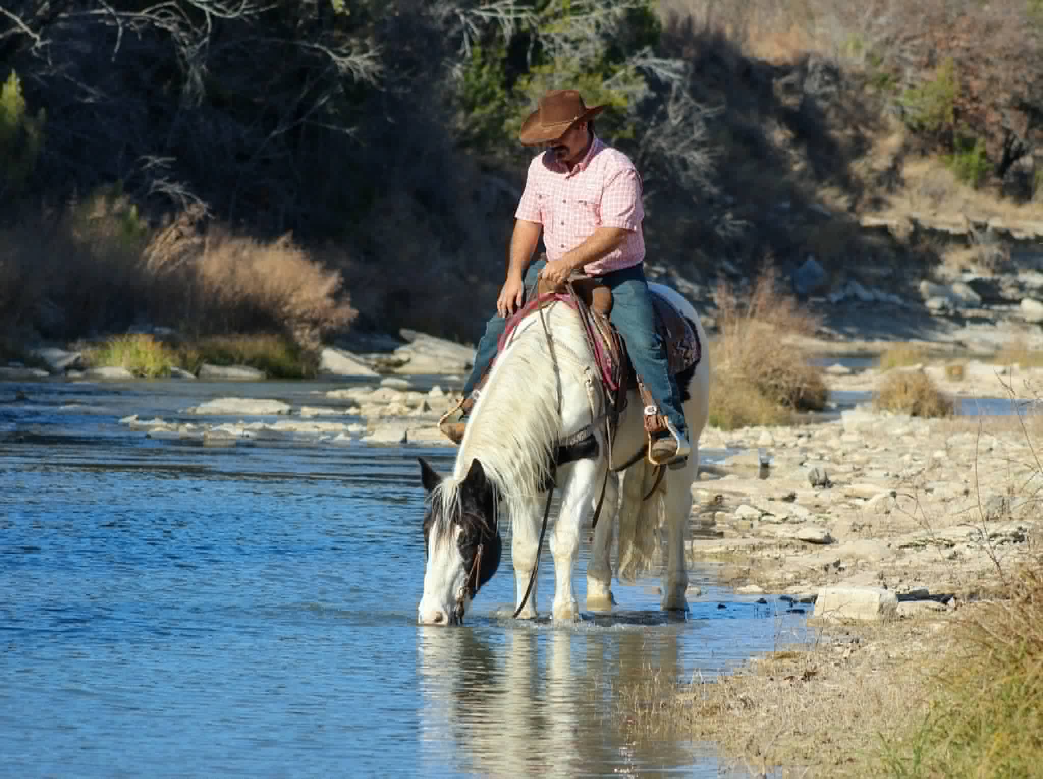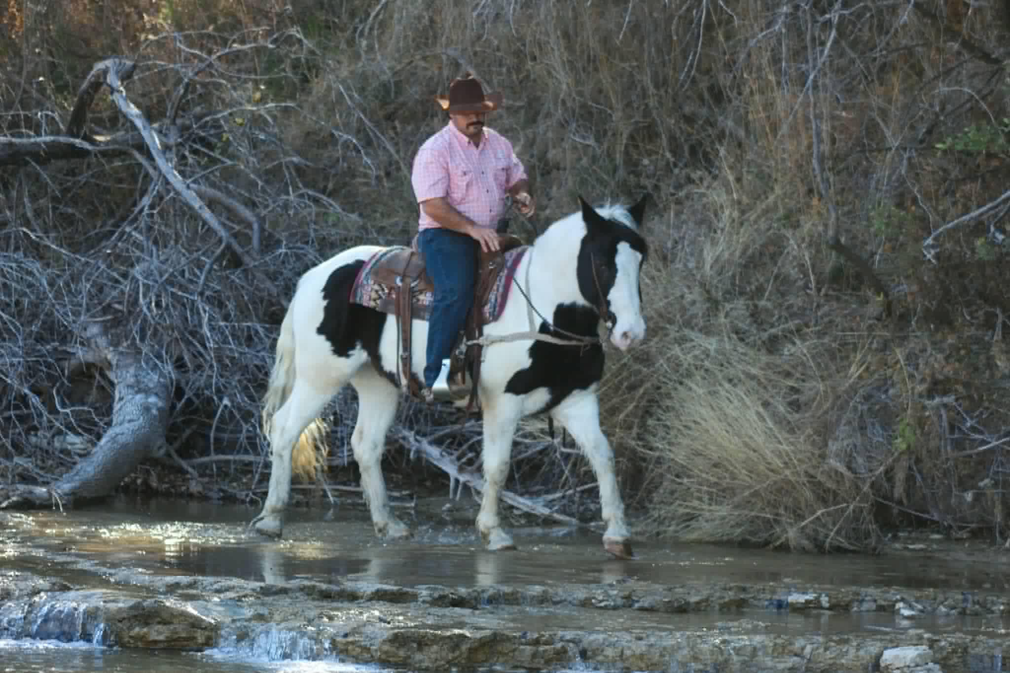 This gelding is as seasoned as they come. He’s sure-footed in the roughest terrain, confidently crosses creeks, rivers, bridges, logs, brush, and obstacles without hesitation. Duke has been ridden extensively in traffic and proved himself beyond his years during his first trip to the Fort Worth Stockyards on a busy Friday, taking crowds, carriages, loud music, and heavy traffic completely in stride.