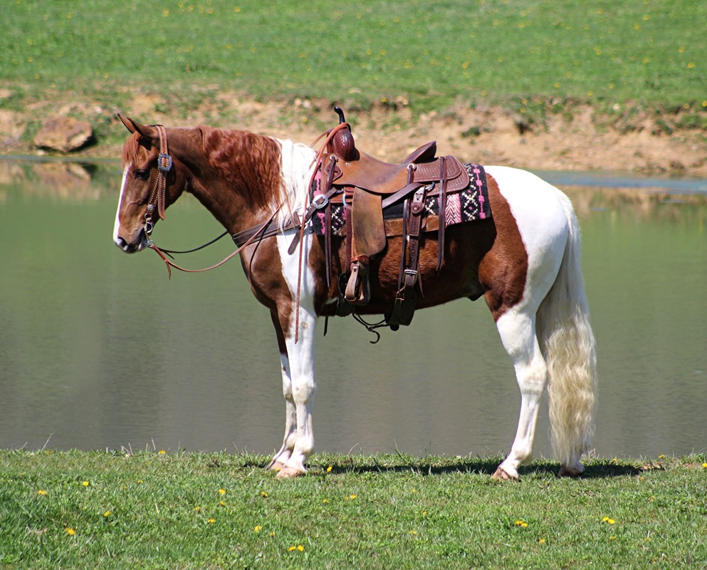 Elijah is a 15hh, 7 yr old, Chestnut Tobiano Gelding! He is built like a tank! He has miles and miles of experience and is ready for some more! Elijah has been camping in multiple states, trail ridden at large campgrounds and has been on week long camping trips. Elijah is easy for me to catch, clip, bath, tack-up, load, and handle. He has a natural smooth 4-beat gait that covers the ground with ease. No matter where he goes or what he does, Elijah is not spooky acting. On the trails he is always great! He has been exposed to all kinds of wildlife such as deer or turkey or other animals like cows or dogs and will go anywhere that he is asked too. He has been rode many miles in the mountains of Eastern Kentucky and encountered every obstacle possible on the trail. He will go up or down even the steepest slopes, across deep creeks, over downed trees, and over all types of rough terrain while still being sure footed. He has been rode in traffic, and is very traffic safe around cars, semi, log, and dump trucks. He has a great personality and a great attitude about whatever he is asked to do. Feel free to call Korey with any questions at 606-310-6341. Located in Whitley City, KY.