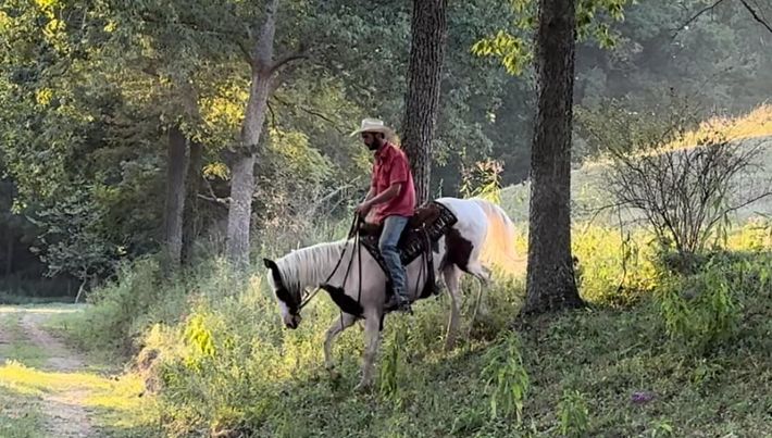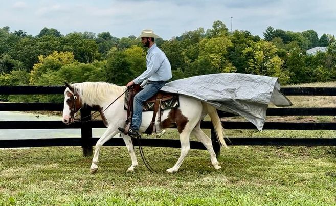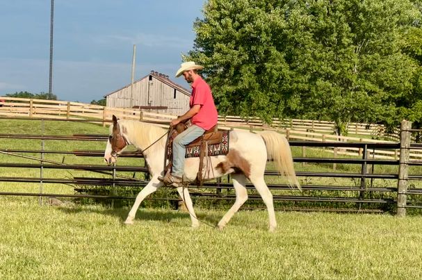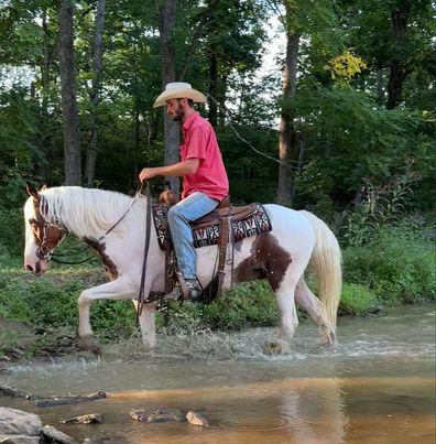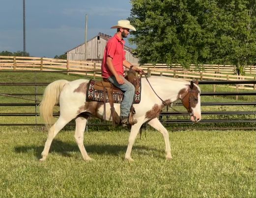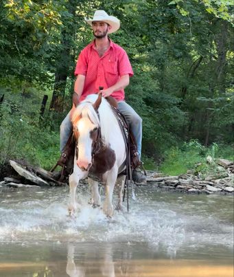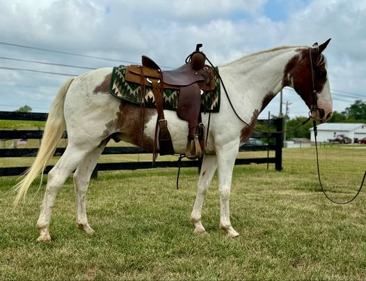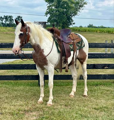 Fritz is an eye catching bay roan and white pinto gelding. He is 10 years old and stands 14.3 hands. He is a very stocky and stout made gelding! If you’re looking for a laid back gelding to hit the trails with or to do some light arena work, Fritz is your man! He rides out alone or with a group. He is a very experienced trail riding horse. He will step quietly over logs, he drops down hills easily, and will walk over a ditch like a gentleman. Fritz is not a spooky gelding. He is not frazzled easily, even if younger or less experienced horses get worried over something. He stands nicely when it’s time to take a snack break on the trail. He walks, jogs, and lopes well. Fritz stands grooming, saddling, and mounting. He trailers well and handles new places with grace. Fritz is traffic safe. He is quiet and gentle enough for all levels of riders! If you just want to jump on and have fun bareback with a halter and lead rope, he is comfortable to do that too. In addition to riding, Fritz has been driven to the wagon as a team. He will stand to harness and hook with no issues! His quiet demeanor is hard to find, and that’s what we love the most about him! For more information, please call Sammi Waugh 704-798-5497. Located in Brooksville, KY.