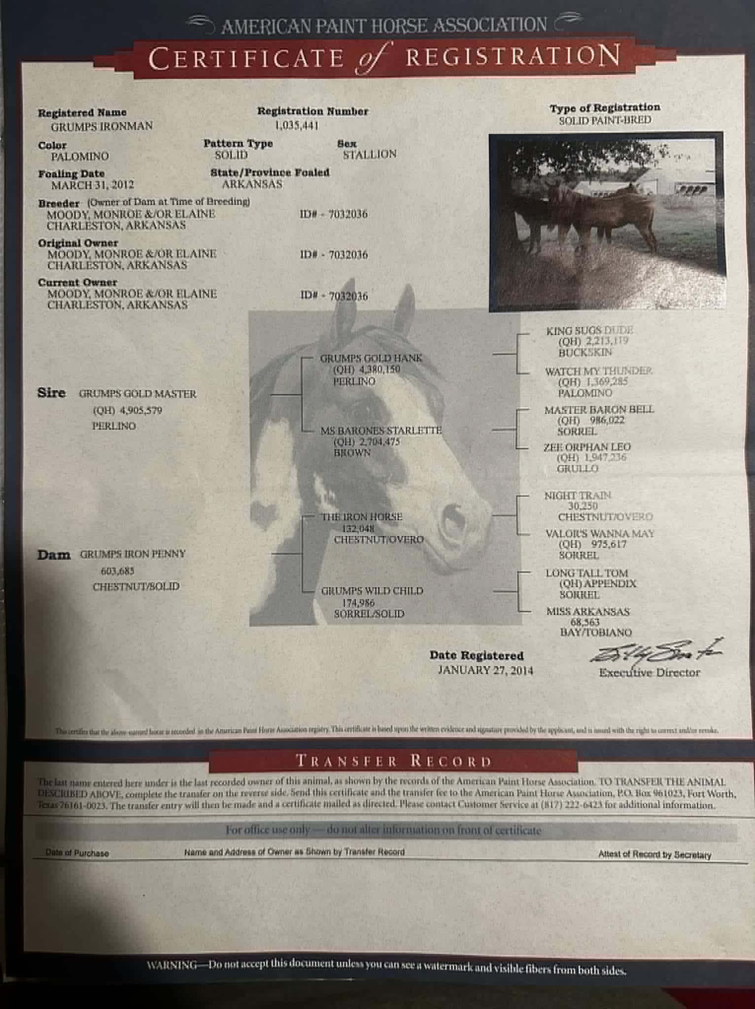 If you’re on the hunt for a calm, cool, and collected equine partner, look no further—Grumps Ironman, affectionately known as Oliver, is your guy! This handsome 2012 model registered APHA gelding stands a sturdy 15.1 hands tall and is simply a joy to be around. Oliver is the epitome of safe and reliable. No matter what you’re doing, this super docile and easy-going fella is always there for you. He’s been trail riding for countless miles in the beautiful Ozarks and all across Texas, and he’s seen it all without a worry. Whether it’s crossing rivers and streams, tackling hills, or navigating bridges and downed logs, Oliver handles everything like a pro. He is gentle and trustworthy 365 days a year, making him perfect for the whole family to enjoy. He will carry a flag, been to numerous parades, and has been used to move cattle. Want to light some firecrackers or shoot a gun? No problem! Oliver handles that no problem. He’ll walk, trot, and lope circles with a smooth, effortless gait that makes riding a true pleasure. Picture yourself cruising down the trail with a cold drink in hand—Oliver is the perfect partner for that! He’s also great with heavy traffic and bustling crowds. Just ask him about his adventures down Exchange Ave at the historic Fort Worth Stockyards! With horse-drawn carriages, crowds of people and loud music all around, Oliver took it in stride like a seasoned pro. This laid-back guy is a true unicorn—gentle from the ground to his back. Oliver is the best insurance plan you can find when it comes to having a safe and enjoyable ride. He just got a fresh set of shoes and is ready to hit the trails! He stands tied, bathes easily, is great for the farrier, and loads and unloads from the trailer with zero issues. So, if you’re looking for a horse that embodies calmness and reliability, Oliver is the one for you! Come meet him and see for yourself what makes him so special! Contact M$ Performance Horses to come try him, or we can set up a FaceTime call at 661-817-9120 Located in Stephenville, TX. If you need help with transport don’t hesitate to ask we have a list of reputable haulers that can get him safely to your doorstep WORLD WIDE including, Alaska , Mexico, Hawaii and Canada.