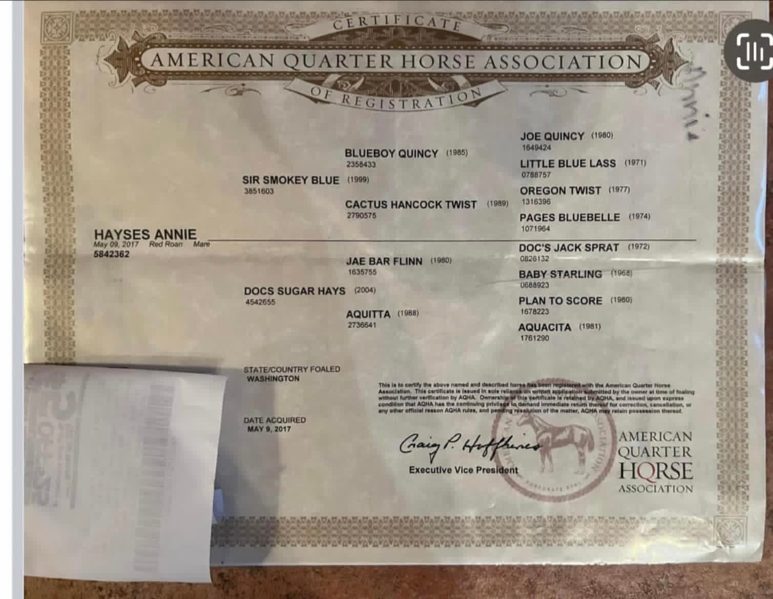 Meet Hayses Annie, a striking 2017 AQHA red roan mare with the kind of foundation pedigree and color that turns heads in and out of the arena. Bred from powerhouse cow-horse lines including Blue Valentine, Joe Quincy, Doc Bar, and Hancock, Annie is a stellar broodmare prospect who’s also broke to ride and currently being worked 5-days a week.