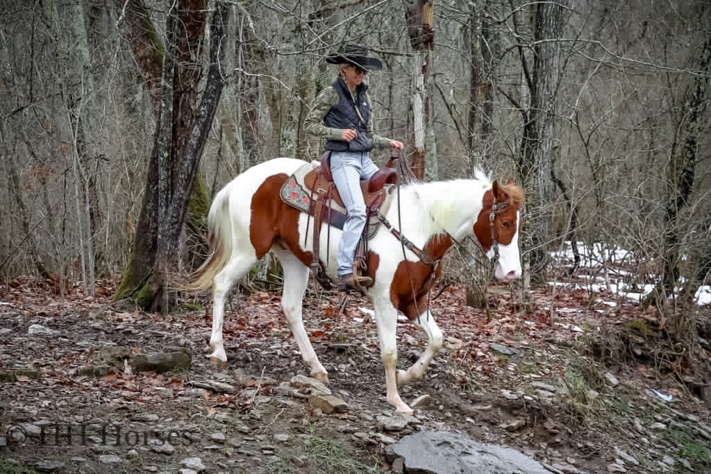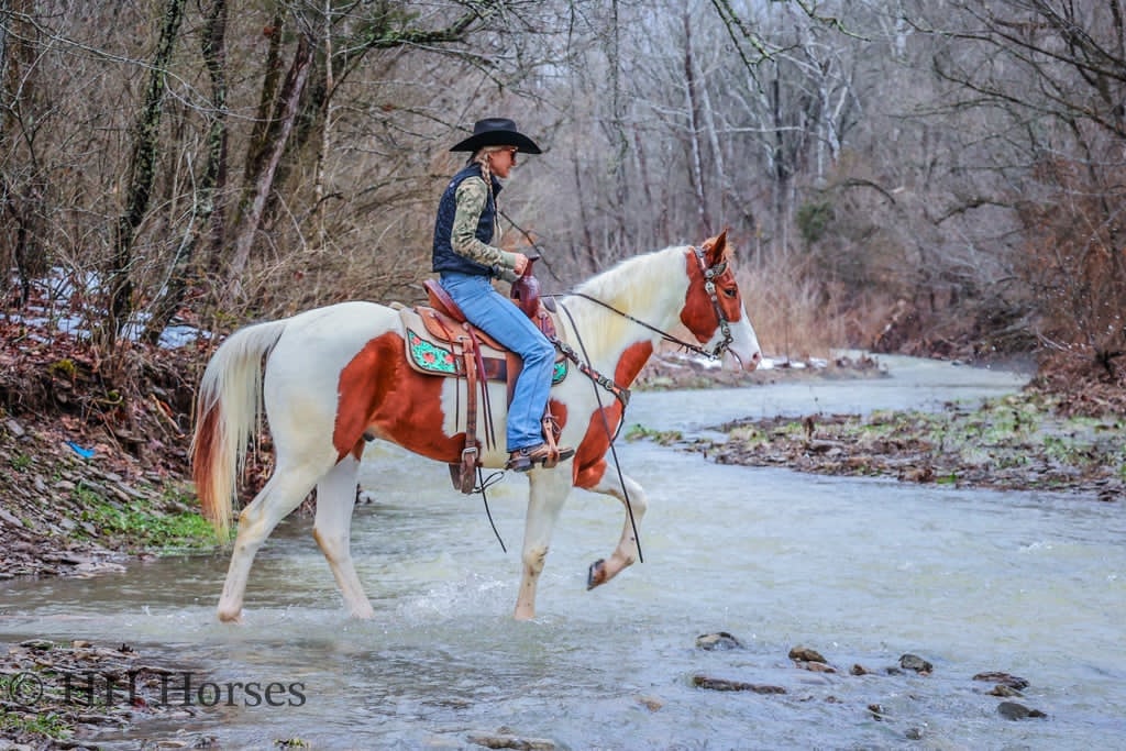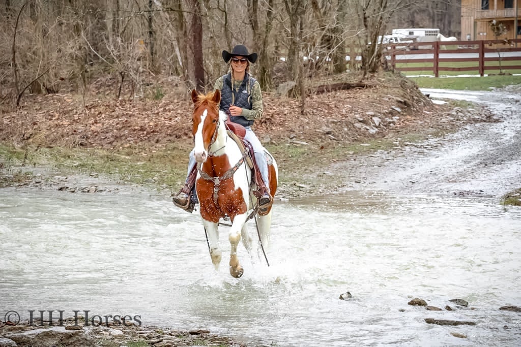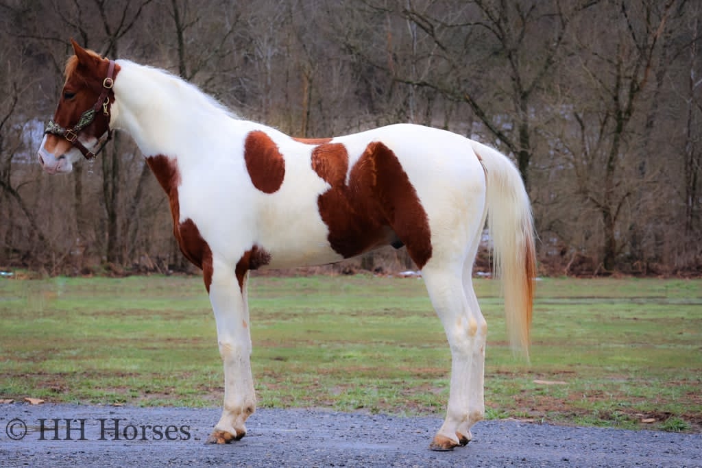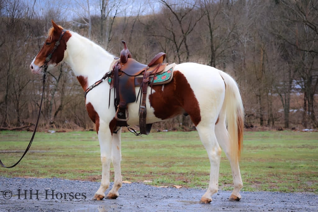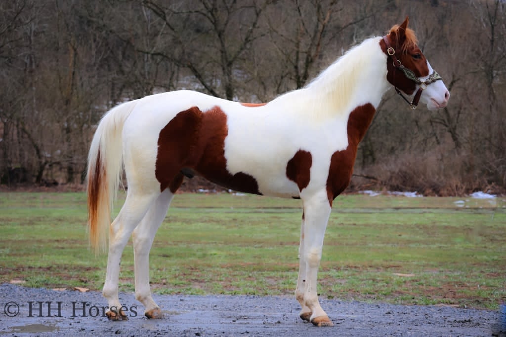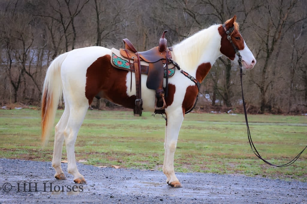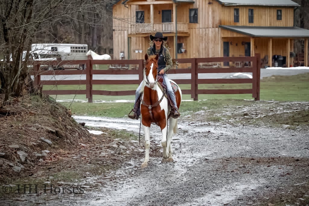 This is “MACARONI”, a big 16 hand SORREL & WHITE TOBIANO PAINT GELDING that is 4 years old. This nice young gelding has been on the trails and ridden in the arena English and Western. He has been out in the woods, through the water, and up and down the rocky embankments. He is a smart, big, young horse with lots of natural ability and sense. He would excel in any performance discipline and he is well on his way to be a great trail mount. He goes out alone, been on the main roads, and has a nice way of traveling. He aims to please and will ride in the snow, ice, and mud without an issue. He bathes, hauls, stands tied, and loads with no fuss. Located in Flemingsburg, KY. Contact HH Horses Erin 304-238-4155.