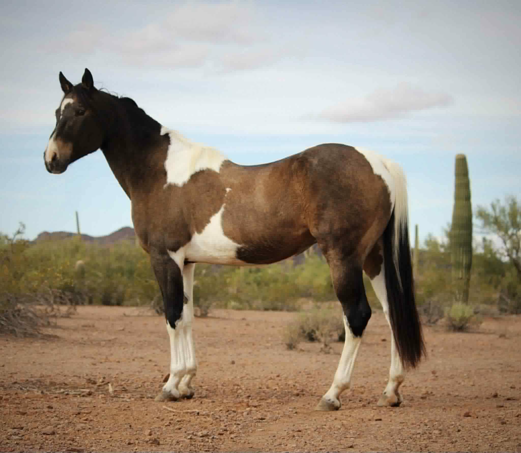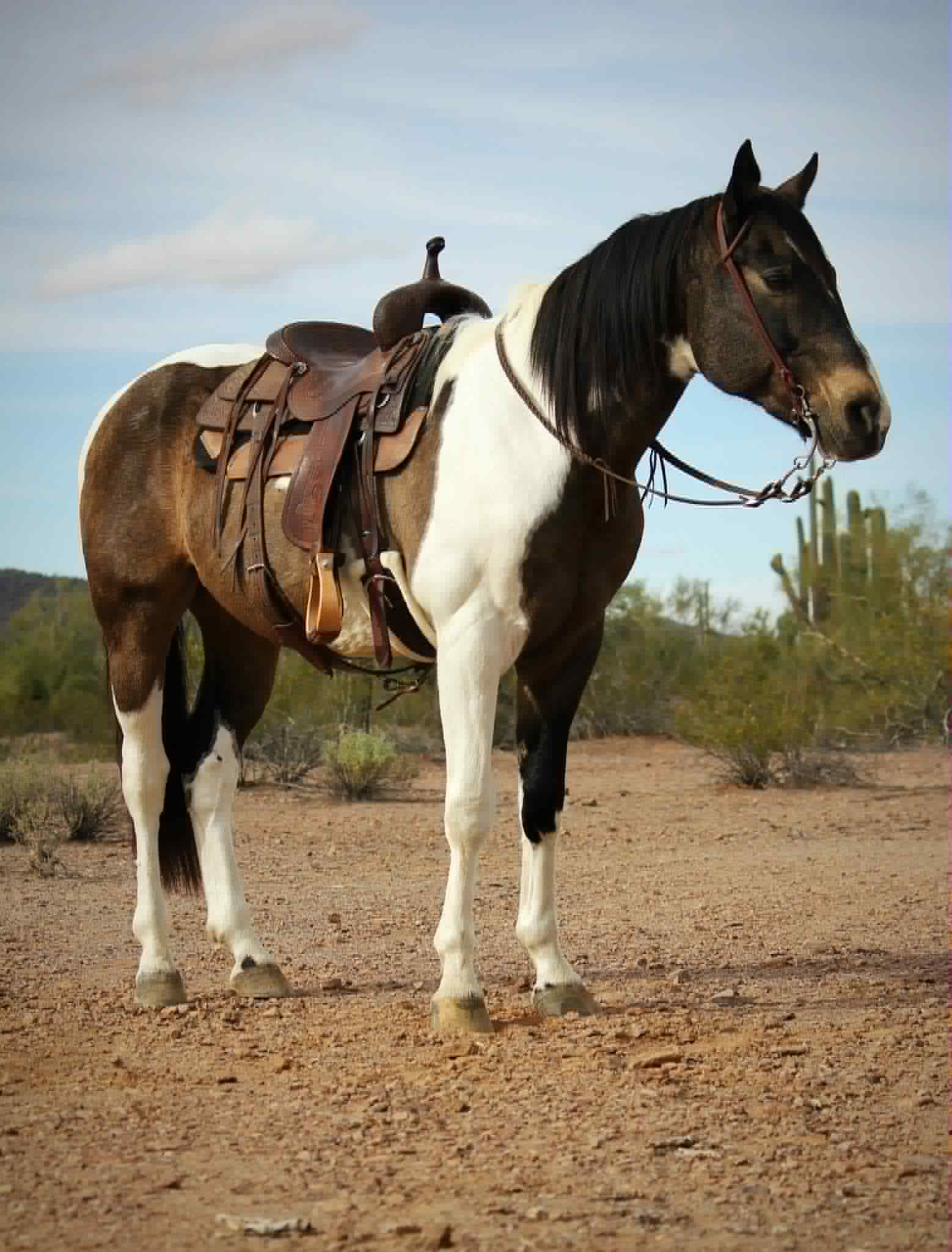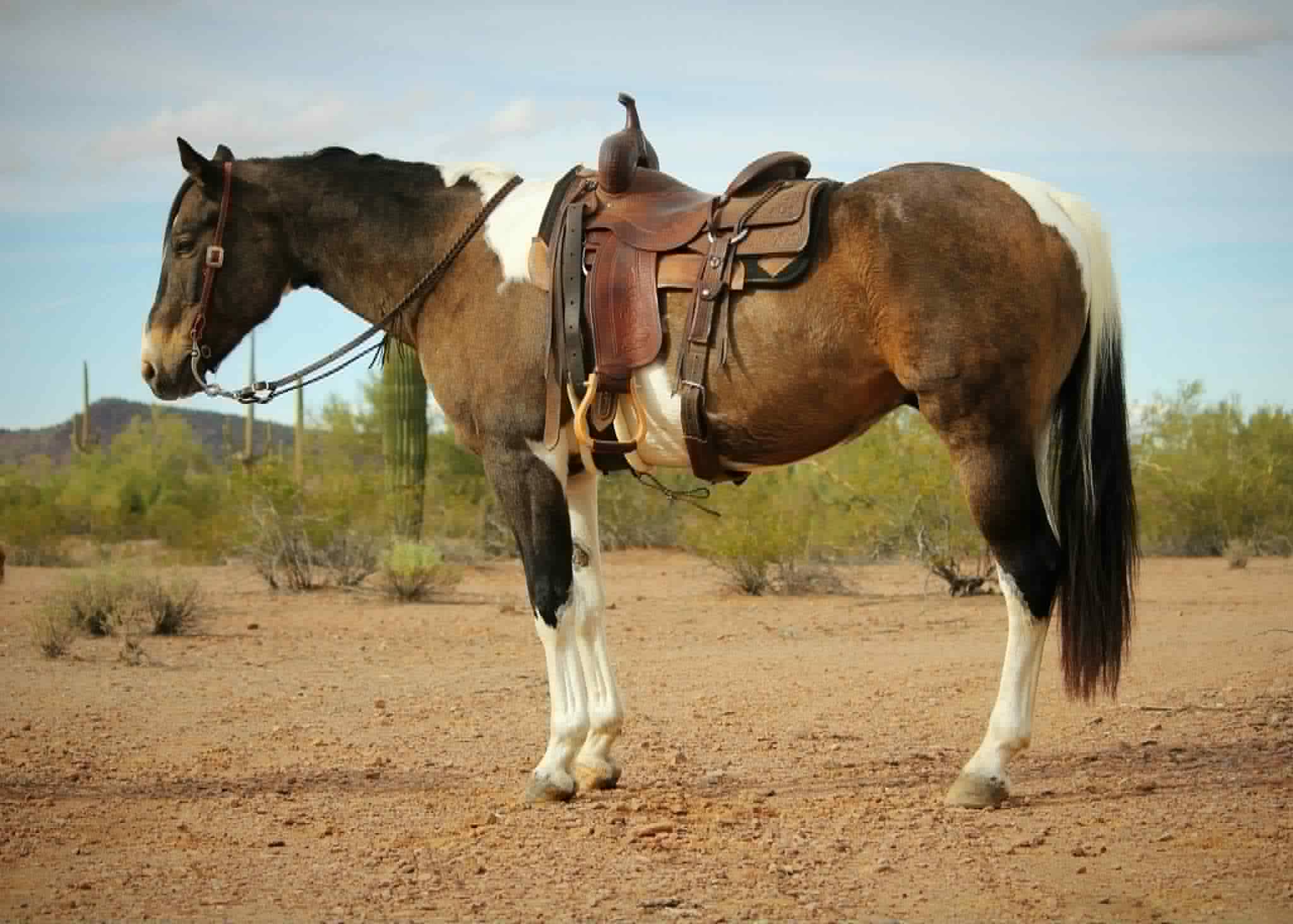 Flashy and sweet!! Mickey is a gorgeous 15 year old buckskin paint gelding standing a stout 15.3 hands tall wearing a size 1 shoe. Mickey is a finished head horse, he is good in the box, scores well, and knows his job when it’s time to rope. He has been hauled to jackpots and would also make a great practice horse at home. He neck reins, has a good stop, and is responsive and moves off your leg very well. He is more go than woah but doesn’t have a mean bone in him. Mickey has also been trail ridden and is happy to go out alone or with others. He’s been used on the ranch to push cattle and check fence. On the ground Mickey is a total love bug. He always has his head over his stall waiting for attention and love from his people. He stands tied, bathes, loads and hauls well. He gets along great with other horses and is even stalled next to our stallion here. Mickey would do best with a quiet and confident rider as he is responsive to your aids and not a dull type of horse. He is sound with no maintenance. Mickey does have a very mild sway back, but it does not affect his soundness or performance at all. This sweet boy is ready to be someone’s number one best friend! He is located in Marana, Arizona and we are happy to help arrange transport anywhere for him. Please feel free to call or text Claire Siebols with any questions about Mickey at 435-899-0508