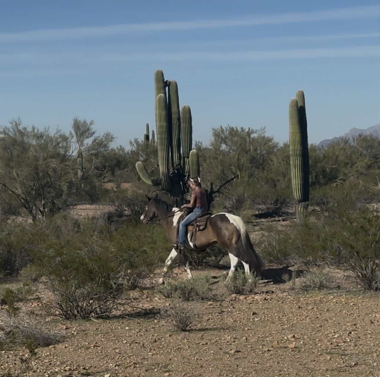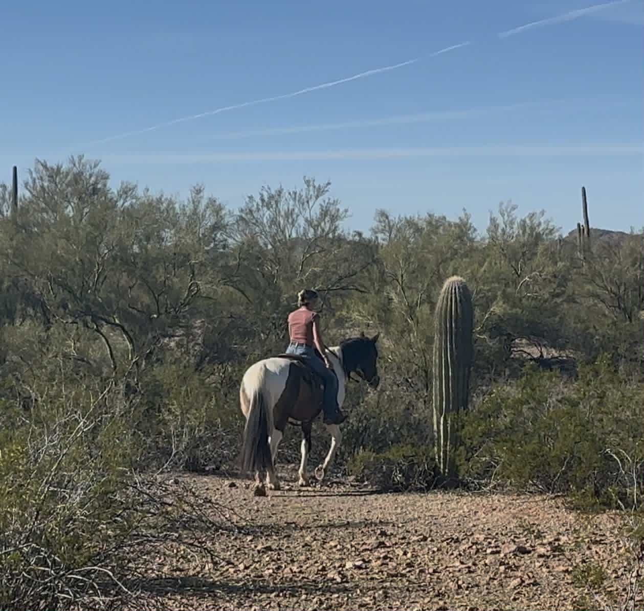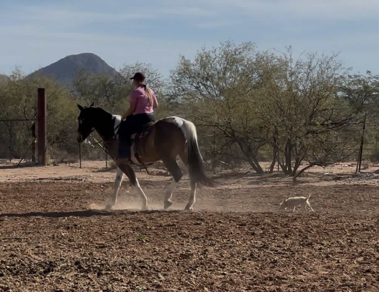 Flashy and sweet!! Mickey is a gorgeous 15 year old buckskin paint gelding standing a stout 15.3 hands tall wearing a size 1 shoe. Mickey is a finished head horse, he is good in the box, scores well, and knows his job when it’s time to rope. He has been hauled to jackpots and would also make a great practice horse at home. He neck reins, has a good stop, and is responsive and moves off your leg very well. He is more go than woah but doesn’t have a mean bone in him. Mickey has also been trail ridden and is happy to go out alone or with others. He’s been used on the ranch to push cattle and check fence. On the ground Mickey is a total love bug. He always has his head over his stall waiting for attention and love from his people. He stands tied, bathes, loads and hauls well. He gets along great with other horses and is even stalled next to our stallion here. Mickey would do best with a quiet and confident rider as he is responsive to your aids and not a dull type of horse. He is sound with no maintenance. Mickey does have a very mild sway back, but it does not affect his soundness or performance at all. This sweet boy is ready to be someone’s number one best friend! He is located in Marana, Arizona and we are happy to help arrange transport anywhere for him. Please feel free to call or text Claire Siebols with any questions about Mickey at 435-899-0508