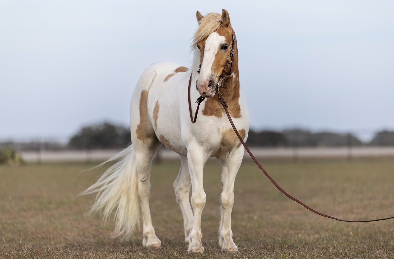 Meet the kind of horse that makes people stop mid-sentence when he walks by. With the unmistakable look of a Gypsy Vanner wrapped into a handy 14-hand package, this 6-year-old pony cross has the feather, presence, and soft expression that feel straight out of a storybook — but with the versatility to be a fun, practical partner in the real world. He has a good start and is ready to be finished out, giving someone the opportunity to take him in the direction they choose. He has been ridden Western, but his movement and natural balance really suggest he could excel in an English program for someone wanting a unique and eye-catching mount. Temperament-wise, he’s a thoughtful horse who takes in his surroundings. He isn’t the pushy, in-your-pocket type and tends to be more independent in the pasture rather than the first one at the gate — but under saddle he’s willing and tries to do his job. He has been out on the trails and does well when he has a confident rider giving him direction. He’s also been exposed to the atmosphere of team ropings, quietly helping push cattle up the alley, and has handled that environment with a level head. Because he’s still gaining experience, he’s best suited for a handy youth or adult who appreciates a kind, sensitive horse and enjoys developing a partnership, rather than a total beginner or small child. He’s the type that offers a rewarding ride for someone who enjoys bringing one along — eye-catching enough to stand out anywhere, but with a kind mind that wants to get along with his person. If you’re searching for something unique, versatile, and full of potential — a horse you can truly make your own — he’s ready for his next chapter.