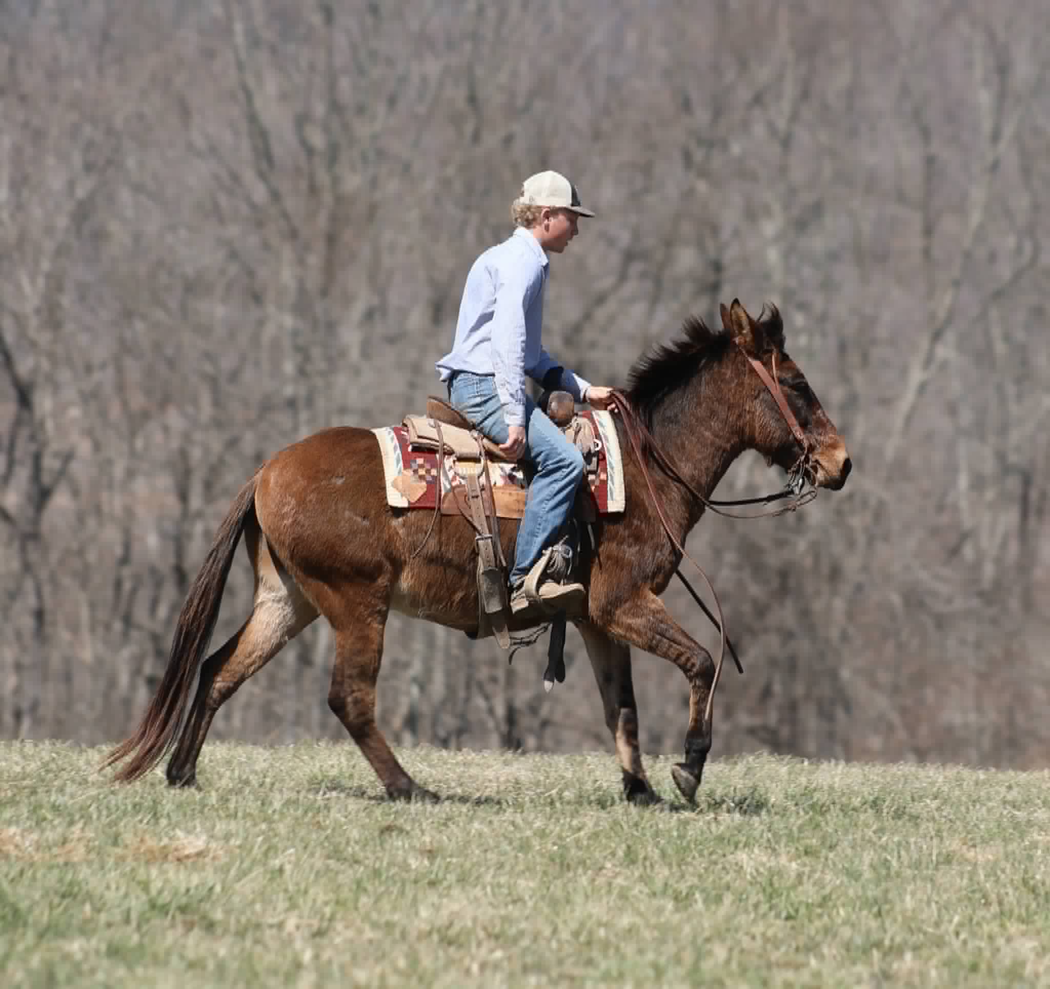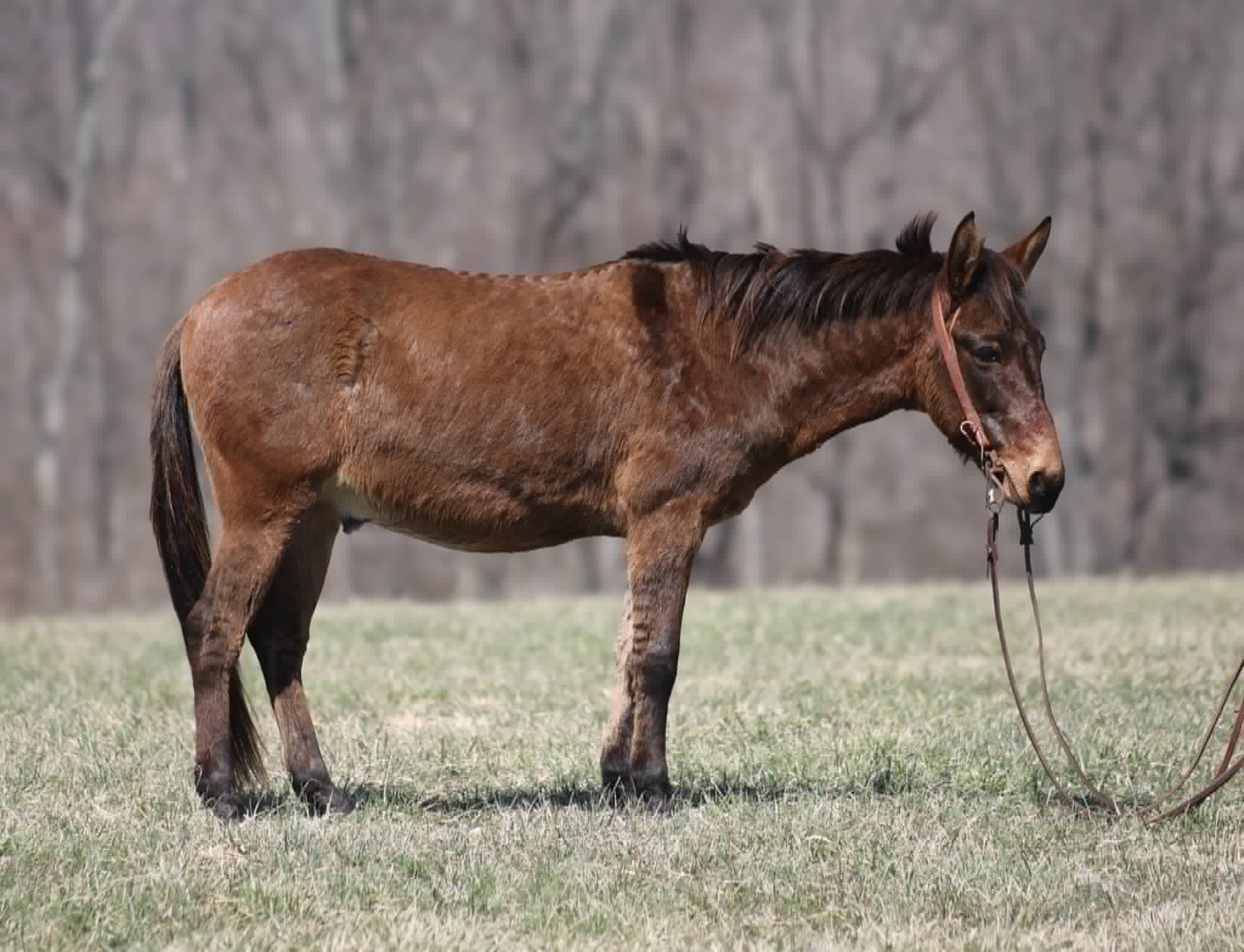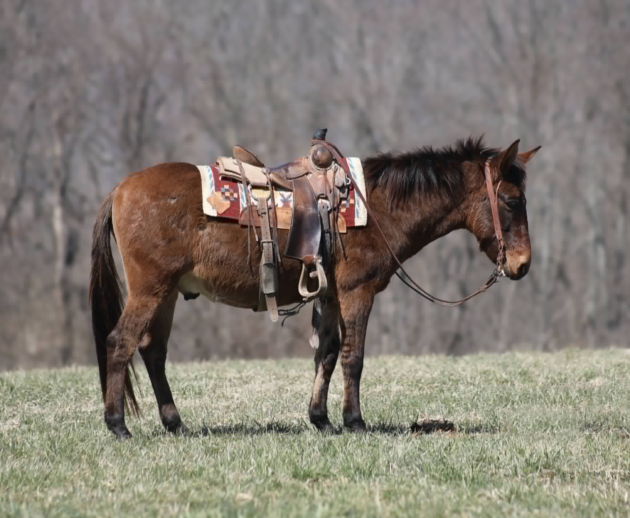 Parker is a 13.2H, very stout built, 9 year old, Dun John Mule with Tiger stripes on his legs and he is one LAID BACK dude!!! Parker is quiet and gentle. He is great on trails, he rides through rough rocky terrain, dead fall, thick brush, deep water, you name it and Parker will go on through it while being surefooted. He has been used to coon hunt off of after dark, he has leg dogs and had guns shot off of his back. Parker is 100% content to just plod along slow and easy down the trails and is totally safe for timid or beginning riders. He is a great mule to help build someone’s confidence! Parker is safe on the highways and has been ridden around cows. I have started teaching him to lay down. He is easy to tack up, no issues with his ears or with his feet. Parker has been a joy to have around and he is sure to be a joy for his new family. Located in Brodhead, KY. Contact Moore Trained Horses Logan 765-265-0033 with any questions or to make a buy it now offer.