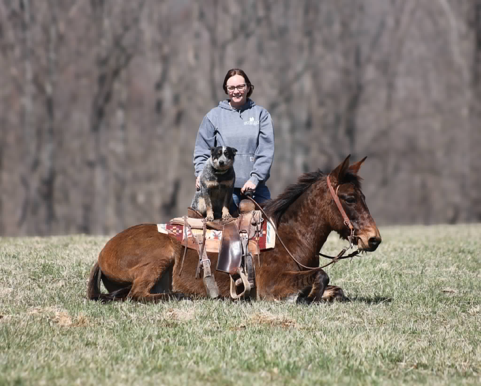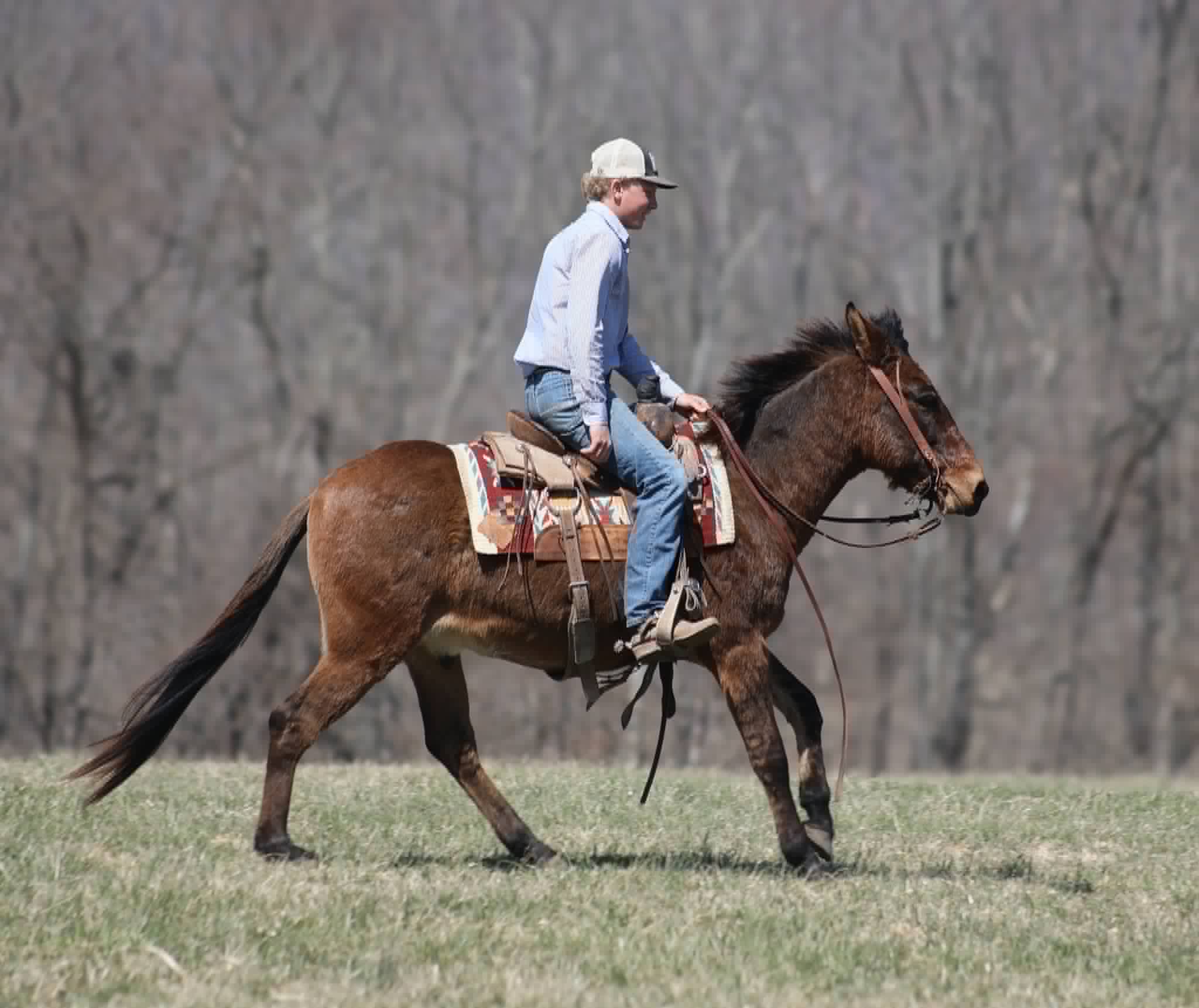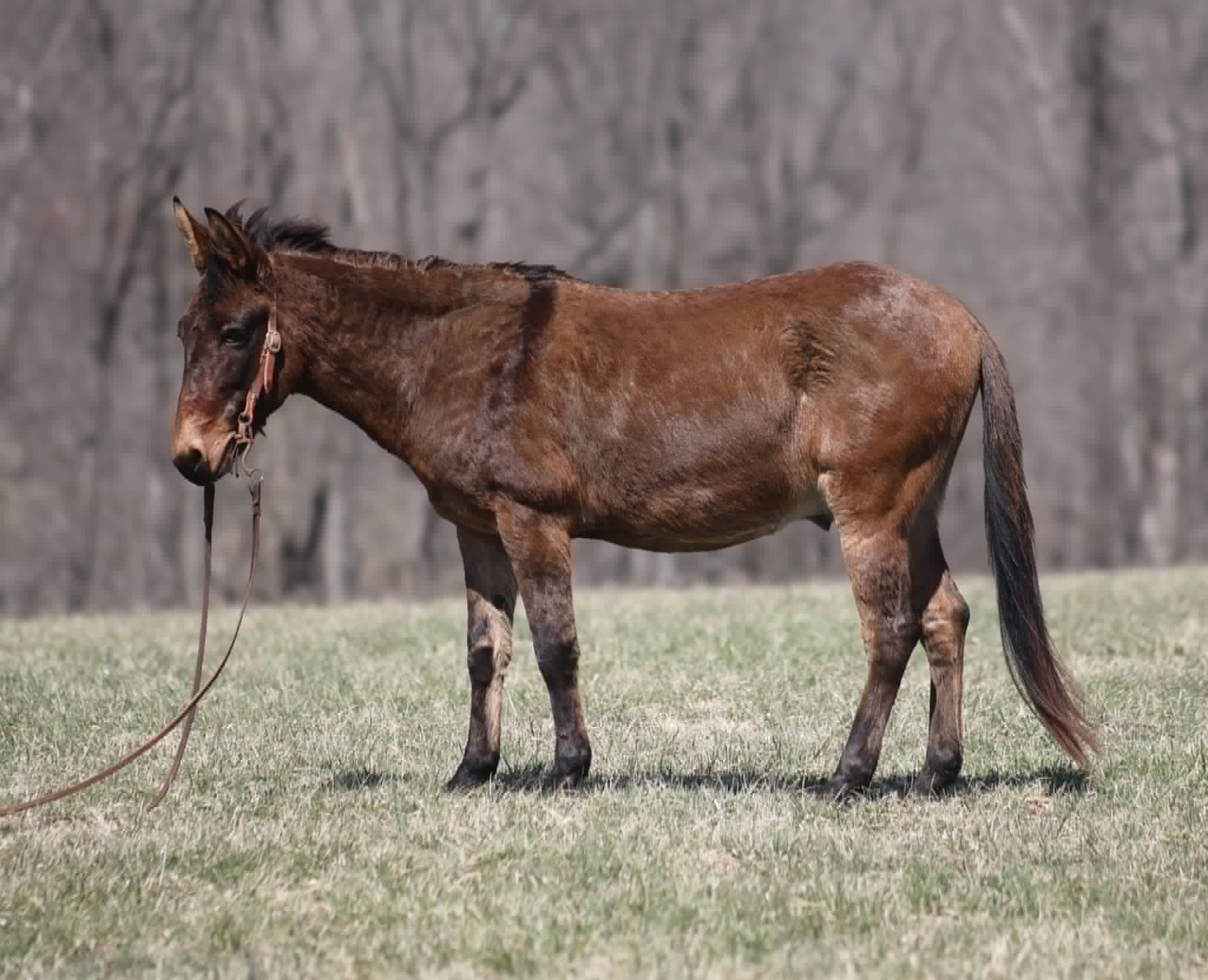 Parker is a 13.2H, very stout built, 9 year old, Dun John Mule with Tiger stripes on his legs and he is one LAID BACK dude!!! Parker is quiet and gentle. He is great on trails, he rides through rough rocky terrain, dead fall, thick brush, deep water, you name it and Parker will go on through it while being surefooted. He has been used to coon hunt off of after dark, he has leg dogs and had guns shot off of his back. Parker is 100% content to just plod along slow and easy down the trails and is totally safe for timid or beginning riders. He is a great mule to help build someone’s confidence! Parker is safe on the highways and has been ridden around cows. I have started teaching him to lay down. He is easy to tack up, no issues with his ears or with his feet. Parker has been a joy to have around and he is sure to be a joy for his new family. Located in Brodhead, KY. Contact Moore Trained Horses Logan 765-265-0033 with any questions or to make a buy it now offer.