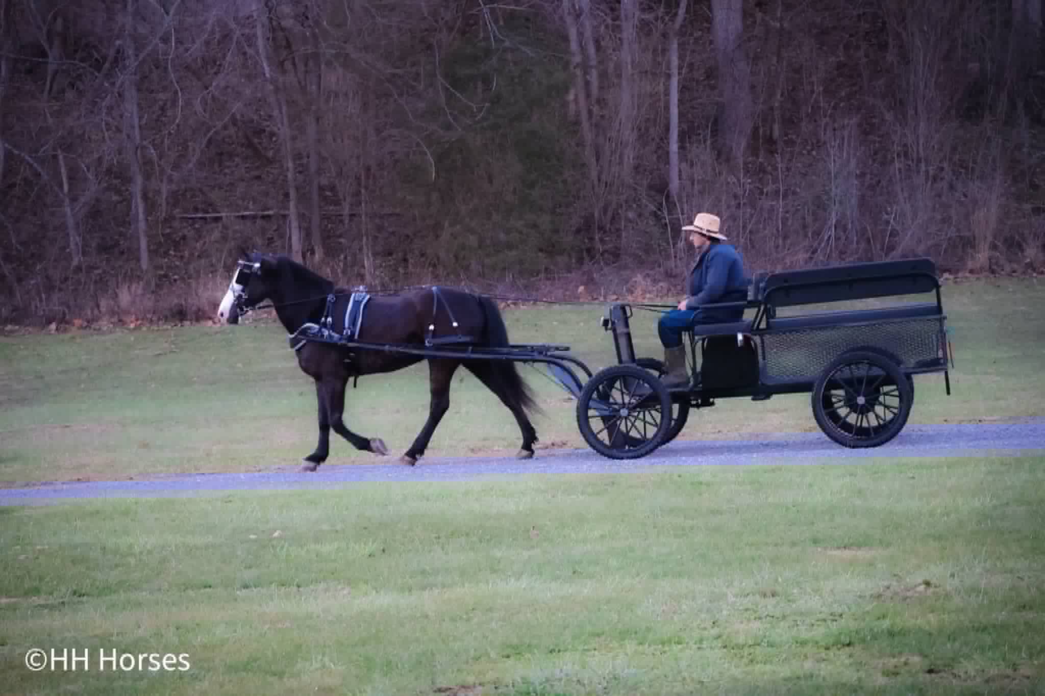 This is “PICASSO”, a very flashy BLACK MORGAN PAINT CROSSBRED GELDING that is broke to ride and drive. He stands 14.2 hands tall and is 5 years old. He is broke to farm machinery, he has pulled, carts, wagons, and sleighs. He is also broke to ride and will trail ride bravely anywhere you want to go. He is very stylish and a nice mover. He is extra fancy with a loud blaze face. He has lots of heart, stamina, and grit. He can go all day long and pull or carry a load. He has excellent ground manners, he stands to harness, hitch, tack, mount, and groom. He rides out alone bravely, he is traffic safe, and has had Amish children ride him to school and drive him to school. He has been driven on the main roads to town to the food store and will stand quietly to the buggy return. He is a very fun horse to ride that can ride in the pastures to check cattle and looks cool under English or Western tack in the arena. He is a very cute gelding with eye appeal, ride, drive, and sense. For more info or to make a Buy It Now offer contact HH Horses Erin 304-238-4155. Located in Flemingsburg, KY.
