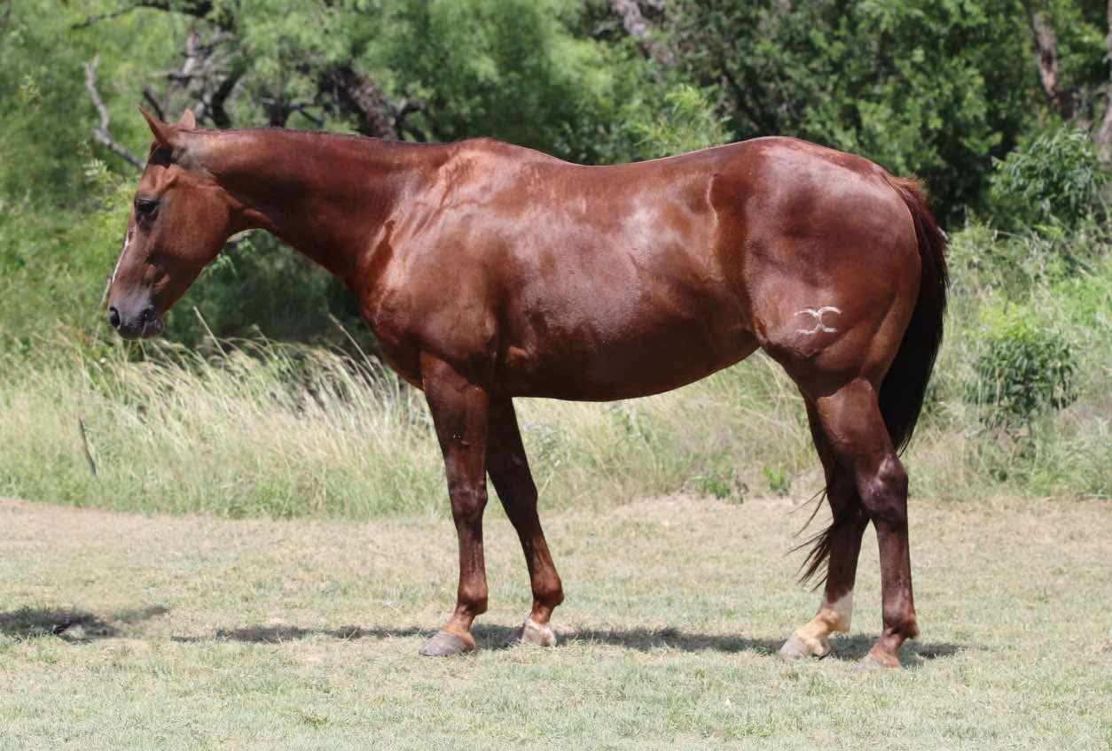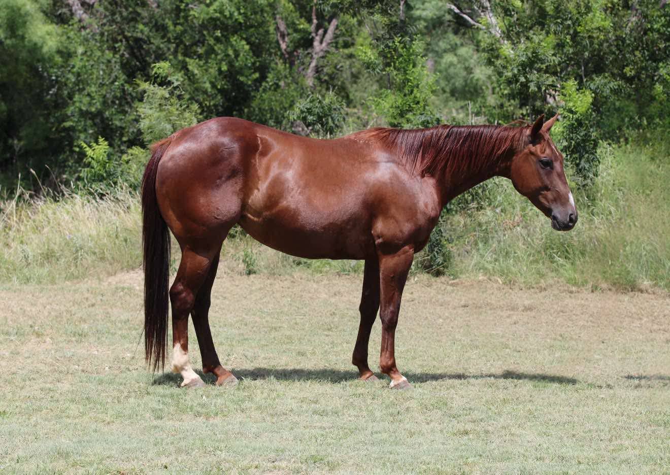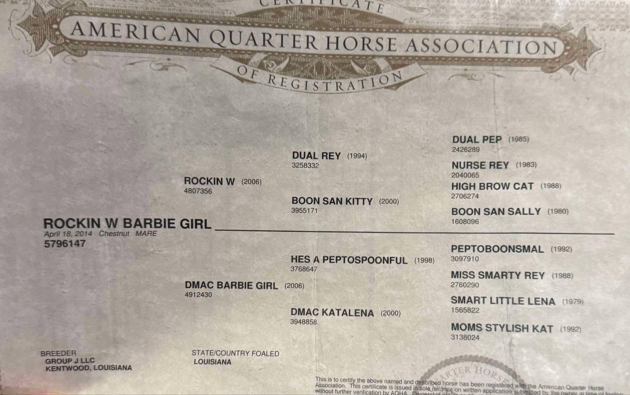 DAM: DMAC BARBIE GIRL (2006). A daughter of HES A PEPTOSPOONFUL, $72,851: top 10, NCHA Open Futurity; Suncoast Winter Cutting Non-Pro Derby Champion. A 2017 AQHA Top 10 Sire of Cutting Point-Earners; 2017 AQHA Top 25 Sire of Cowboy Events Point-Earners; A QData Top 25 All-Time Sire of Cutting Money-Earners. Sire of 432 money-earners, $8,017,772, earners of 2,763 AQHA points, including CHERRY CHEX DUALLY ($251,103: Abilene Spectacular Open Derby Champion), SPOONFULLA CAT ($247,426: finalist NCHA Open Futurity; NCHA Silver Award), SPOONFUL OF CHEERIOS ($238,267: 3rd NCHA Open Futurity), THE SILVER SPOON ($238,235: 4th NCHA Open Futurity), LITTLE SILVER BELLES ($201,763: Cotton Stakes Open Derby Champion), A SPOONFUL OF STYLE ($195,270: split 6th NCHA Non-Pro Classic/Challenge; NCHA Bronze Award), BOON SAN SPOON ($171,207: NCHA Open Classic/Challenge Champion), CROSSING RED RIVER ($158,608: NCHA $5,000 Novice Horse Non-Pro World Champion), DMAC SPICY SPOON ($156,149: 5th NCHA Open Super Stakes), HES A HEAPINSPOONFUL ($146,247: split 6th NCHA Super Stakes Non-Pro Classic), PLAYIN WITH A SPOON ($144,698: 6th NCHA Non-Pro Futurity), SPORK ($135,206: NCHA Non-Pro Super Stakes Reserve Champion), SHESA DIRTY MARTINI ($133,111: 3rd NCHA Open Super Stakes), SHES FUL OF DIAMONDS ($122,399: NRCHA Open Futurity Reserve Champion), PRF SPOONFUL OF GOLD ($111,465 and 70 AQHA points: NRCHA Open Derby Reserve Champion), ECHOS FROM THE PAST ($104,678: top 10 NCHA Open Derby), A COPPER SPOONFUL ($104,048: NCHA $50,000 Amateur Co-World Champion; NCHA Bronze Award