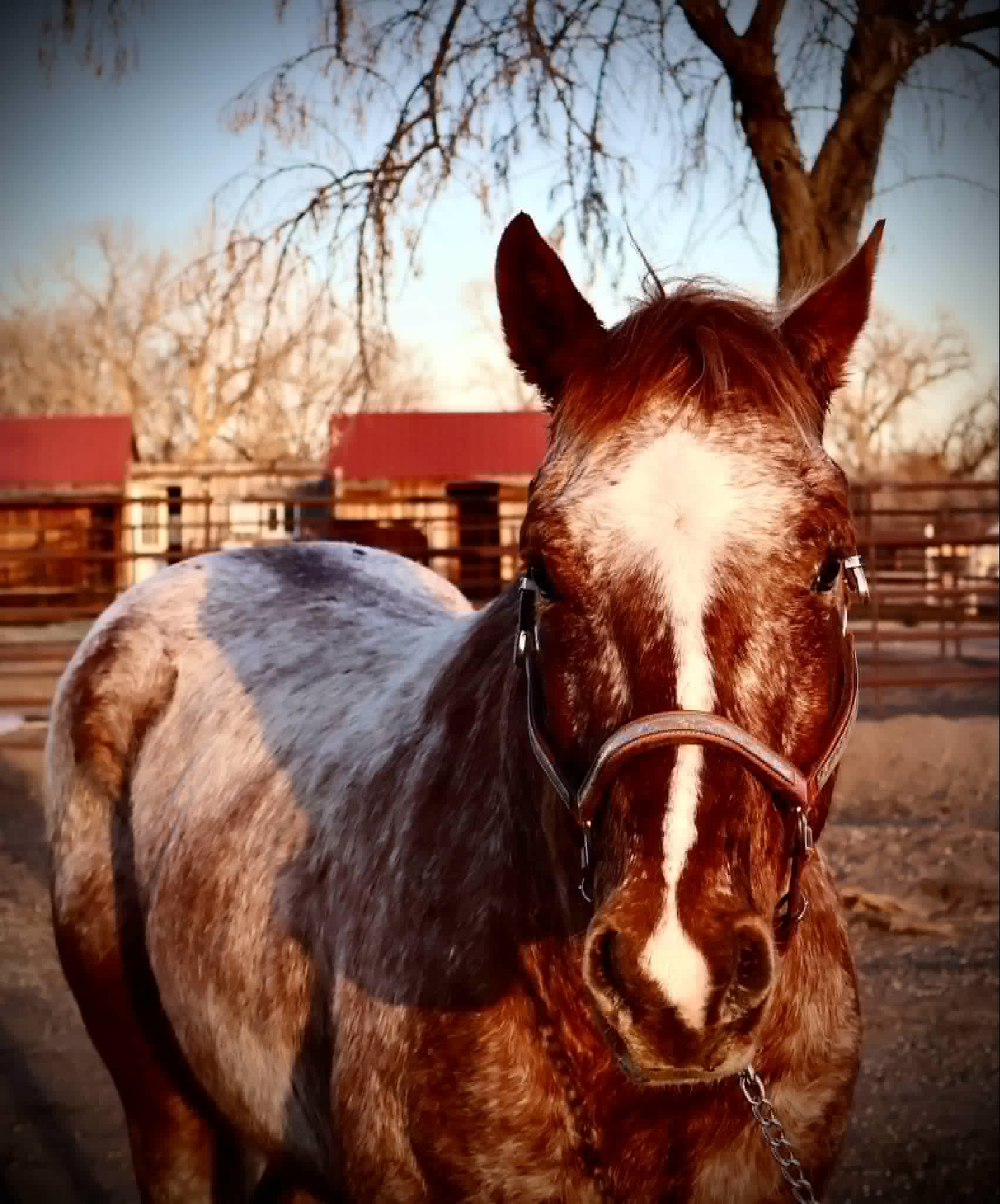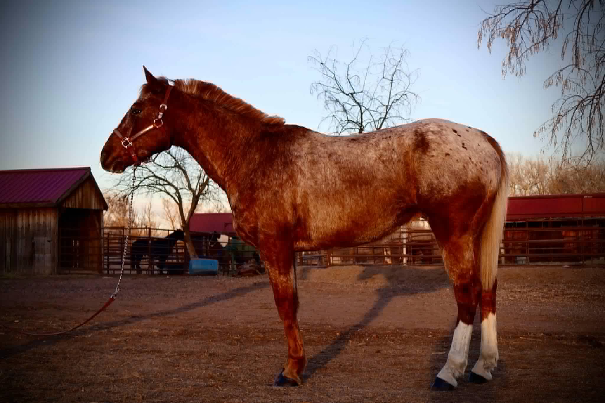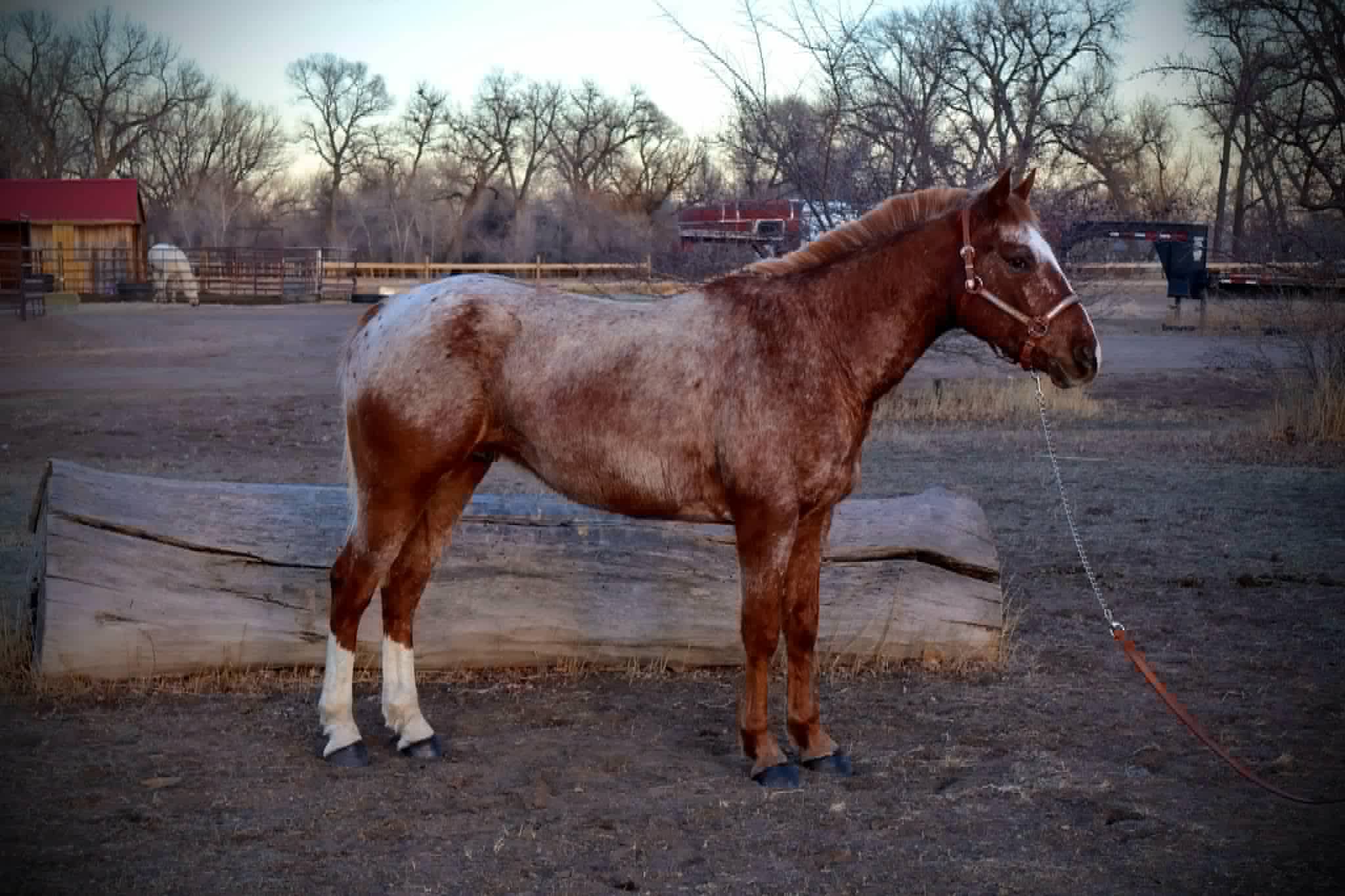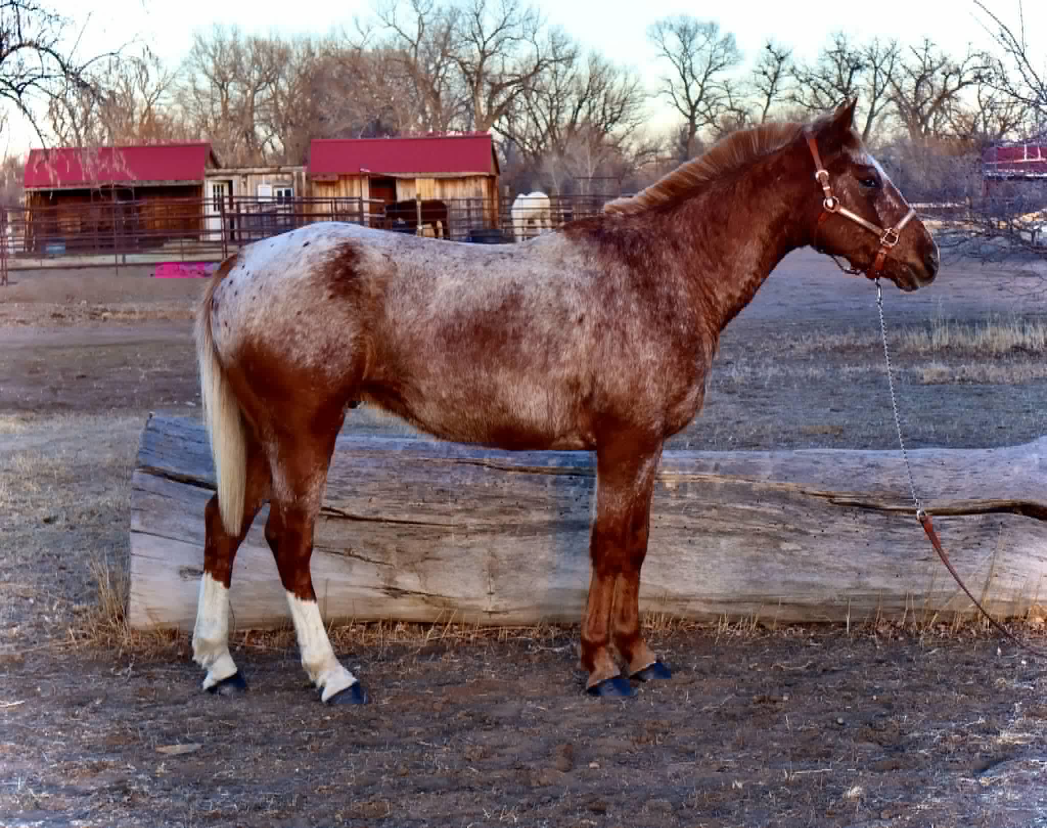 Simba is an absolutely stunning 14.2h, 6 year old red roan Appaloosa gelding with a HUGE heart and a ton of try! This gelding is absolutely genius, picks up on everything you teach him quickly and willingly, is extremely athletic and supple and is also safe for younger riders!! Simba knows how to “pick you up” at the block, knows how to bow and lay down on command, is working on the smile and absolutely loves people and other horses! Simba has a nice walk/jog/lope, a quick stop and rollback, knows how to collect up and hold himself and knows how to sit down off of just your voice and seat! Simba is also a trail wiz! He absolutely loves being out and about whether it’s with a group of horses or by himself, He is trustworthy and reliable every adventure. Simba has been ridden right next to highways and busy streets with not a care in the world, he’s been by bikes, trains, runners, and all of the hectic town life! We have taken Simba to the drive through, straight through downtown Fort Collins and even up onto some rugged mountain terrain! On top of Simbas arena and trail prowess he also has really loved his time in an English saddle, he is started over fences and has been hauled to a couple different cross country courses! Simba has a lot of try and really enjoys learning new things. Whether you’re wanting to go out and ranch on him, take him through town or pack up into the mountains, Simba is up for the adventure! Located in Fort Collins, CO. Contact Dynamite Horses Thea 970-632-3644 with any questions.