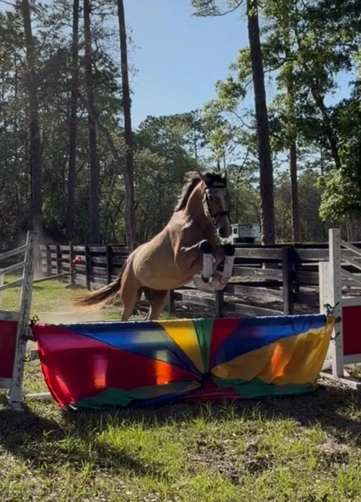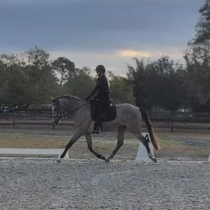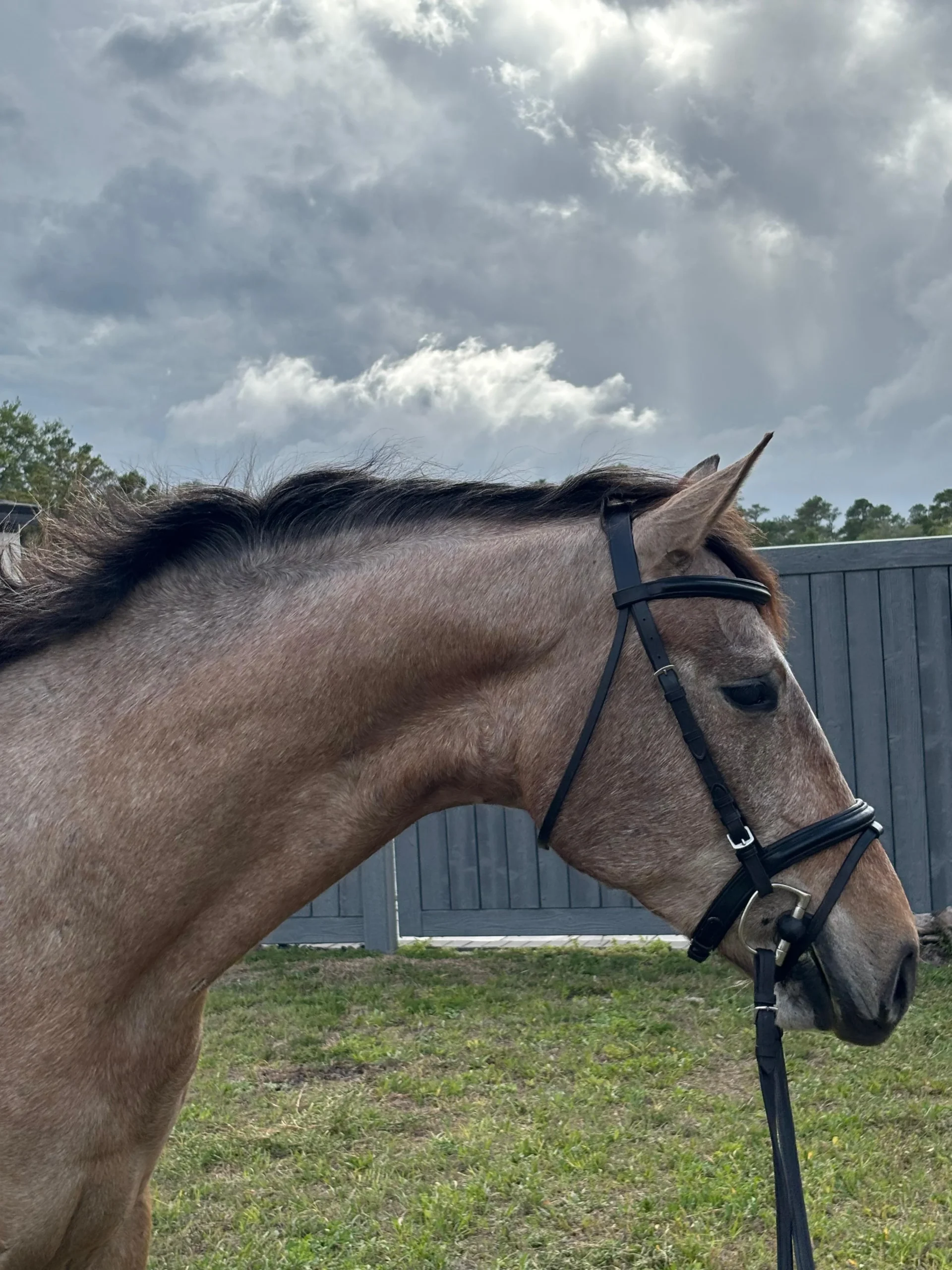 “Theo” is a 2022 Hanoverian x PRE standing currently at 15.3 hands, breeder expects he will to mature at 16.2 hands. He is Grey (born bay will grey out like sire) registered Oldenburg with German Pink papers by Tomillo VII (GrandPrix PRE) out of a Bugatti Hilltop x Londontime mare (HANN) bred for FEI. He has been in professional dressage training since January 2026 with an gold medalist FEI trainer and currently schools 1st level with introductions to some 2nd level concepts, also shows talent, desire, and good technique for jumping and could make a fun eventing prospect due to his bold personality. Theo is energetic, light to the aids, sensitive, and has a soft mouth. When on the aids he is a lovely ride and has naturally comfortable gaits, but he will test the rider from time to time so at this time due to his age (4yr old) and experience he needs a confident, experienced rider with an independent seat and hands. He also prefers a varied program and can become bored and sour with too much repetition. No prep to ride – just tack up and hop on! He is currently barefoot and happy to be turned out alone or with other horses.