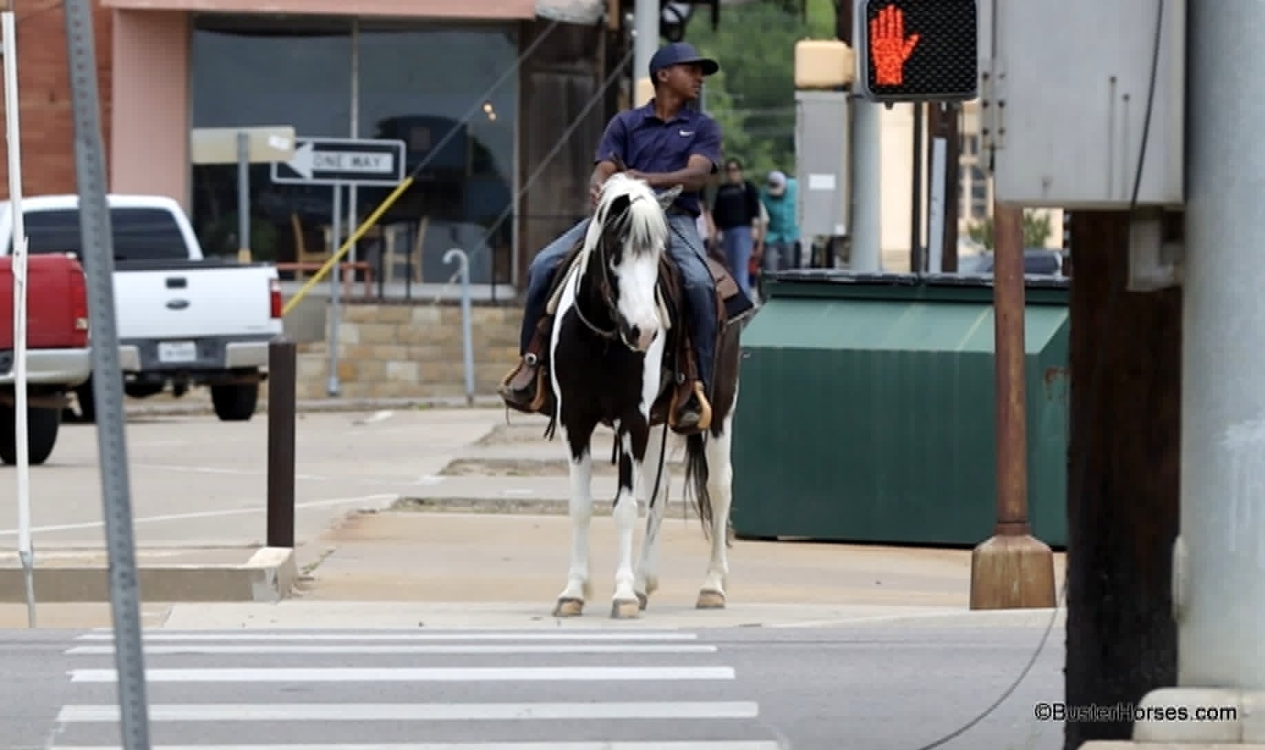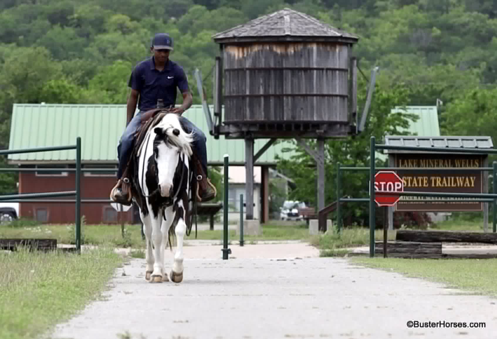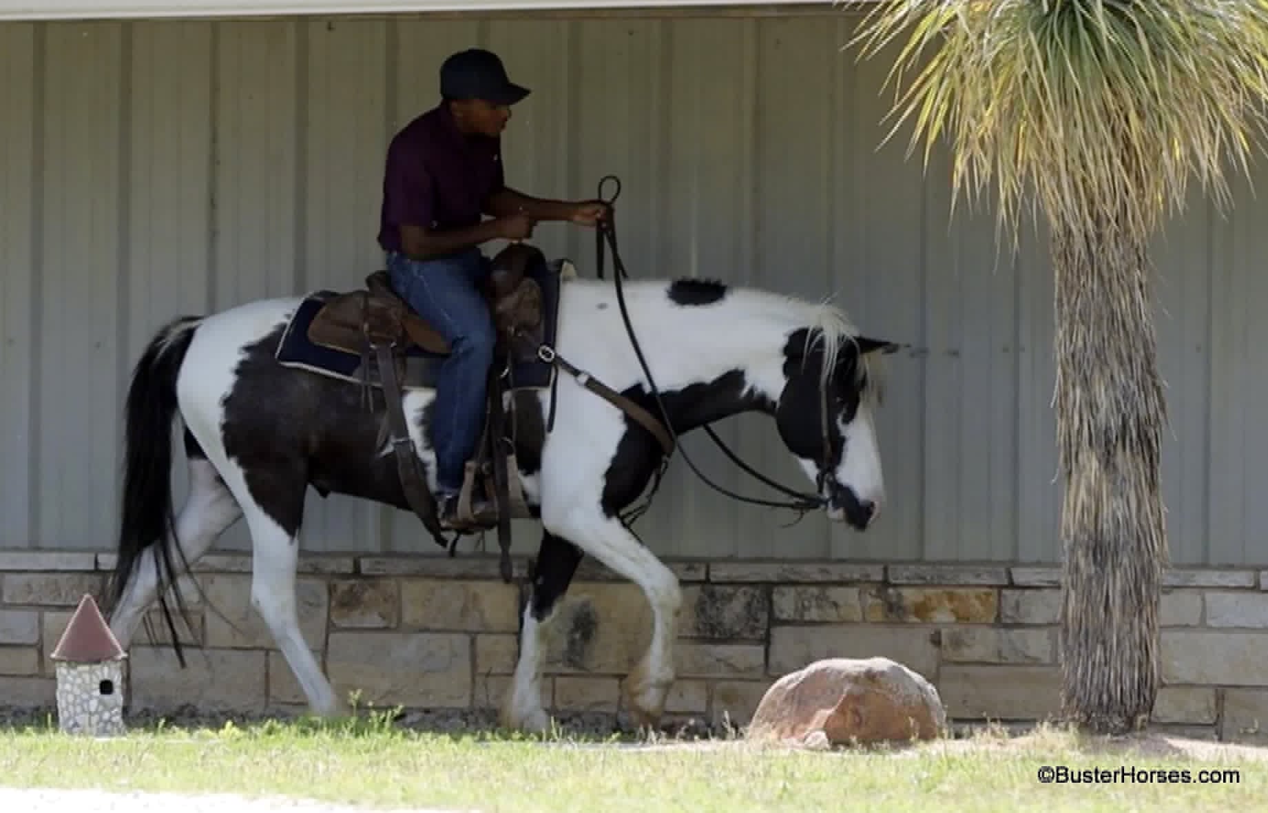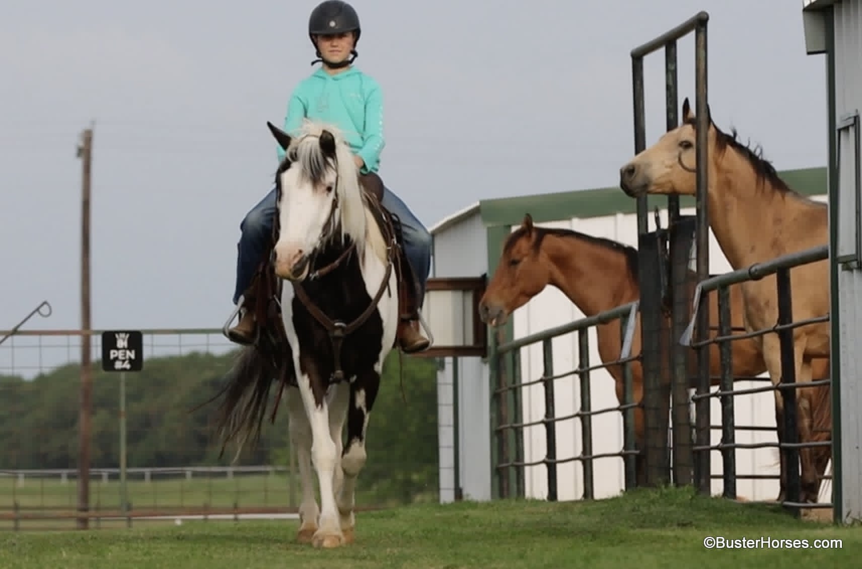If you are looking for a flashy, fun, no-nonsense, sweet, just point-and-go have a good time trail riding companion… then Tonto is your man!!! He is at the perfect age at only 7 years old, he has already been around and seen lots of things, been hauled, been on lots of rides, been in lots of parades … but he is only 7 and still has his whole lifetime in front of him! This sweet little gelding is great-natured, kind, and so extremely simple and uncomplicated to ride. He is as smooth as they come and suitable for just about any level of rider. If you are sitting on him, you feel extremely secure. He is so naturally smooth moving in all of his gaits, that you would have to practically just pick up and bail off of the side of him to be able to come off of this one!!! He is naturally low-headed and will travel on a relaxed rein and neck rein around – but, you can also pick him up and ride with a lot of contact, and he will tolerate just about anything with new rider’s bumbling around being all over on him, in his face, and in his mouth. He has an adorable personality and loves to be around people. He drops his head for the halter or the bridle to be put on, and will stand there relaxed and patient if you have to fumble around and get organized. He could care less about other horses and never knickers or calls back to the barn, super good about leaving the barn and going out alone. He hauls like a perfect gentleman. If you often ride out alone, then this is the one for you. He is great anywhere in the group and has a huge big ground covering almost running walk to him if you push him and ask for it. He is a unique cross that could ride with the regular horses and also keep up with the gaited horses! He loves the water and does not hesitate to cross the creek or go into the pond, he is sure-footed and handles up and down terrain, creek beds, banks, Rocky areas, and thick wooded trees. He pays attention and navigates where he is going. He is great to catch, bridle, saddle, groom, bathe quiet for the vet and the farrier, and just an all-around gentleman! Everybody here adores this sweet horse, he will be with his next partner for a long time! Please do not hesitate to give us a call if you have any questions about him! Ashely at Buster Horses 214-605-7174 Tonto is shod all the way around and is ready to hit any trails that you put in front of him, his feet were just reset last week. Prior to being shod, he was barefoot for quite a while, he has really great feet, and could easily go barefoot again if you were just riding around your place locally. His teeth were just done by our equine dentist last month, and he also had his sheath cleaned, his ears preemptively treated for ticks, and was dewormed at that time. He will arrive to his new owner up to date on everything and ready to go. He is in great shape and in good health. Watch his video, and to see additional videos, go to our website: BusterHorses.com or our Facebook page: Buster Horses Tonto is located in Weatherford, TX – one hour from Dallas / Fort Worth International Airport. He is an easy day trip, or fun overnight trip to come and try out, from anywhere! We are experienced, knowledgeable sellers, and we can help with quickly arranging affordable shipping to any buyer’s location – we have experience shipping worldwide – including regularly to Hawaii, Canada, Mexico, Europe, and South Africa. Check our website for buyer reviews, more videos of Tonto, additional info, etc: BusterHorses.com/Tonto-Paint-Gelding