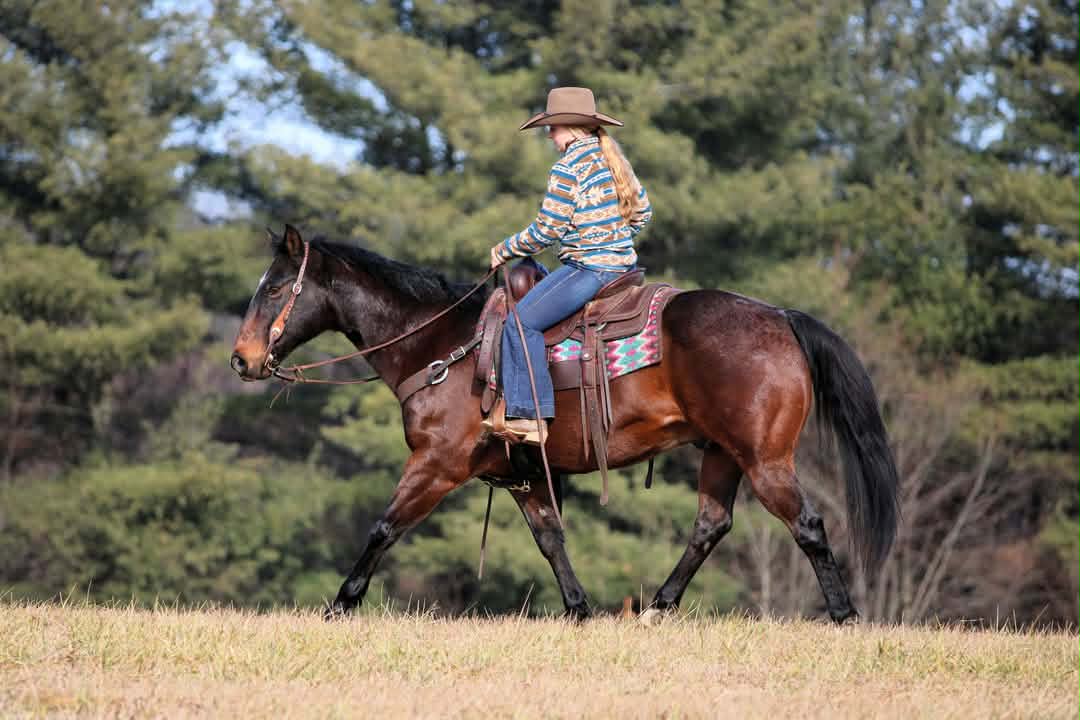 Under saddle, Wiley rides nicely in the arena and understands his job. He neck reins correctly, walks, trots, and lopes willingly, and maintains good circles at all gaits. He rides off leg and seat cues and is not heavy in the bridle. Wiley has a smooth, comfortable way of going and stays quiet and consistent, making him suitable for a variety of riders.