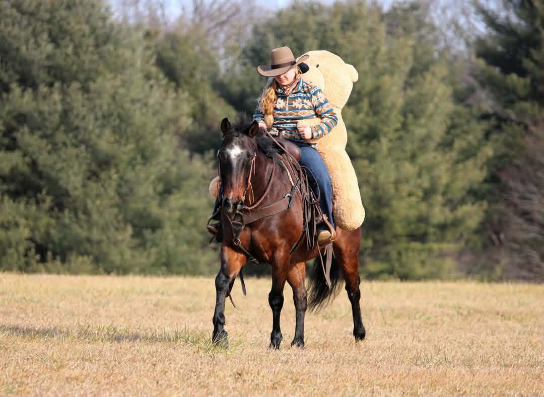 Outside of the arena, Wiley is a dependable trail horse. He rides confidently through tough and uneven terrain and is very sure footed. He has been ridden around dogs, goats, and farm equipment and handles new environments well without getting bothered. He is happy riding out alone or with other horses and remains level headed in different situations.